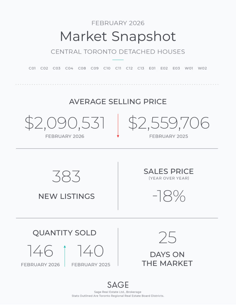 Last year, in February 2025, Toronto MLS® reported 140 freehold detached home sales across Toronto – which is a 4% decrease in volume for this year. It was also reported that on average, freehold detached homes sold for $2,559,706 in February 2025 – and that’s an 18% decrease in sale prices for this February.