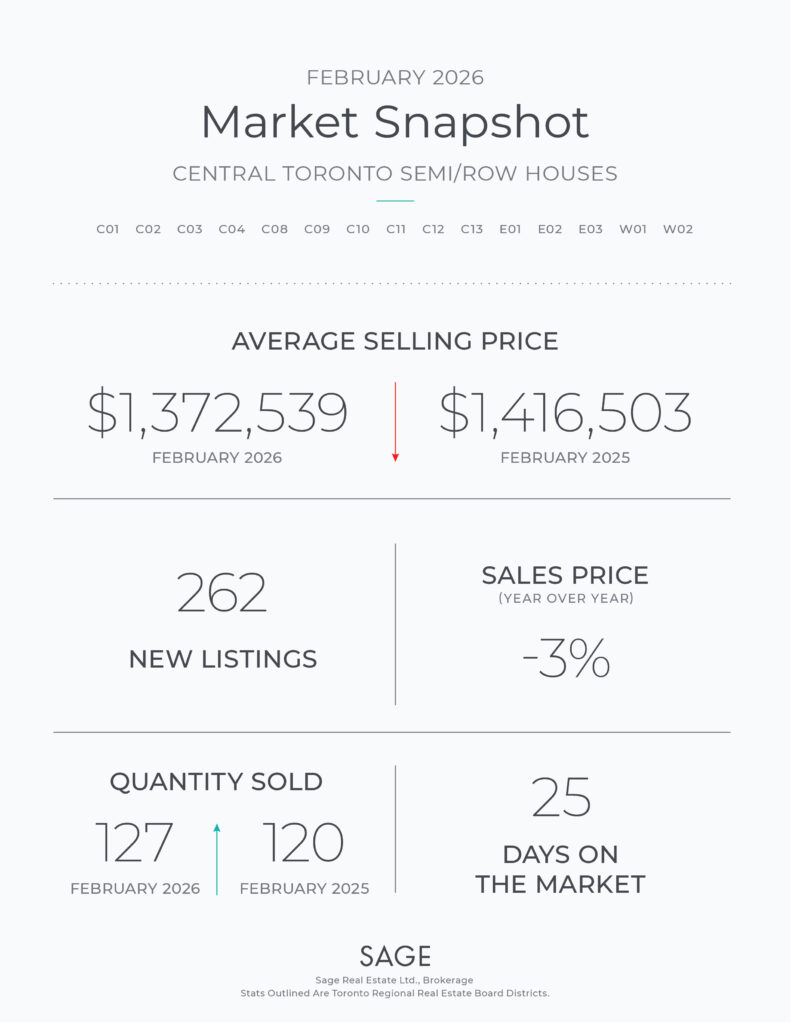 With respect to semi-detached homes… Central Toronto REALTORS® reported 127 semi-detached home sales in February 2026; and on average, these semi-detached homes sold for $1,372,539 last month.