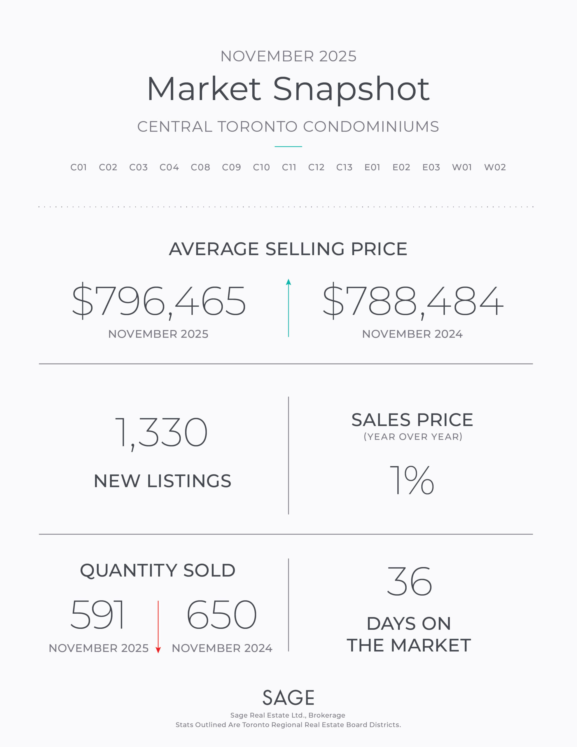 With respect to condo sales, Central Toronto REALTORS® reported 591 condo sales in November 2025; and on average, these condos sold for $796,465 last month.