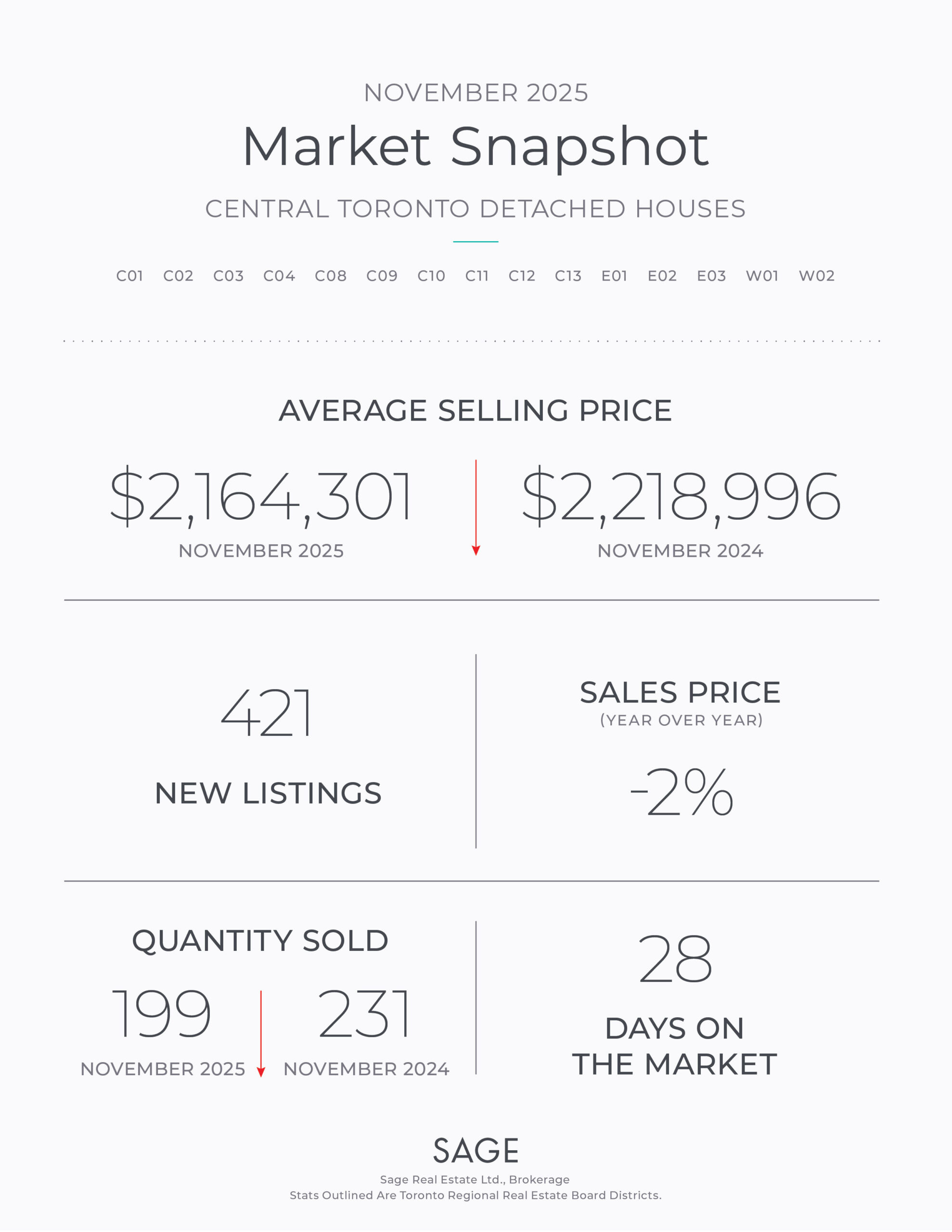 Central Toronto REALTORS® reported 199 detached home sales through the Toronto MLS® in November 2025; and on average, these detached homes sold for $2,164,301.