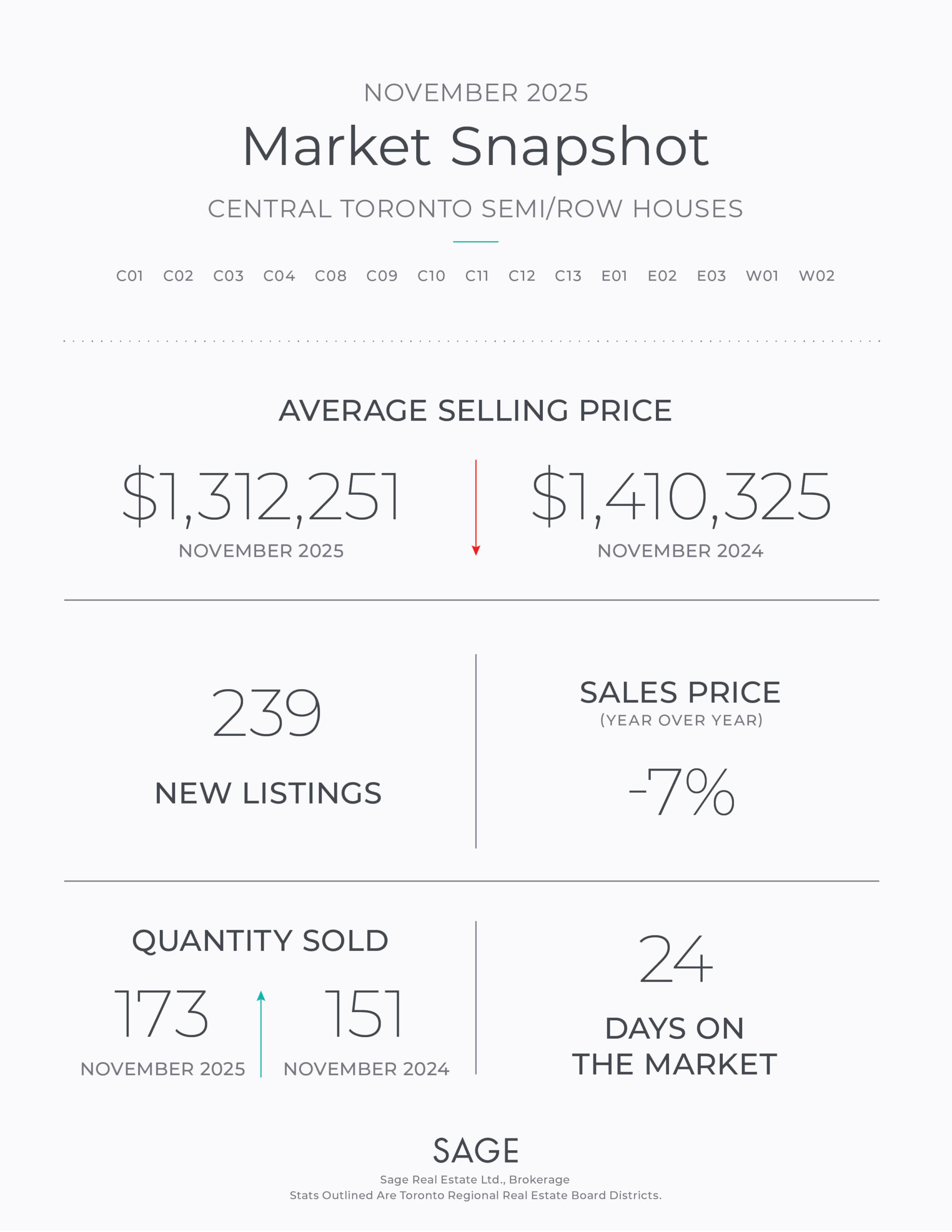 With respect to semi-detached homes… Central Toronto REALTORS® reported 173 semi-detached home sales in November 2025; and on average, these semi-detached homes sold for $1,312,251 last month.