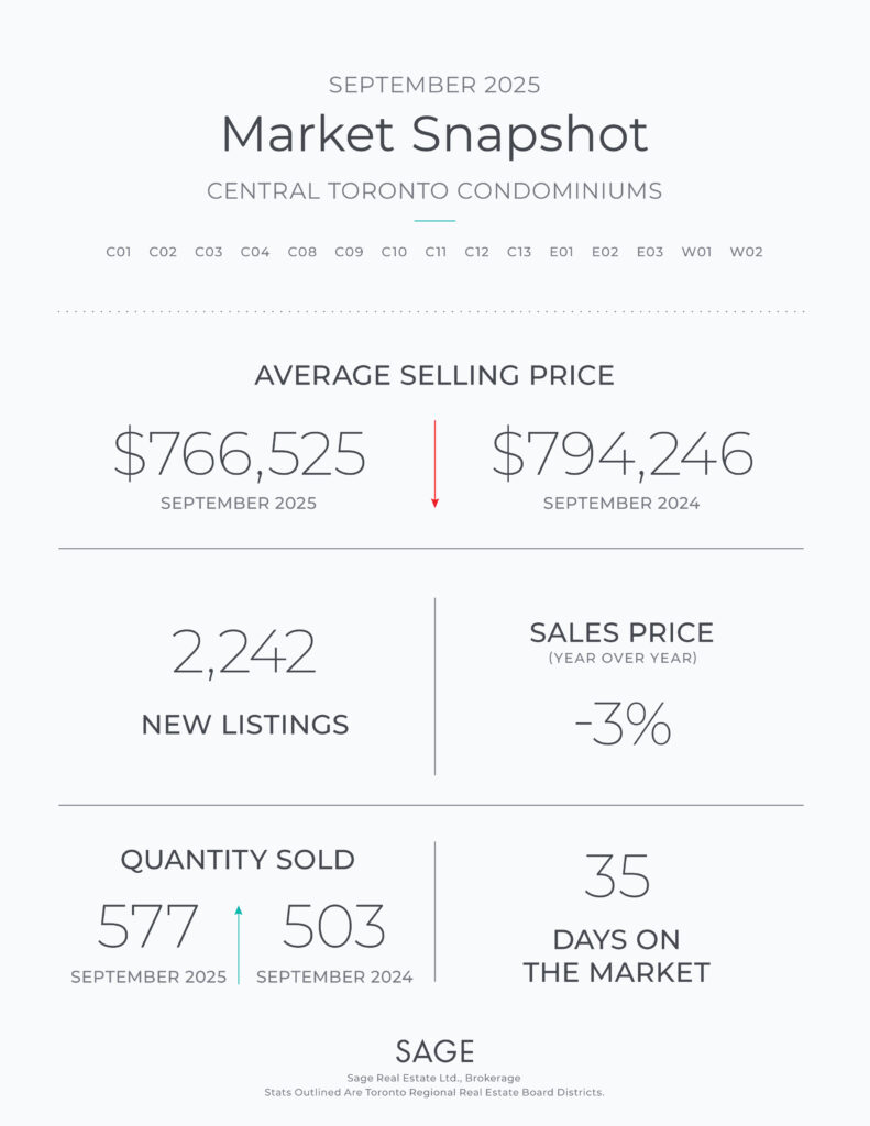With respect to condo sales, Central Toronto REALTORS® reported 577 condo sales in September 2025; and on average, these condos sold for $766,525 last month.