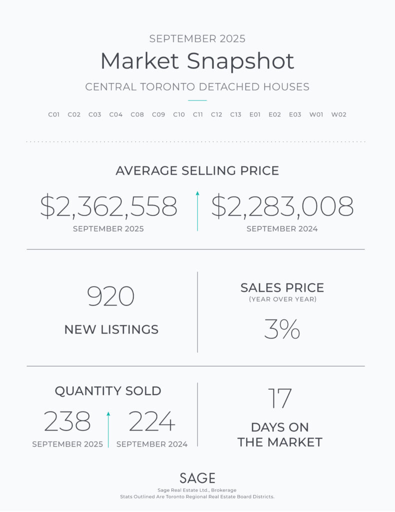 Central Toronto REALTORS® reported 238 detached home sales through the Toronto MLS® in September 2025; and on average, these detached homes sold for $2,362,558.