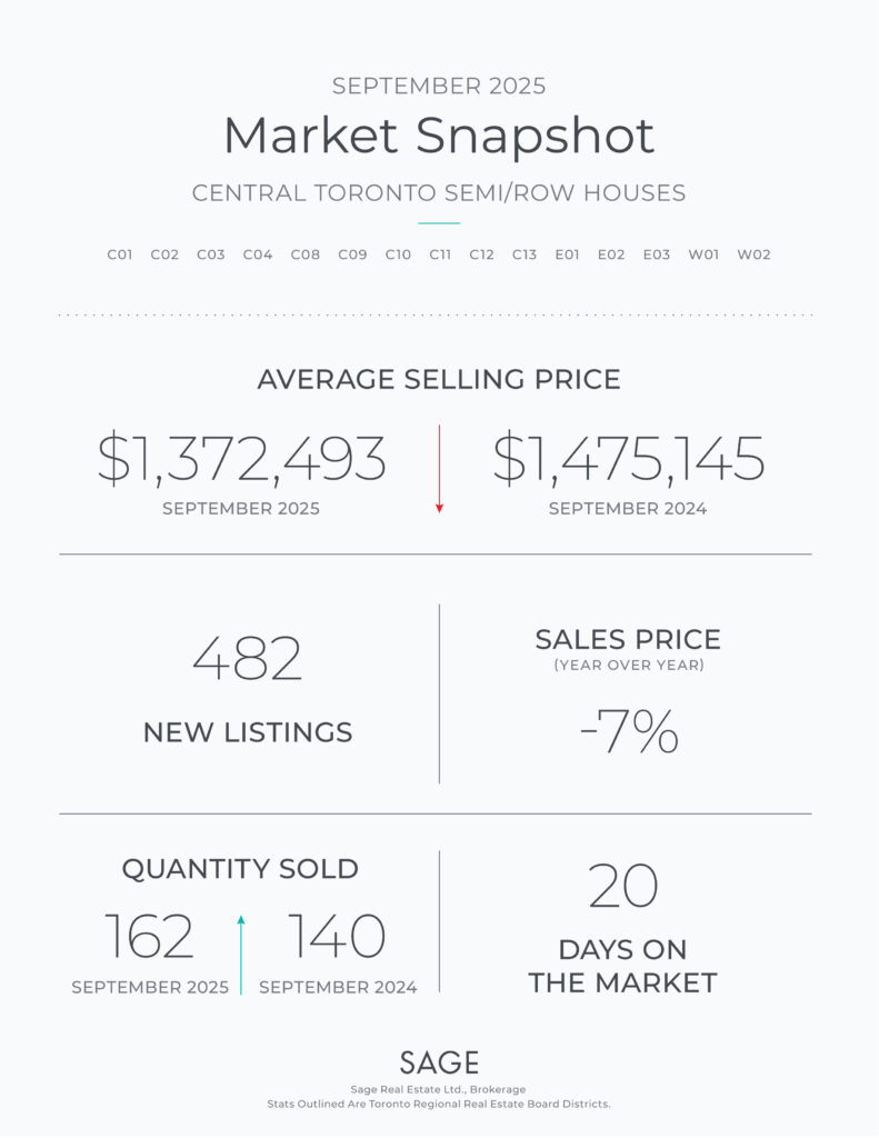With respect to semi-detached homes… Central Toronto REALTORS® reported 162 semi-detached home sales in September 2025; and on average, these semi-detached homes sold for $1,372,493 last month.