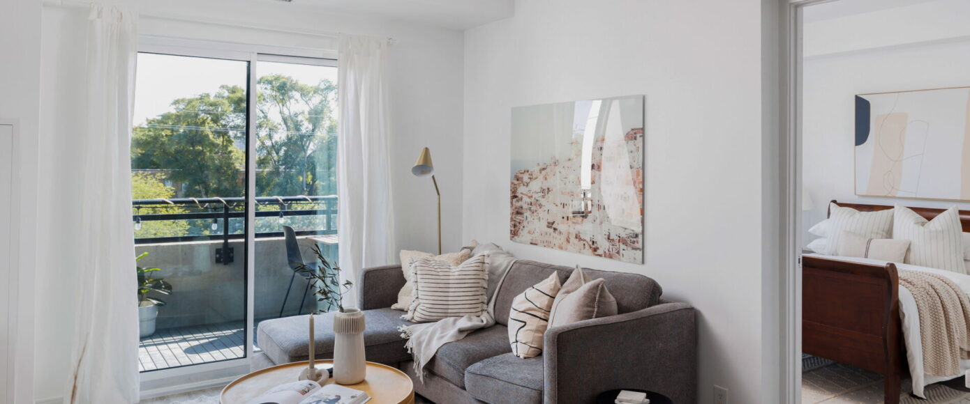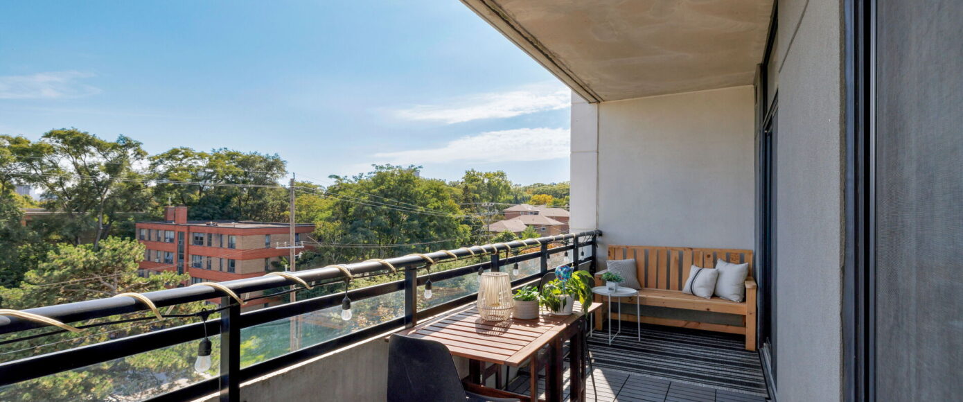 This east-facing 2-bedroom, 2-bathroom suite at The Humberside Condos offers 864 square feet of thoughtfully designed living, complete with an open view and a private 100-square-foot patio-style balcony that perfectly captures the morning sun.