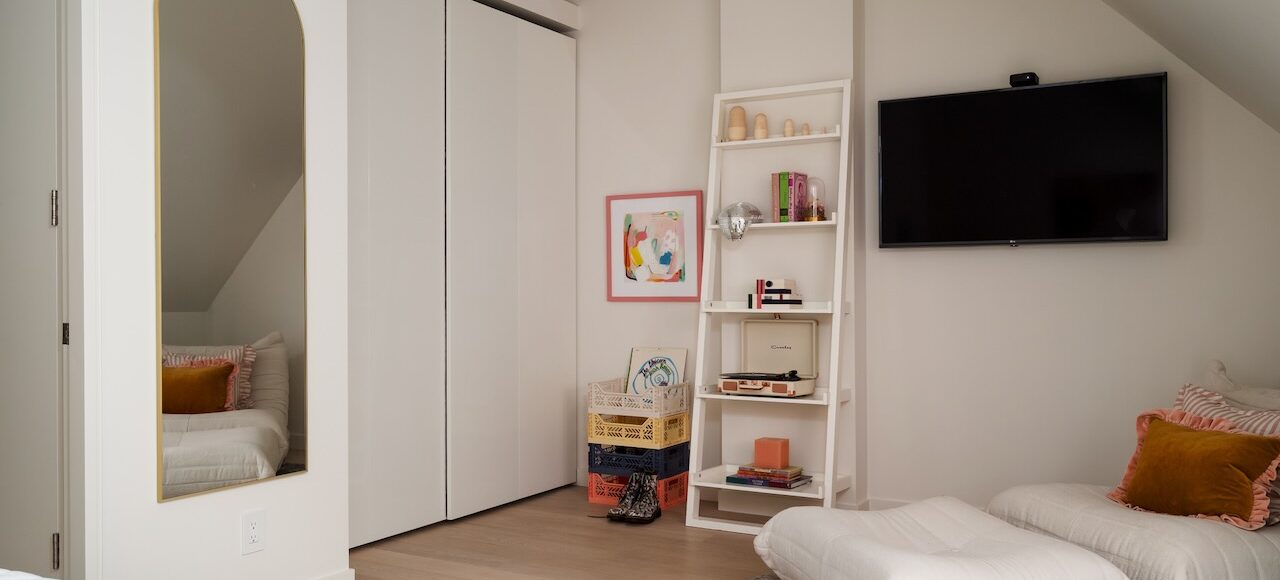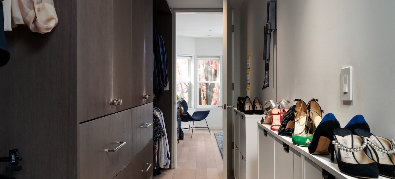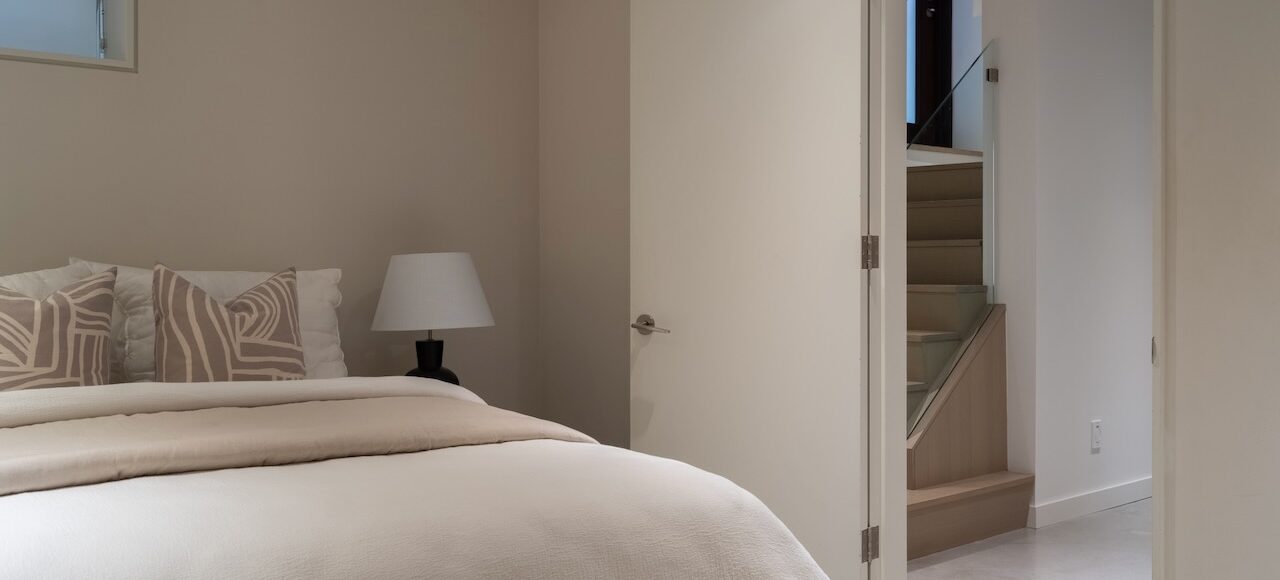 The second floor is a dedicated primary suite, wrapped in calm and light. A custom walk-in/walk through closet, spa-worthy ensuite with reflective glass curtain wall, and automated blinds create a space that feels both private and indulgent. The third floor is perfectly designed for kids (or guests) with two equal-sized bedrooms — no arguments here — connected by a stylish shared bath complete with heated flooring.