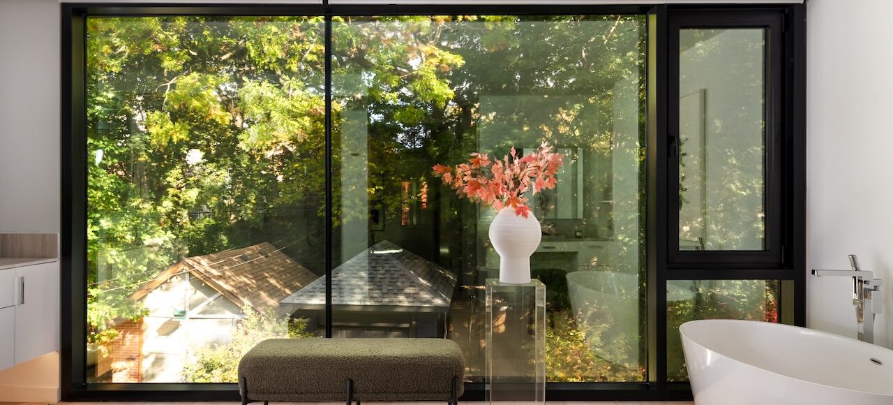 - The exterior glass of the Tilto curtain wall (with tilt turn function) in the ensuite bath was finished in solarcool grey reflective film. The reflective film means no one can see in during the day and we have the automated blinds for privacy in the evenings.