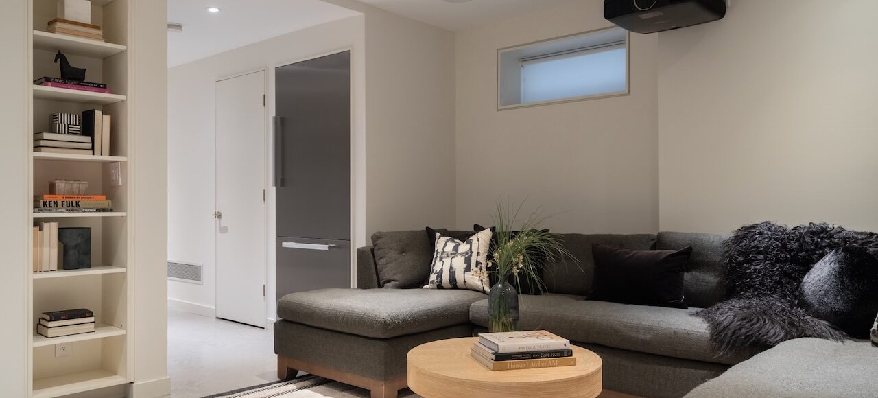 - The radiant heating in the basement transforms the screening room into a cozy retreat during winter and a refreshing haven in the heat of summer.