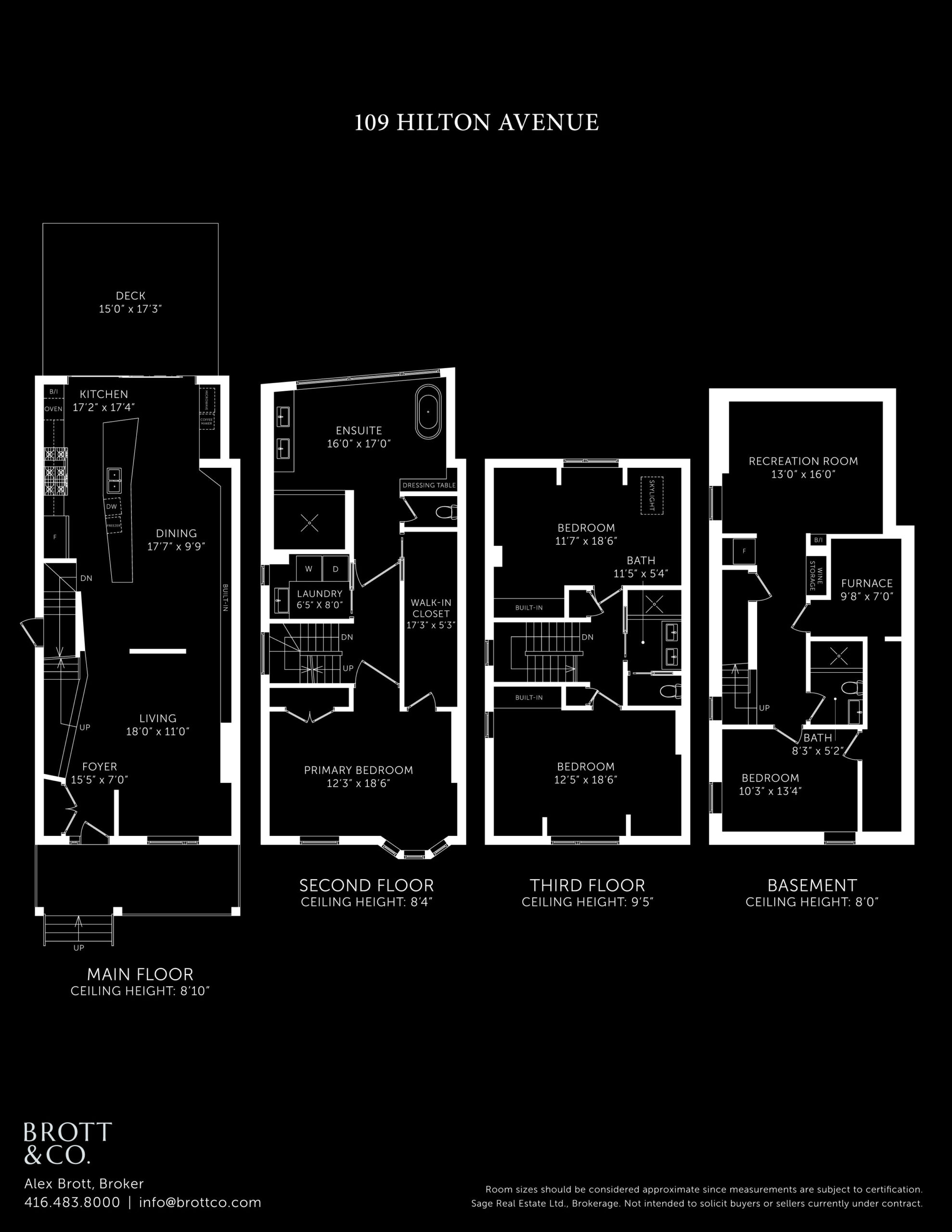 Inclusions | Main floor – Miele kitchen suite including integrated Miele single door fridge & single door freezer, 48″ 6 burner range and griddle, double convection wall oven, combination steam oven, built-in coffee machine with warming drawer, “Diamond” dishwasher. Jennair – double fridge drawers with ice maker. Industrial range hood. Basement – stainless steel bottom fridge/freezer and side by side wine fridges. Whirlpool washer & dryer. Light fixtures in dining room, pendants above kitchen island, hanging pendant above third floor stairs, window coverings, TV wall mounts (living room, primary and 3rd floor bedrooms).