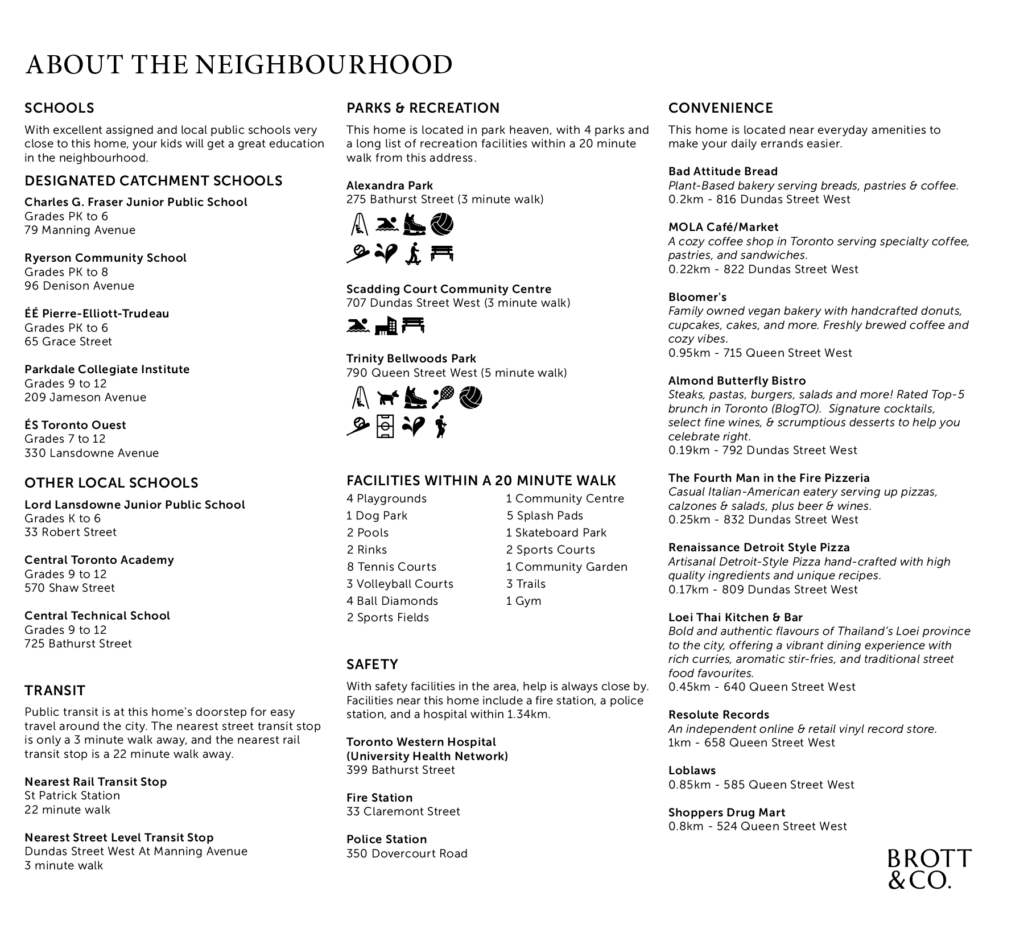 - Walking distance to transit on Queen, Dundas and Bathurst.