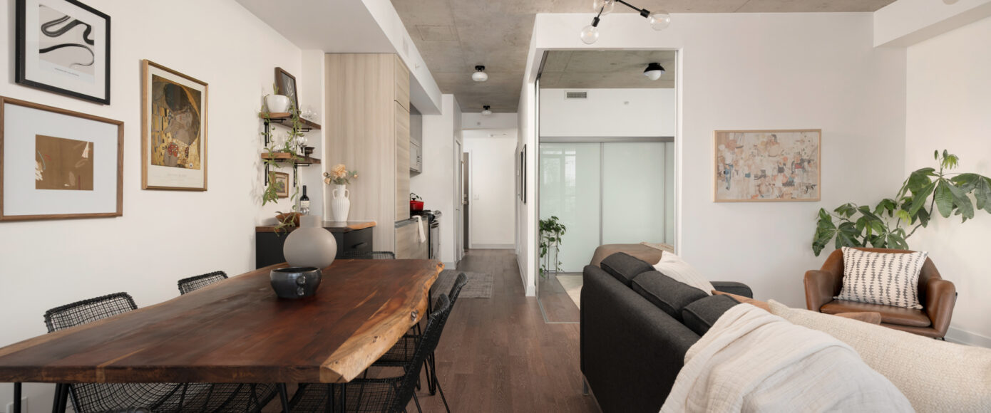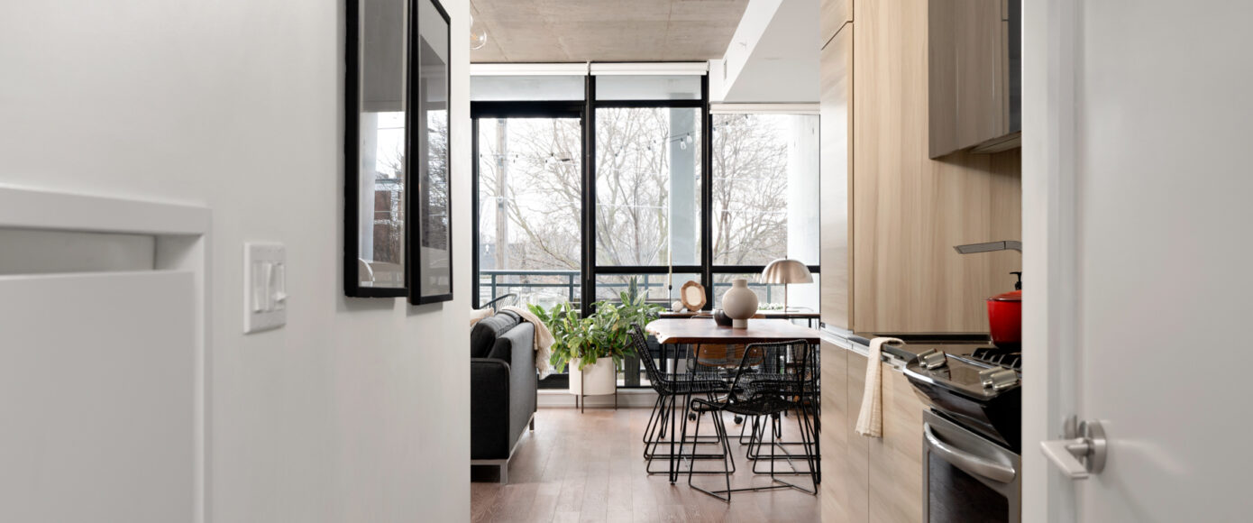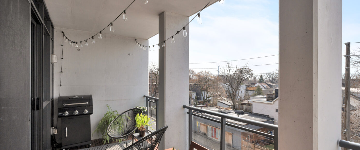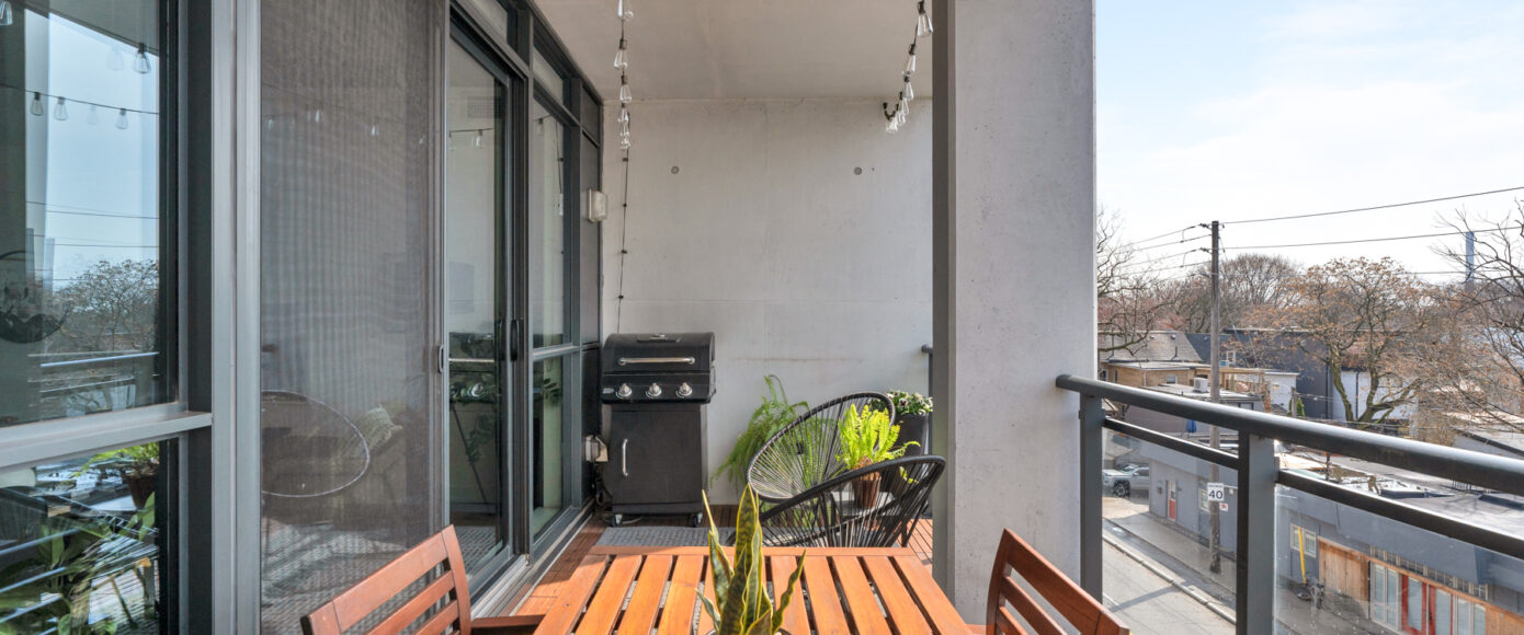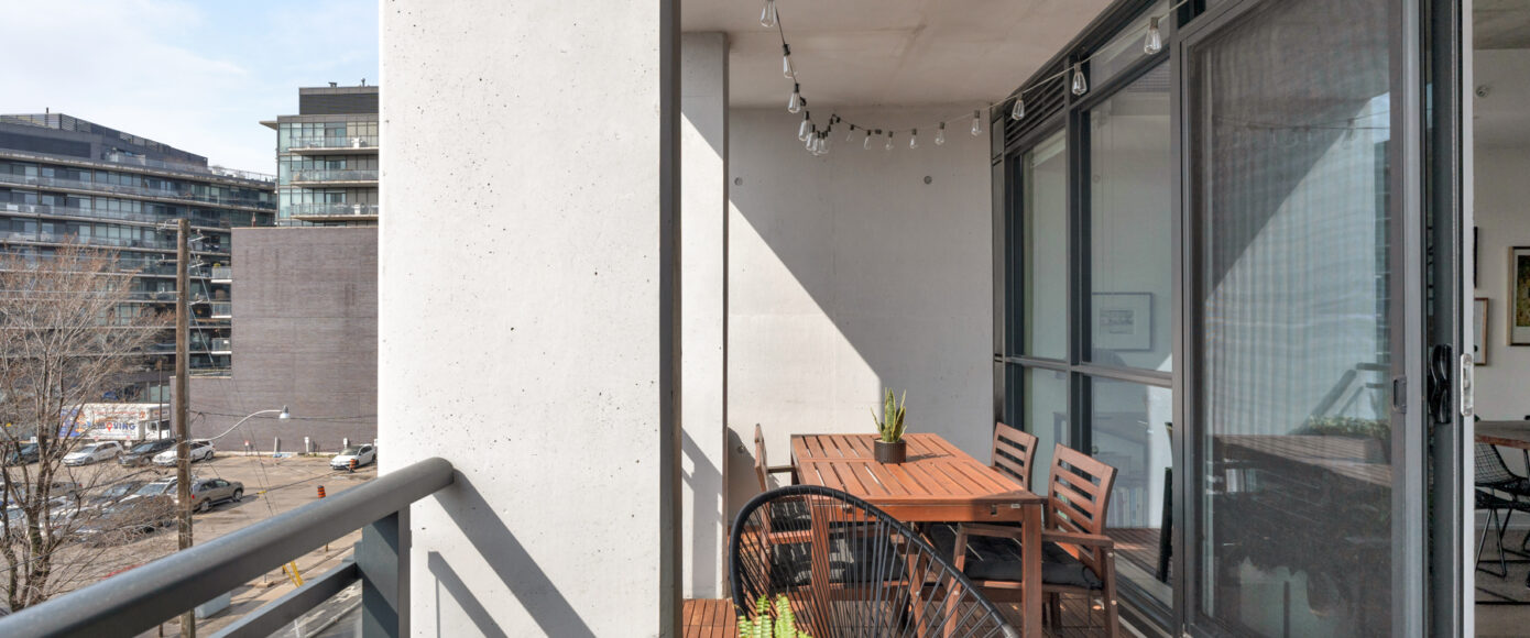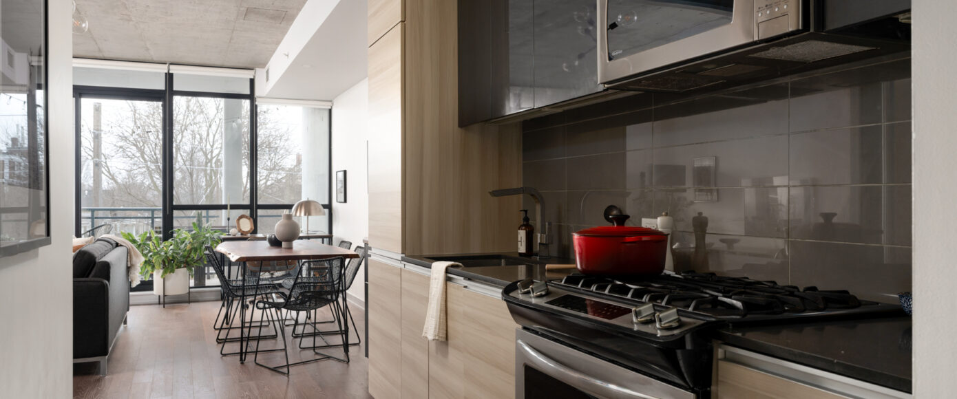 Stylish without being pretentious, Leslieville feels like the sound of a bright saxophone under a lamppost. In the boutique Taylor Lofts, this 2 bedroom 2 bathroom split-layout is wide and well proportioned. Say goodbye to the narrow floor plan, Suite #403 has 9-ft high exposed concrete ceilings and large windows across the back offering plenty of natural light. A cold craft beer, a good book, and your feet up out on that roomy balcony, equipped with a gas hookup for the self-proclaimed grillmaster, your friends will have serious ‘end of day’ envy. That’s pretty rare, but it doesn’t stop there, as it also comes with a full-sized gas range stove and ensuite bathroom in the primary bedroom, notably large enough for a Queen! The open concept living / dining room is a breathable space you’ll spend most of your time.