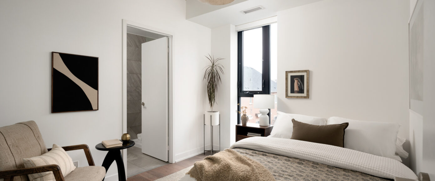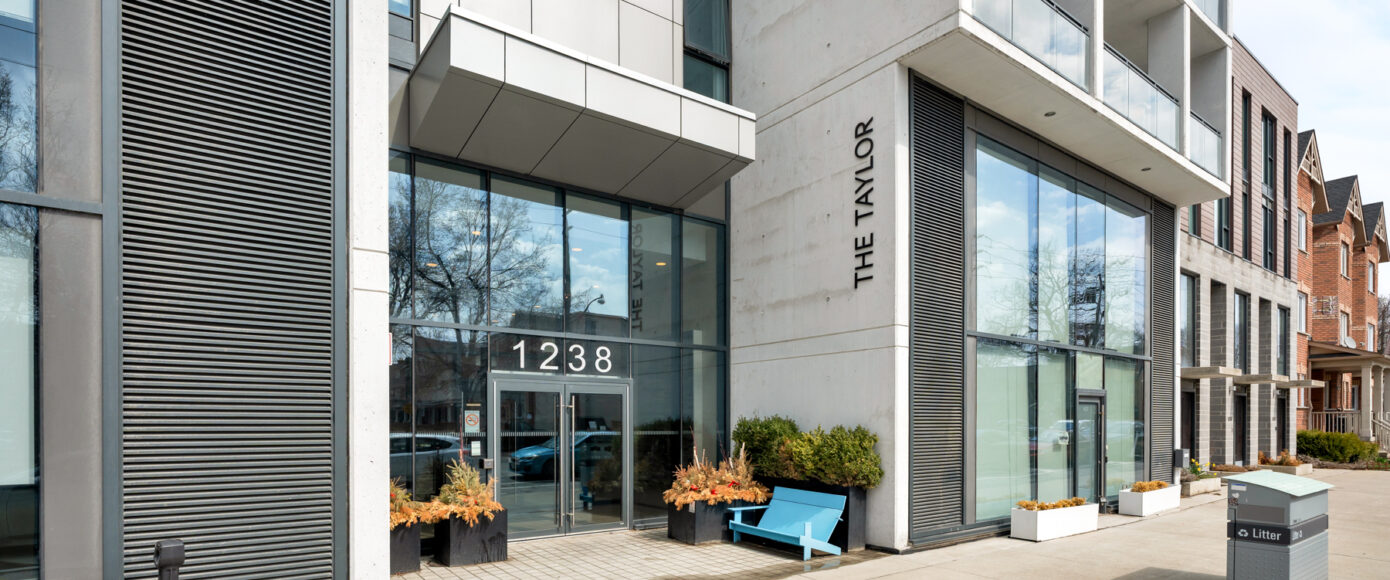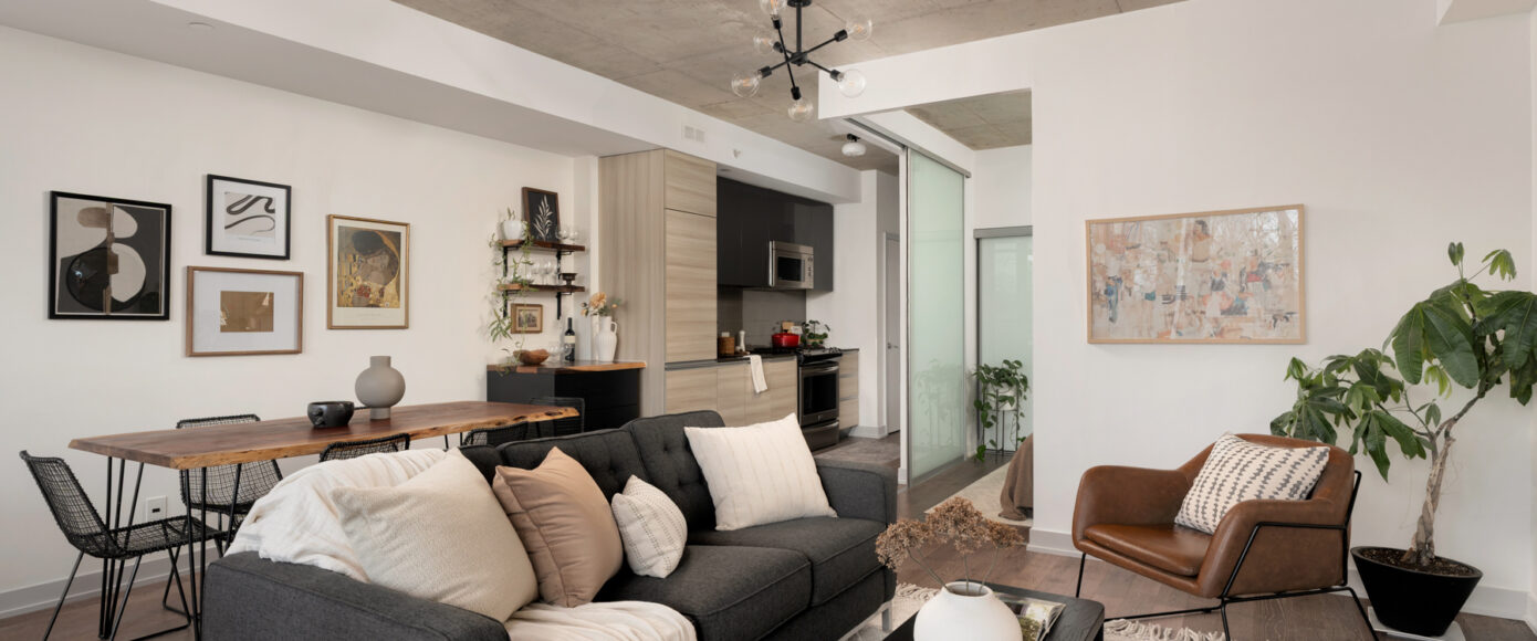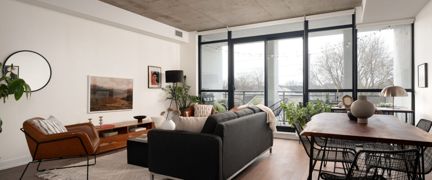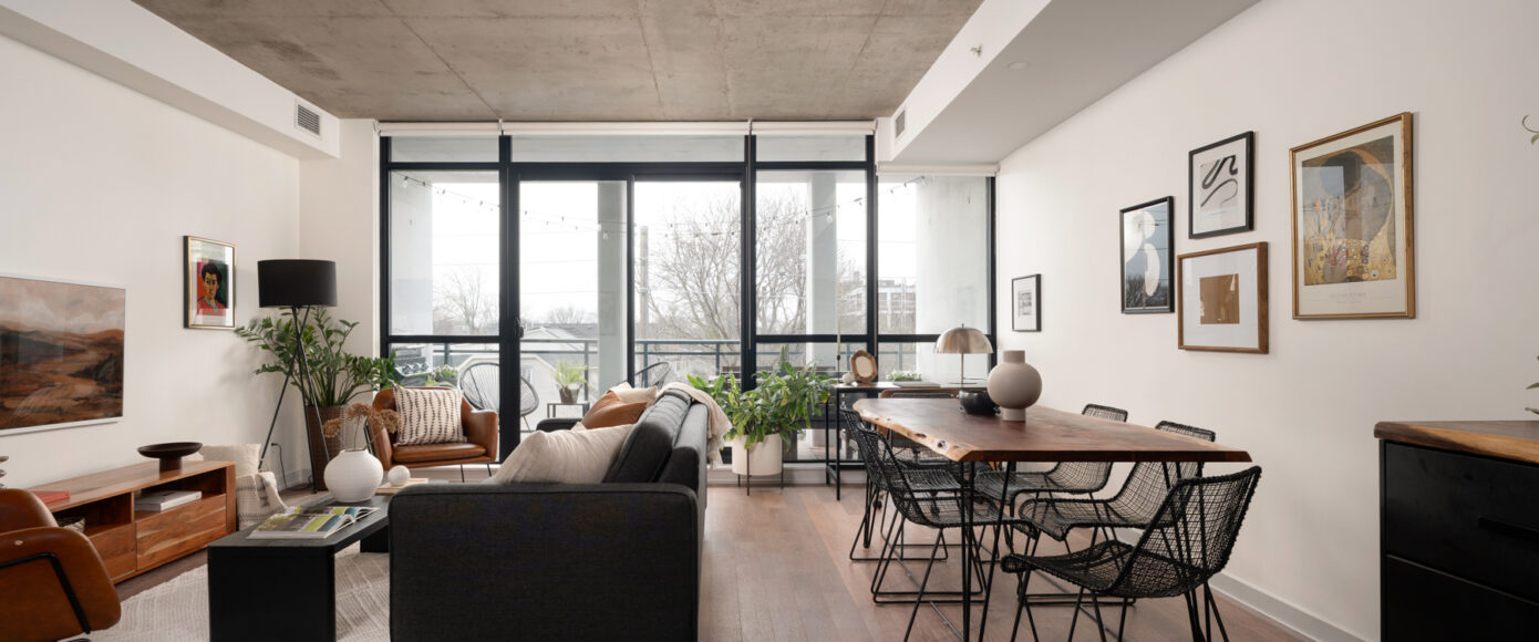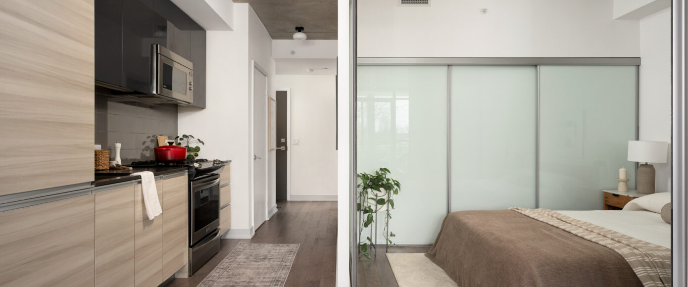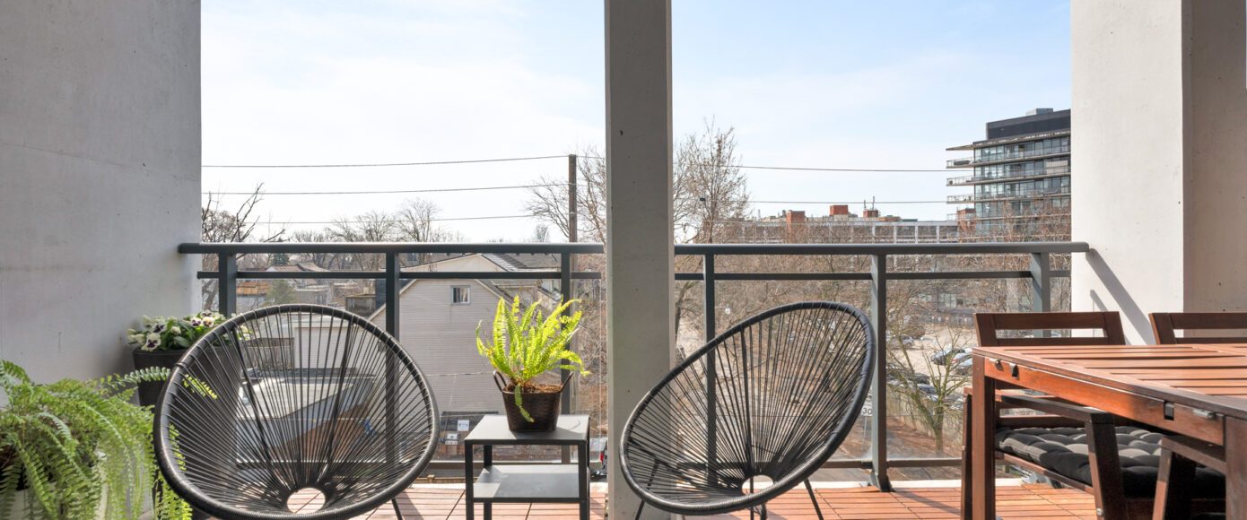 Stylish without being pretentious, Leslieville feels like the sound of a bright saxophone under a lamppost. In the boutique Taylor Lofts, this 2 bedroom 2 bathroom split-layout is wide and well proportioned. Say goodbye to the narrow floor plan, Suite #403 has 9-ft high exposed concrete ceilings and large windows across the back offering plenty of natural light. A cold craft beer, a good book, and your feet up out on that roomy balcony, equipped with a gas hookup for the self-proclaimed grillmaster, your friends will have serious ‘end of day’ envy. That’s pretty rare, but it doesn’t stop there, as it also comes with a full-sized gas range stove and ensuite bathroom in the primary bedroom, notably large enough for a Queen! The open concept living / dining room is a breathable space you’ll spend most of your time.