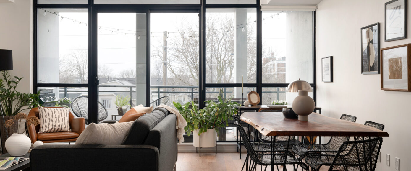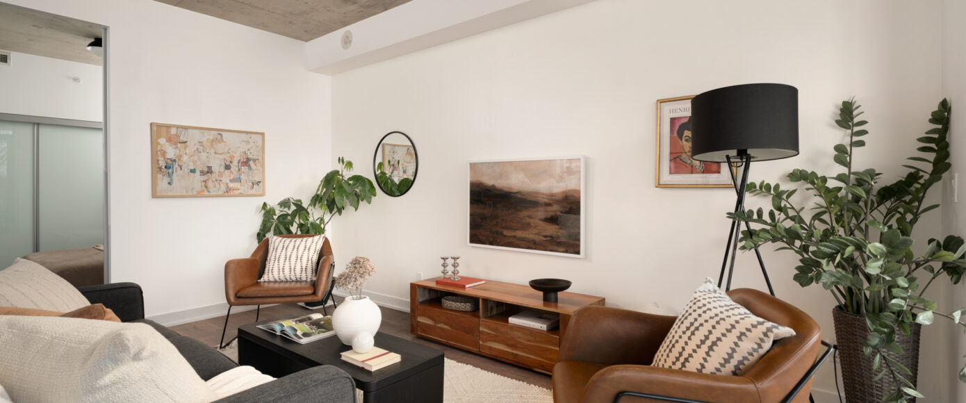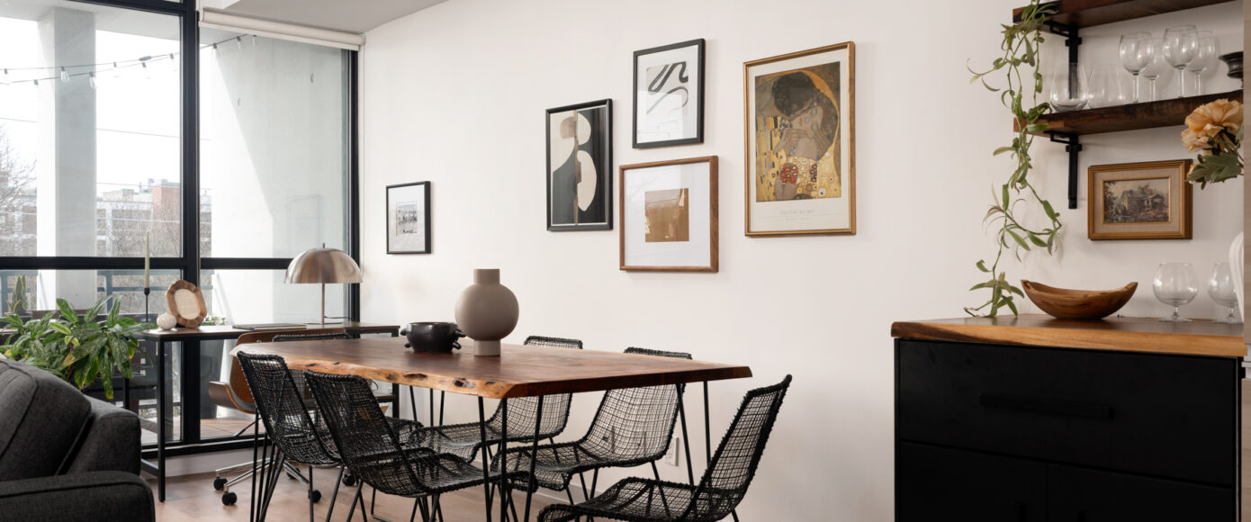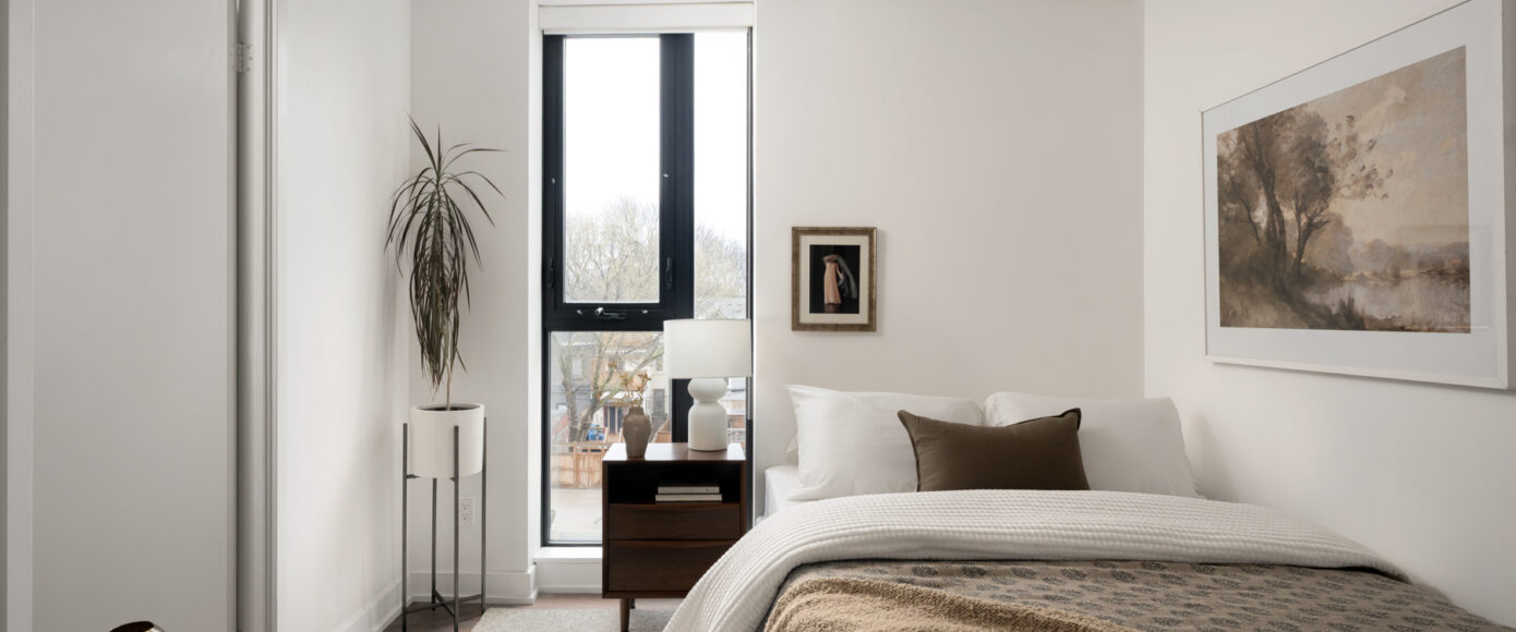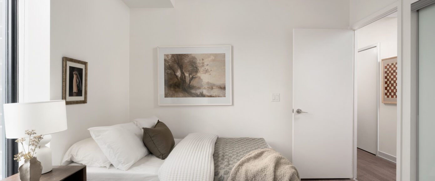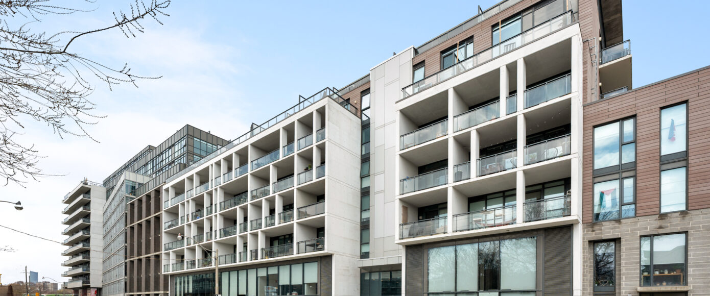 Stylish without being pretentious, Leslieville feels like the sound of a bright saxophone under a lamppost. In the boutique Taylor Lofts, this 2 bedroom 2 bathroom split-layout is wide and well proportioned. Say goodbye to the narrow floor plan, Suite #403 has 9-ft high exposed concrete ceilings and large windows across the back offering plenty of natural light. A cold craft beer, a good book, and your feet up out on that roomy balcony, equipped with a gas hookup for the self-proclaimed grillmaster, your friends will have serious ‘end of day’ envy. That’s pretty rare, but it doesn’t stop there, as it also comes with a full-sized gas range stove and ensuite bathroom in the primary bedroom, notably large enough for a Queen! The open concept living / dining room is a breathable space you’ll spend most of your time.