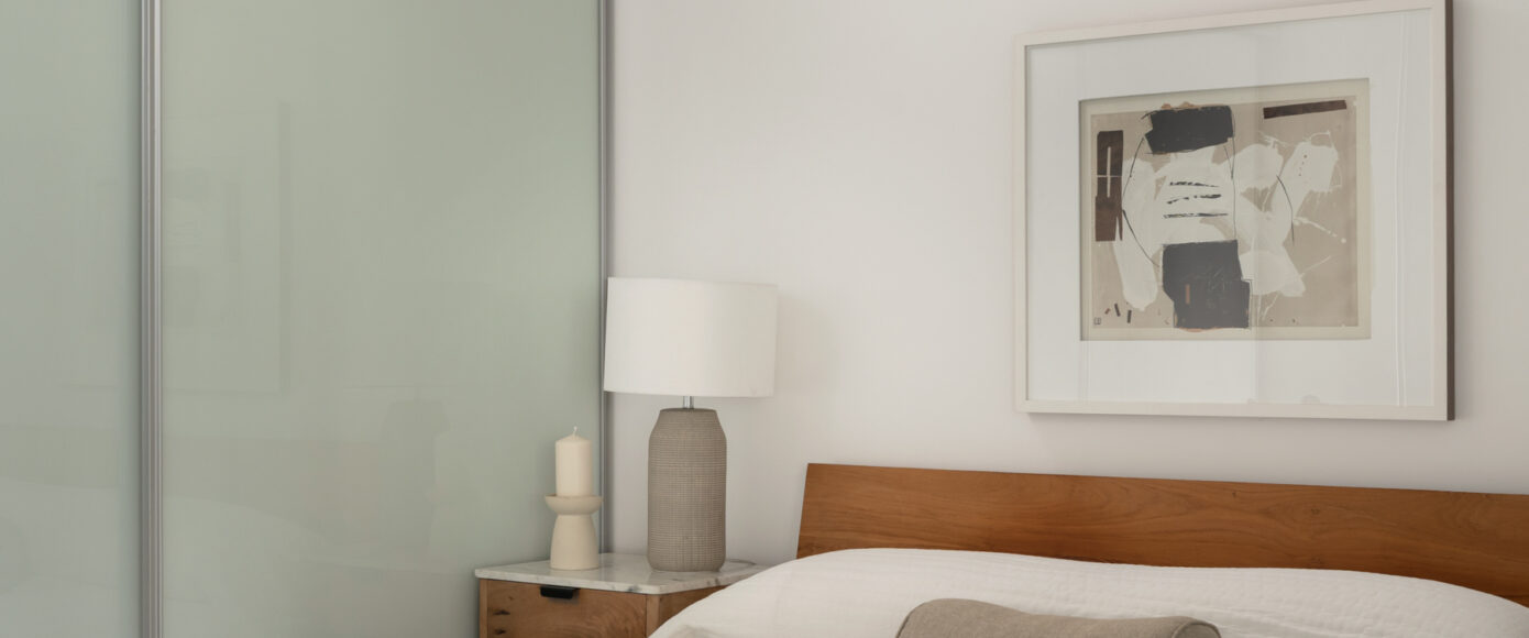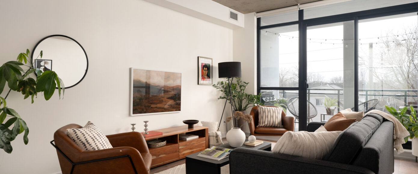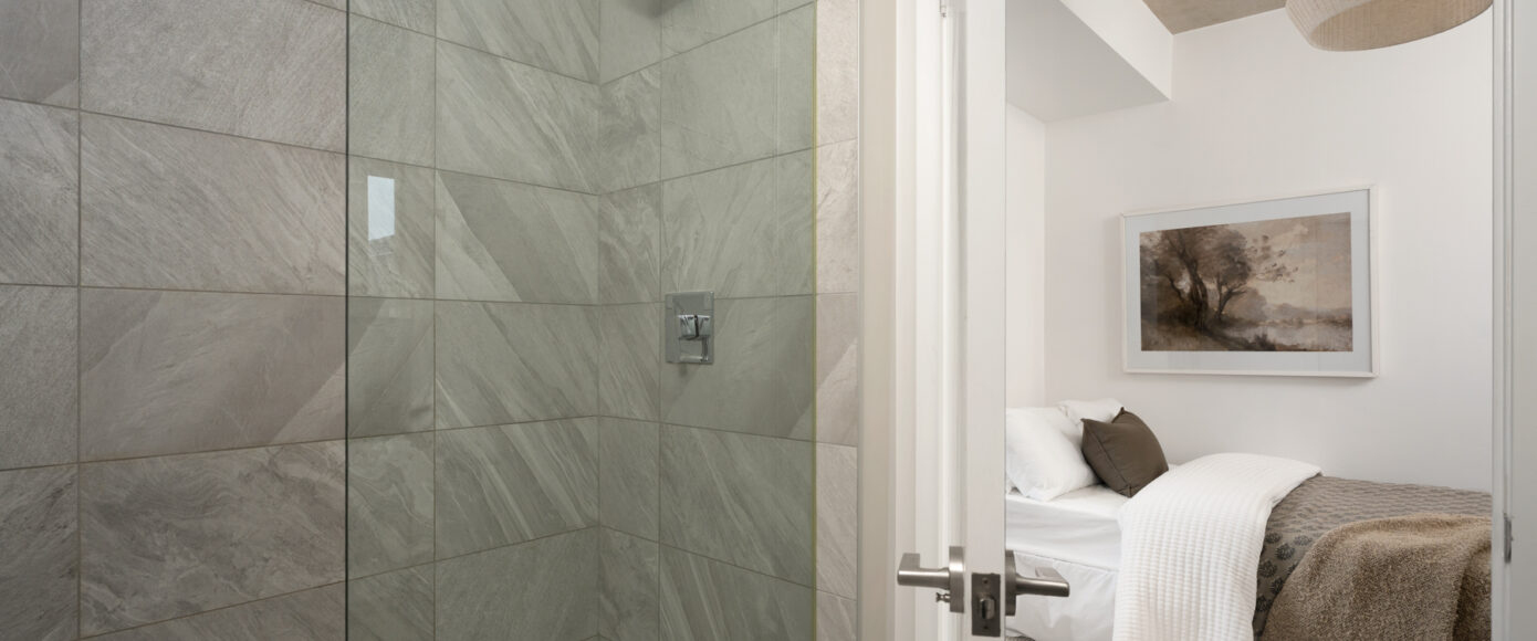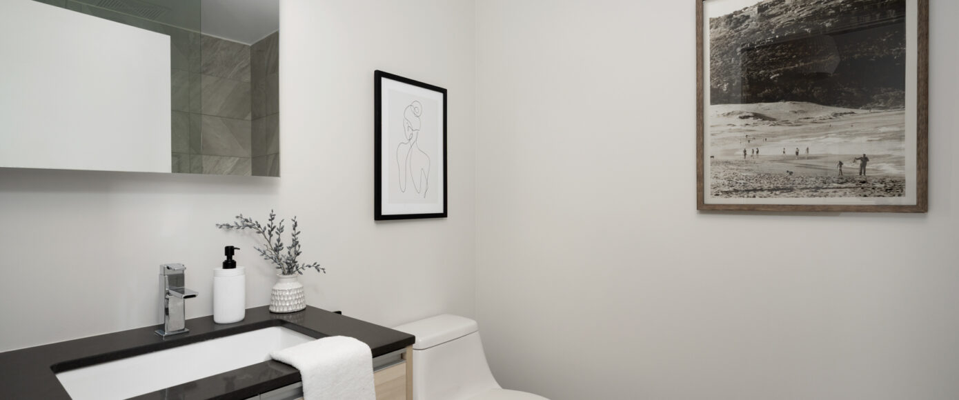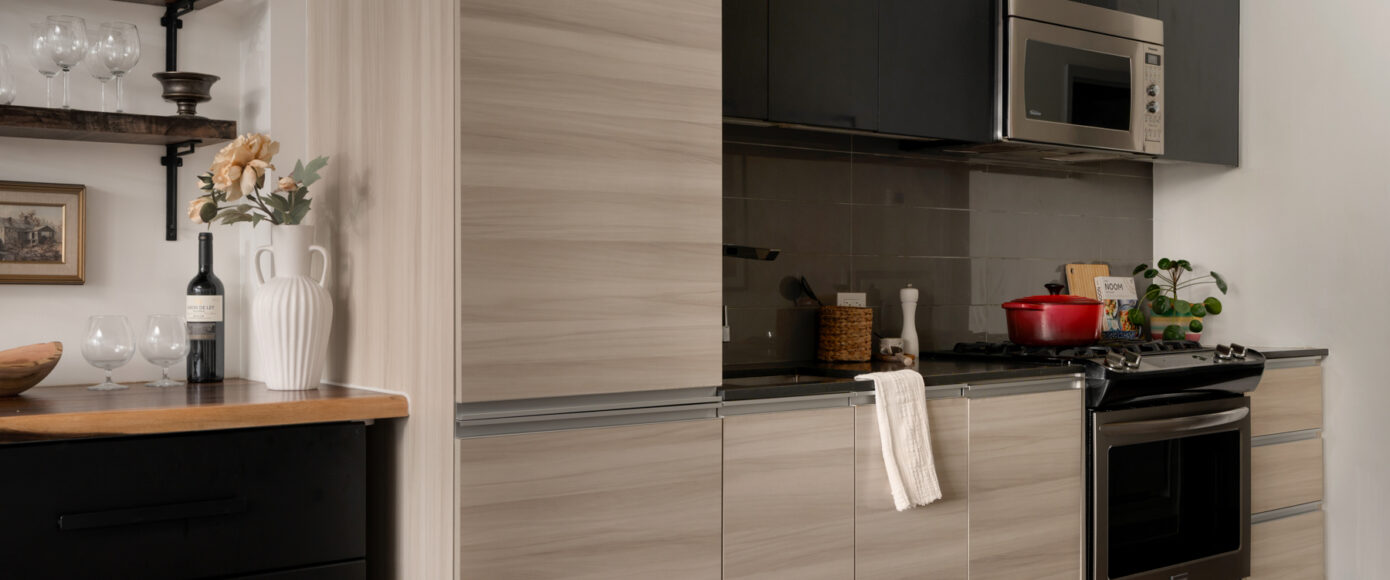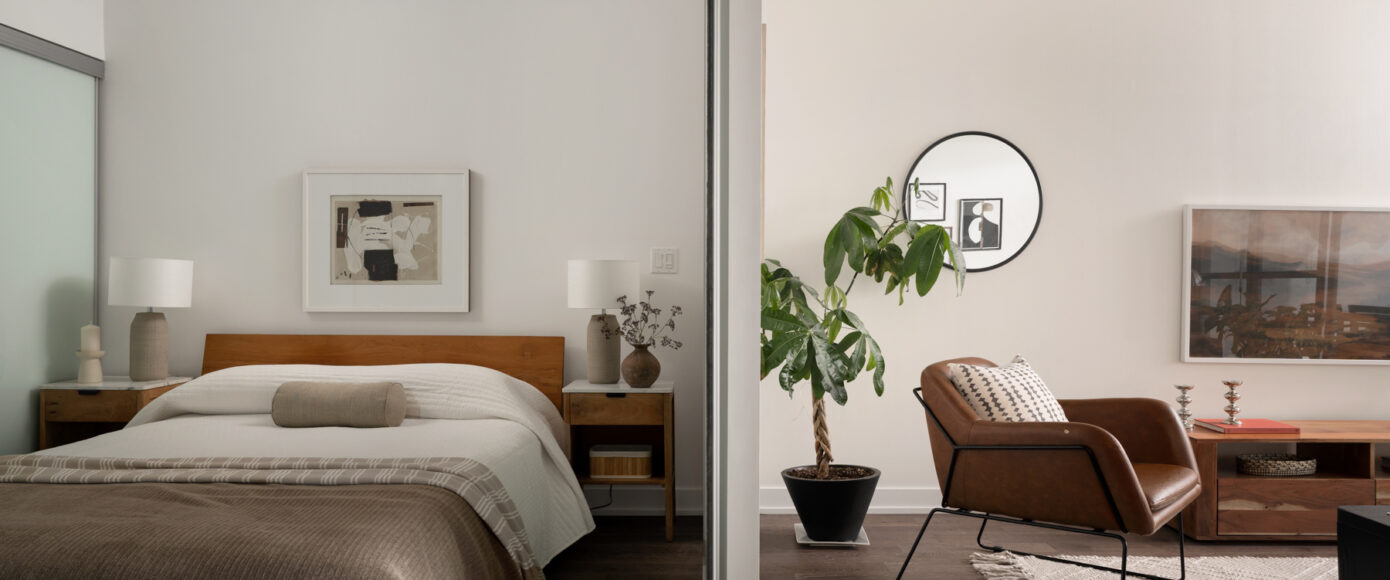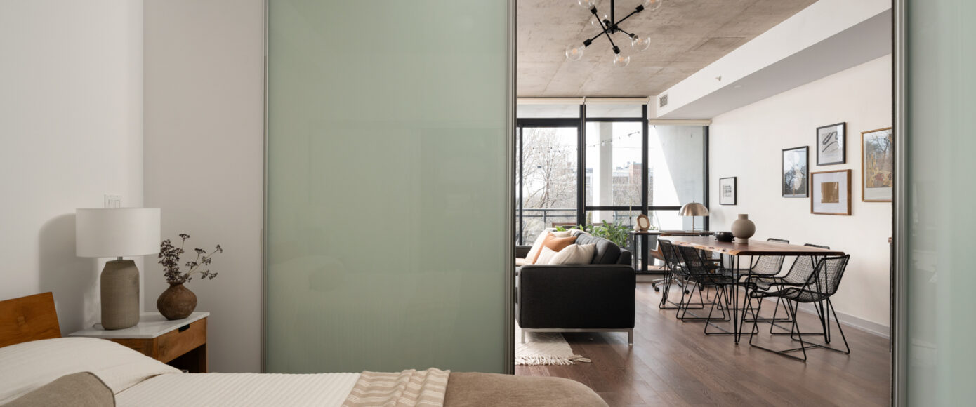 Stylish without being pretentious, Leslieville feels like the sound of a bright saxophone under a lamppost. In the boutique Taylor Lofts, this 2 bedroom 2 bathroom split-layout is wide and well proportioned. Say goodbye to the narrow floor plan, Suite #403 has 9-ft high exposed concrete ceilings and large windows across the back offering plenty of natural light. A cold craft beer, a good book, and your feet up out on that roomy balcony, equipped with a gas hookup for the self-proclaimed grillmaster, your friends will have serious ‘end of day’ envy. That’s pretty rare, but it doesn’t stop there, as it also comes with a full-sized gas range stove and ensuite bathroom in the primary bedroom, notably large enough for a Queen! The open concept living / dining room is a breathable space you’ll spend most of your time.