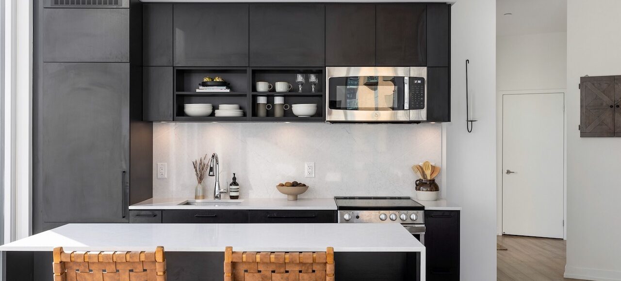 Kitchen & Bar: Chef’s kitchen features quartz countertops and backsplash, custom island, stainless steel appliances (integrated fridge/dishwasher), and soft-close cabinetry. Custom bar area with beverage/wine cooler and built-in console.