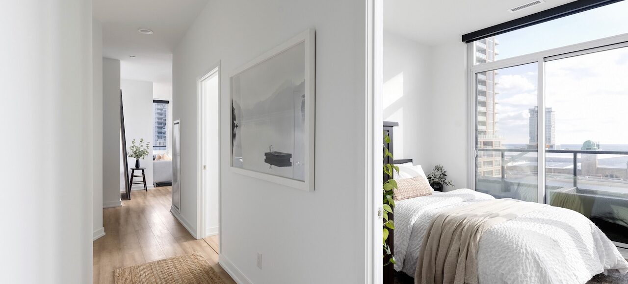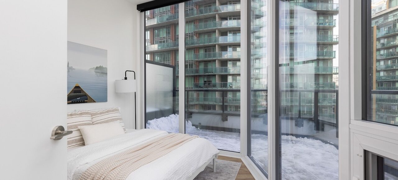 Primary Bedroom: South-facing lake views, terrace walkout, 4-piece ensuite with quartz counter and frameless glass shower.