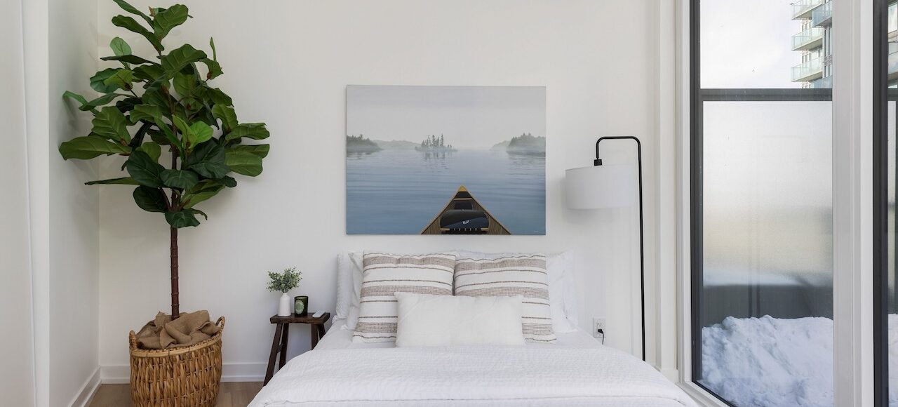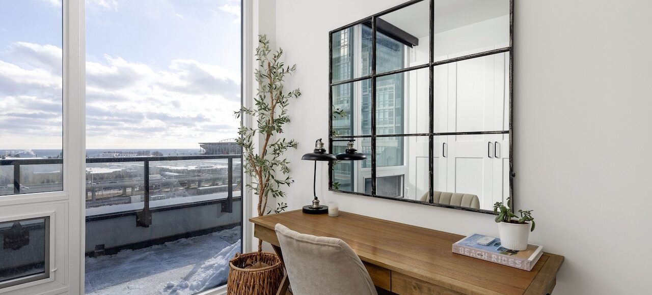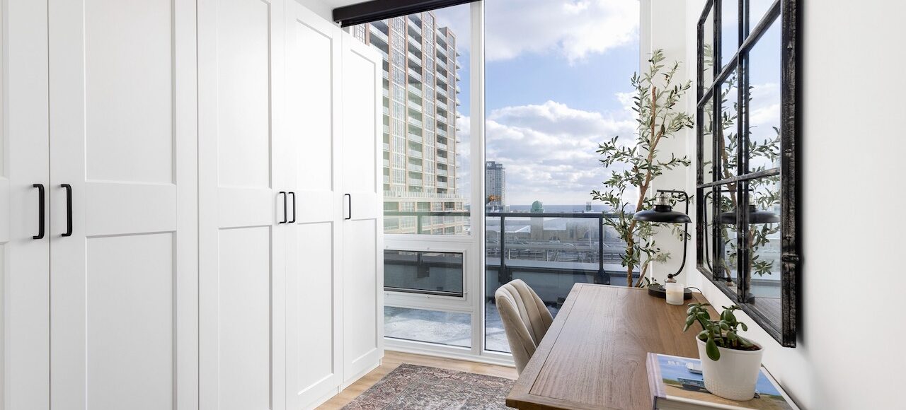 2nd Bedroom: Currently configured as home office with custom closet system, south-facing lake views – perfect for work-from-home professionals.