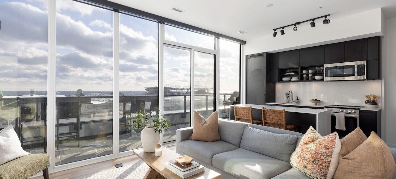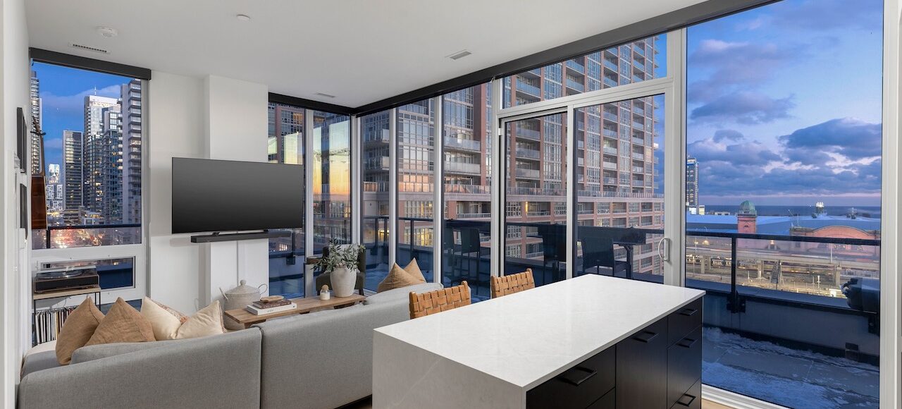 Living/Dining: Open-concept with south-east lake views, walkout to wraparound terrace with gas line, custom motorized floor-to-ceiling blinds.