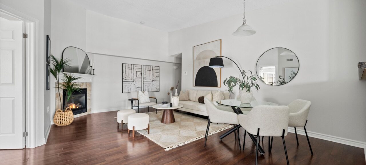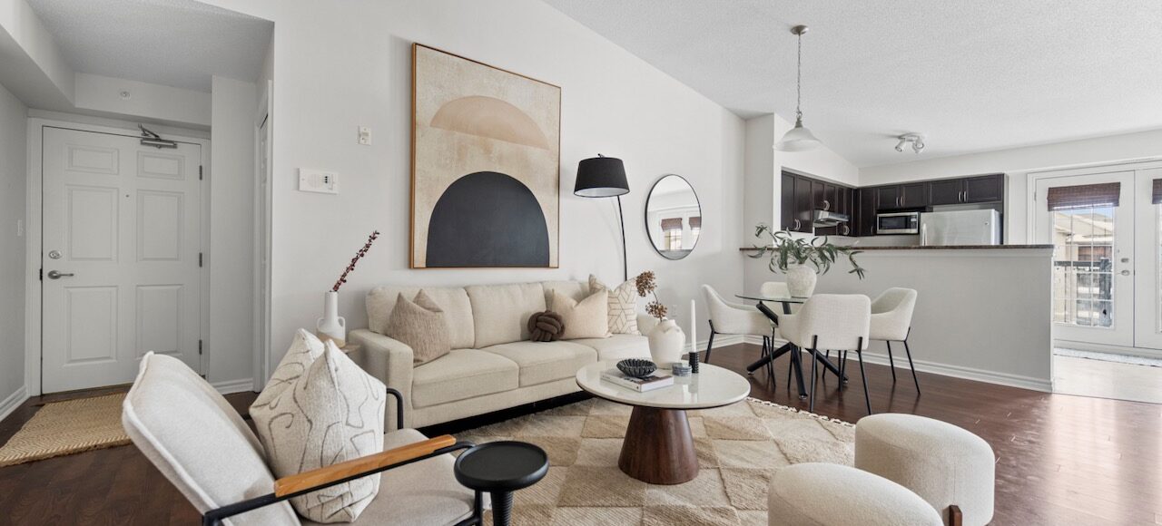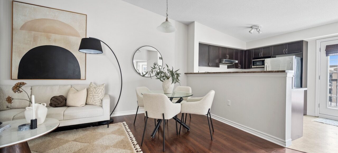 Open to the living room, the dining area comfortably accommodates a full dining table without crowding the space. Whether hosting friends or enjoying everyday meals, this layout allows both living and dining areas to coexist effortlessly — a true standout for condo living.