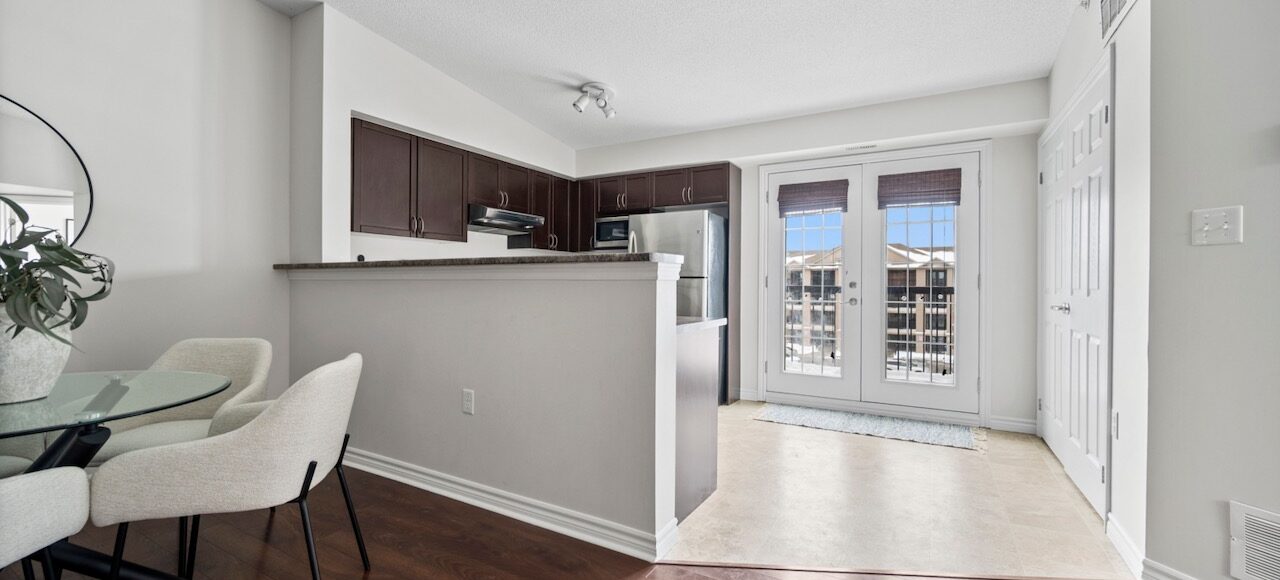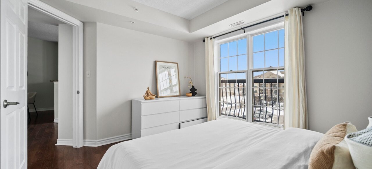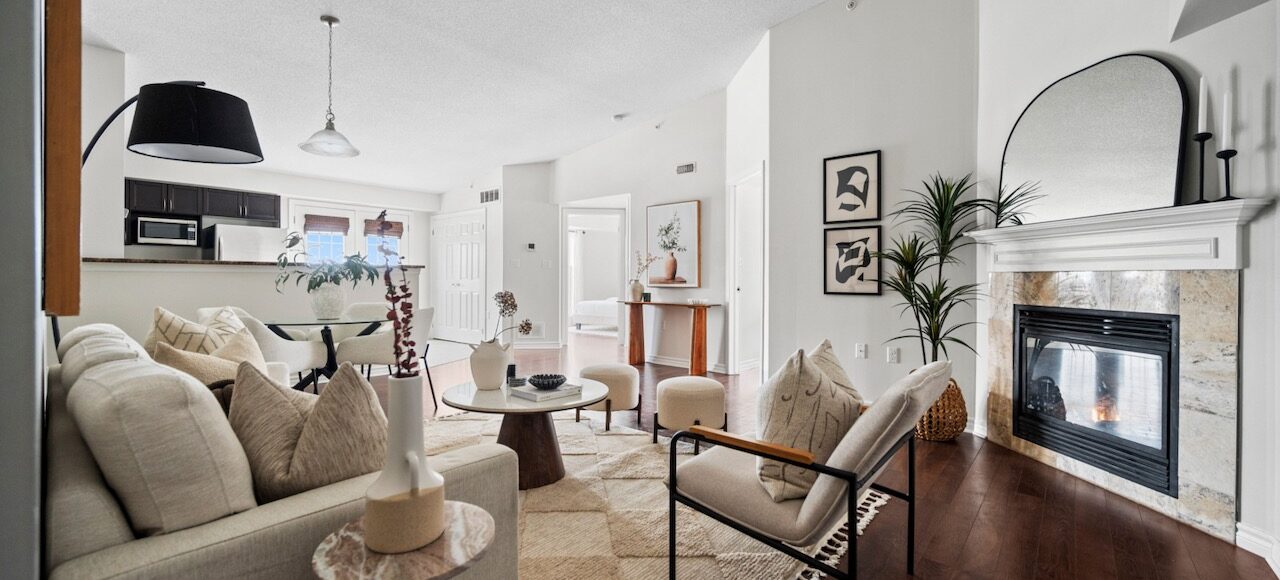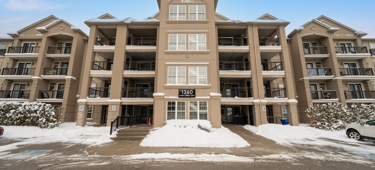 Generous, homey, and move-in ready, this 1,013 sq ft unit is not your standard cookie-cutter condo. 1360 Main St E – Suite 402 has cathedral ceilings, a living room big enough for the sectional of your dreams and a defined dining area, plus a cozy gas fireplace — it’s the kind of space where you actually want to hang out. The layout flows effortlessly, giving you room to live, work, and play without feeling cramped.