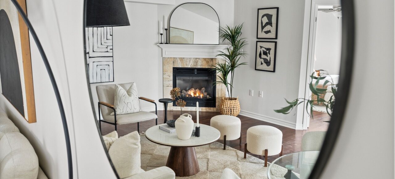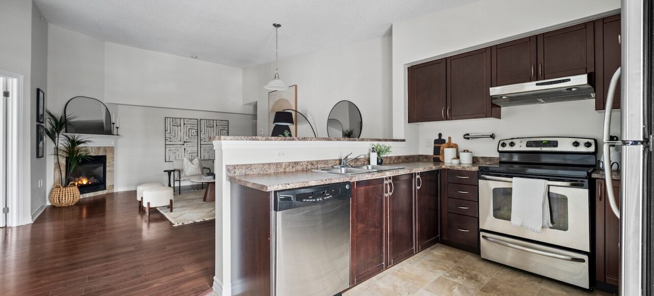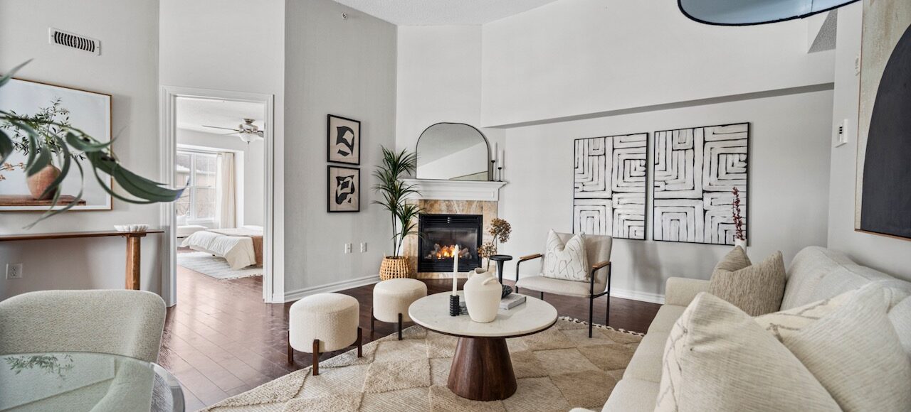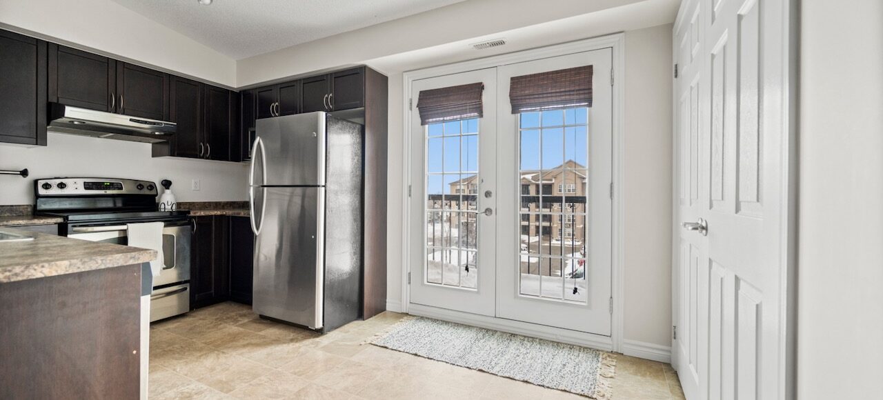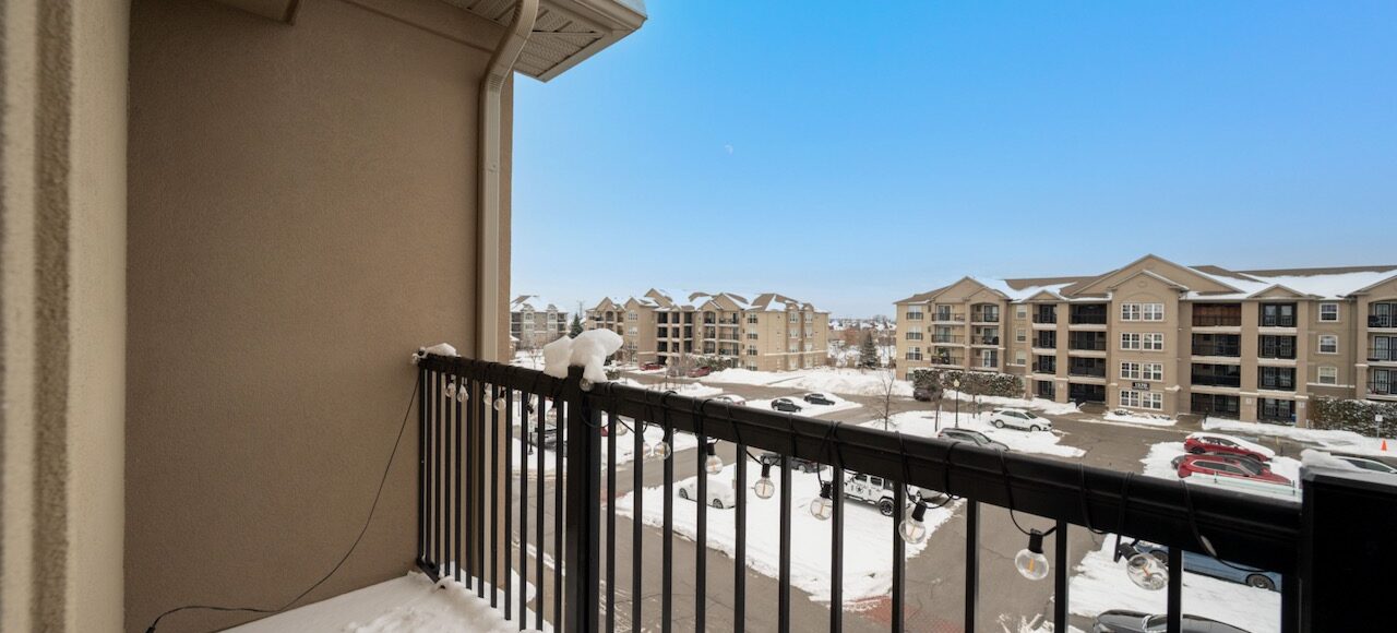 Generous, homey, and move-in ready, this 1,013 sq ft unit is not your standard cookie-cutter condo. 1360 Main St E – Suite 402 has cathedral ceilings, a living room big enough for the sectional of your dreams and a defined dining area, plus a cozy gas fireplace — it’s the kind of space where you actually want to hang out. The layout flows effortlessly, giving you room to live, work, and play without feeling cramped.