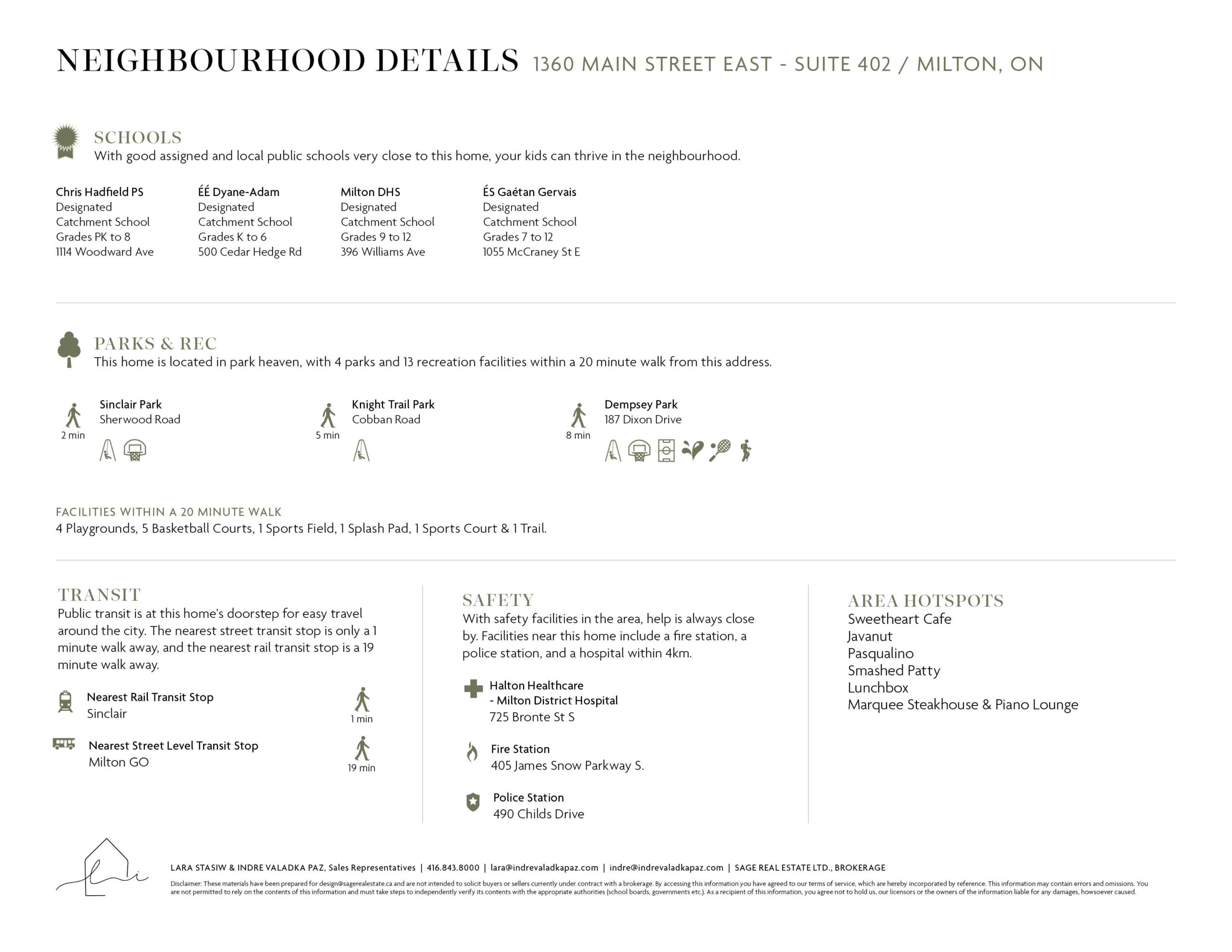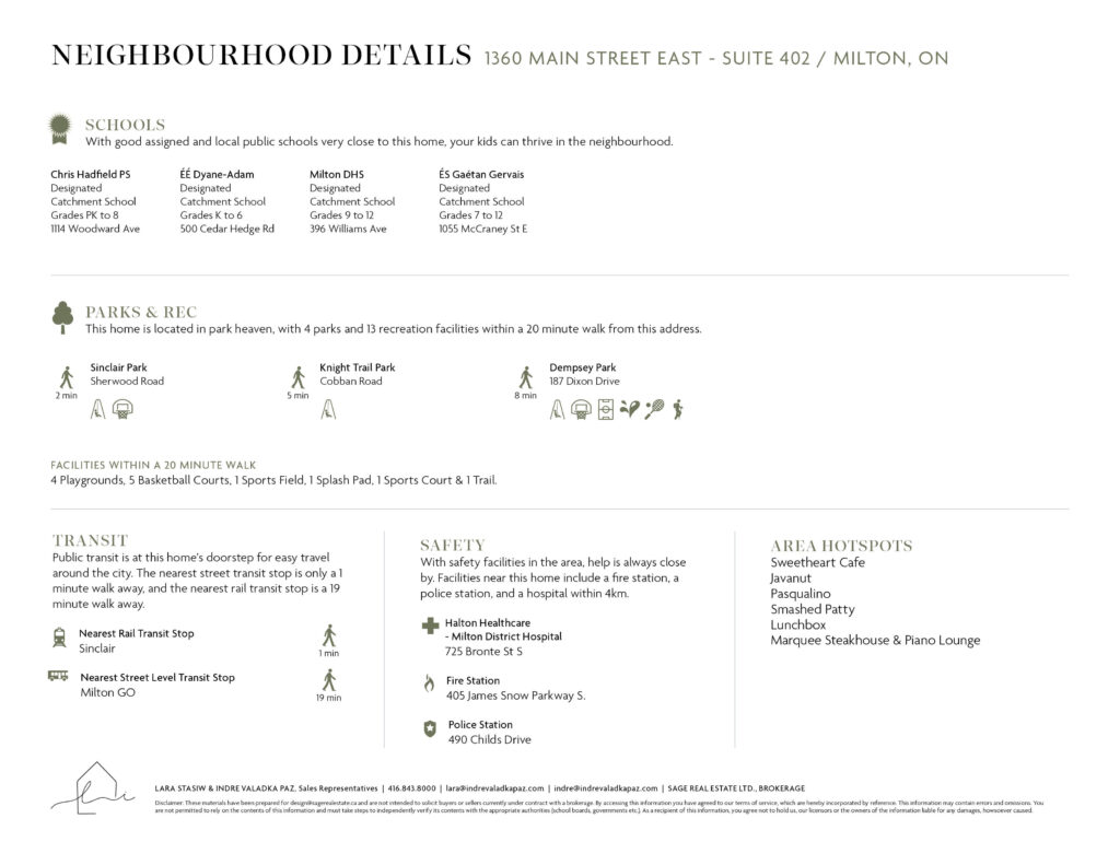 Living at 1360 Main Street East places you close to everything that matters. Milton GO Station and Highway 401 are just minutes away, making commuting and daily travel effortless. Nearby Milton Crossroads offers shopping, groceries, dining, and coffee spots, while Sinclair Park is steps away for dog walks, fresh air, and casual outdoor time.