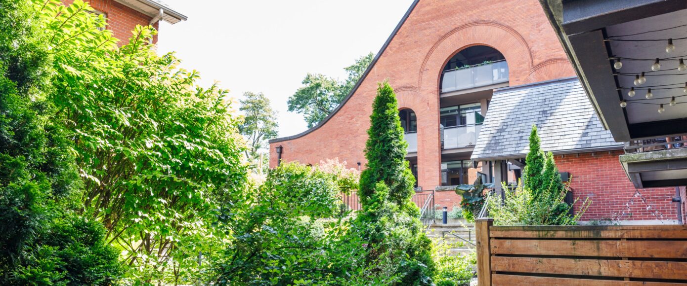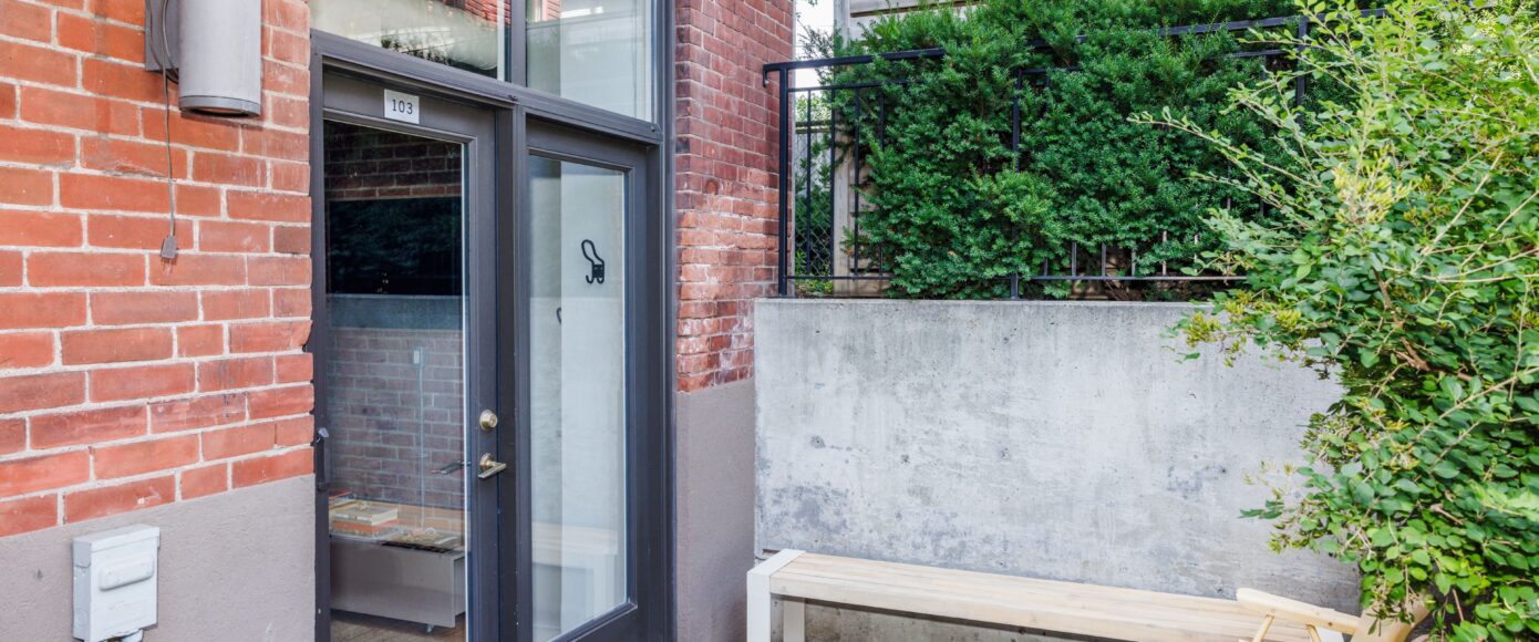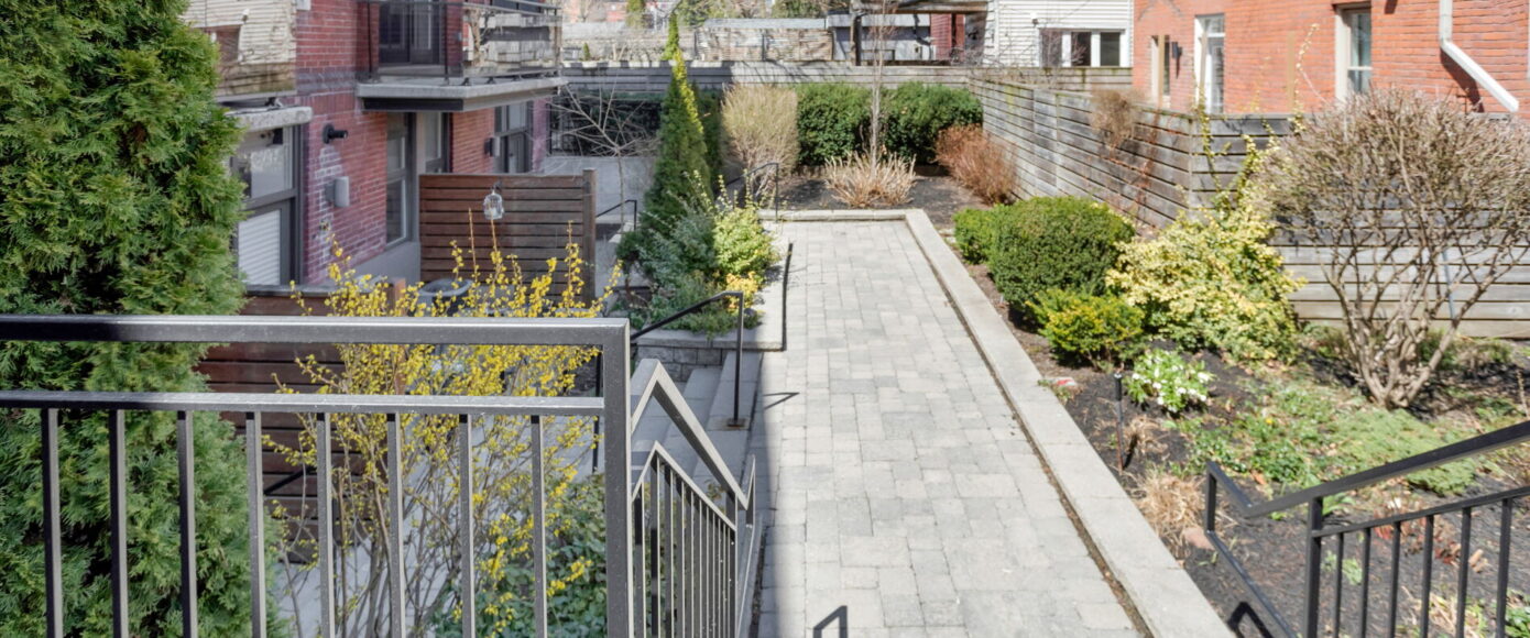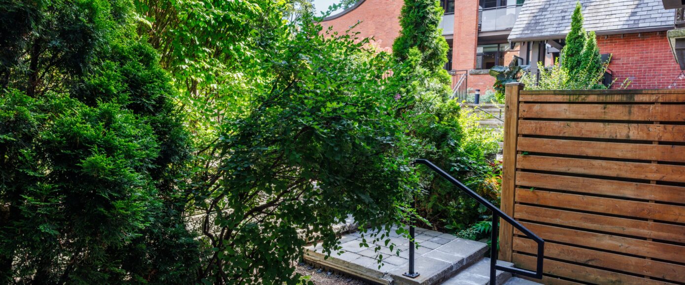 Enjoy the ease of ground-floor living with your own private entrance—no elevators or stairs required. A peaceful stone path lined with seasonal greenery leads to your front door, where lilac trees greet you and your private terrace awaits. It’s a serene oasis that feels worlds away from the city, yet right in the heart of the Junction.