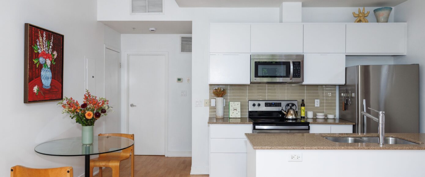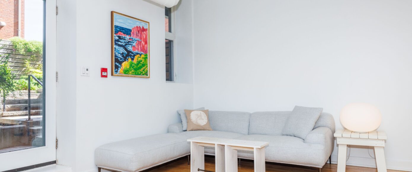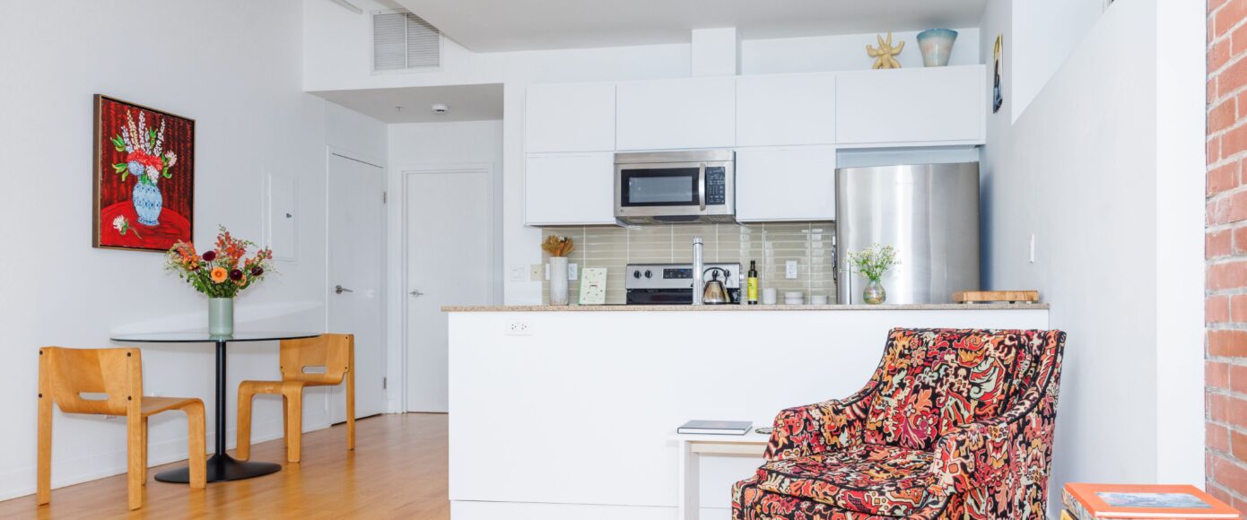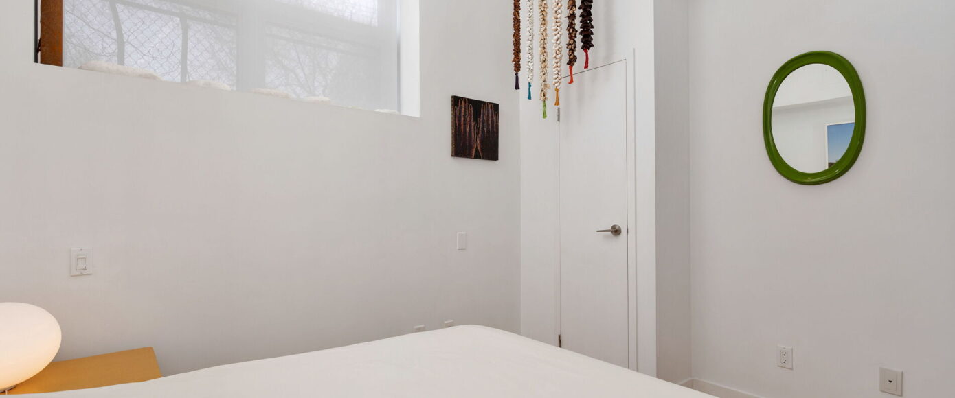 With soaring 11.5-foot ceilings, exposed brick and ductwork, and sunlight pouring in from two sides, this corner unit offers the ultimate in loft living. Custom motorized Coulisse roller blinds on every window let you transform the natural light into soft, gauzy romance throughout the day.