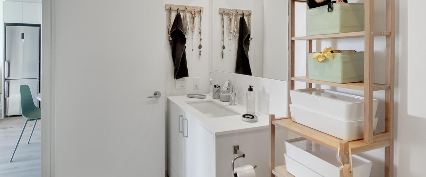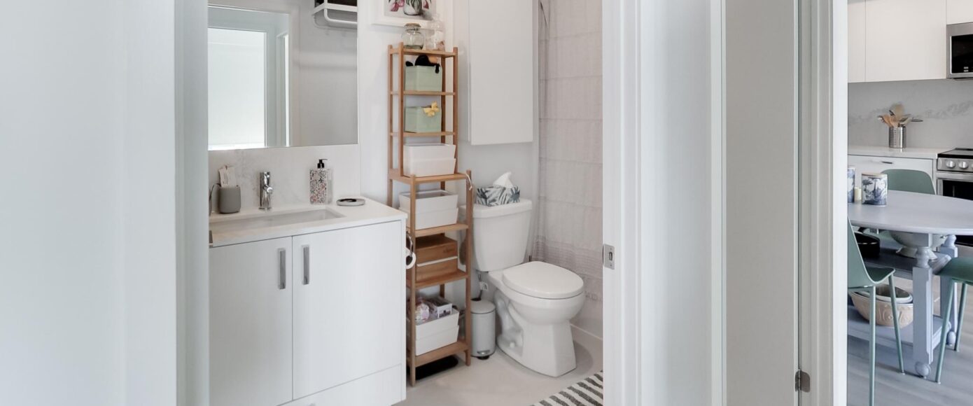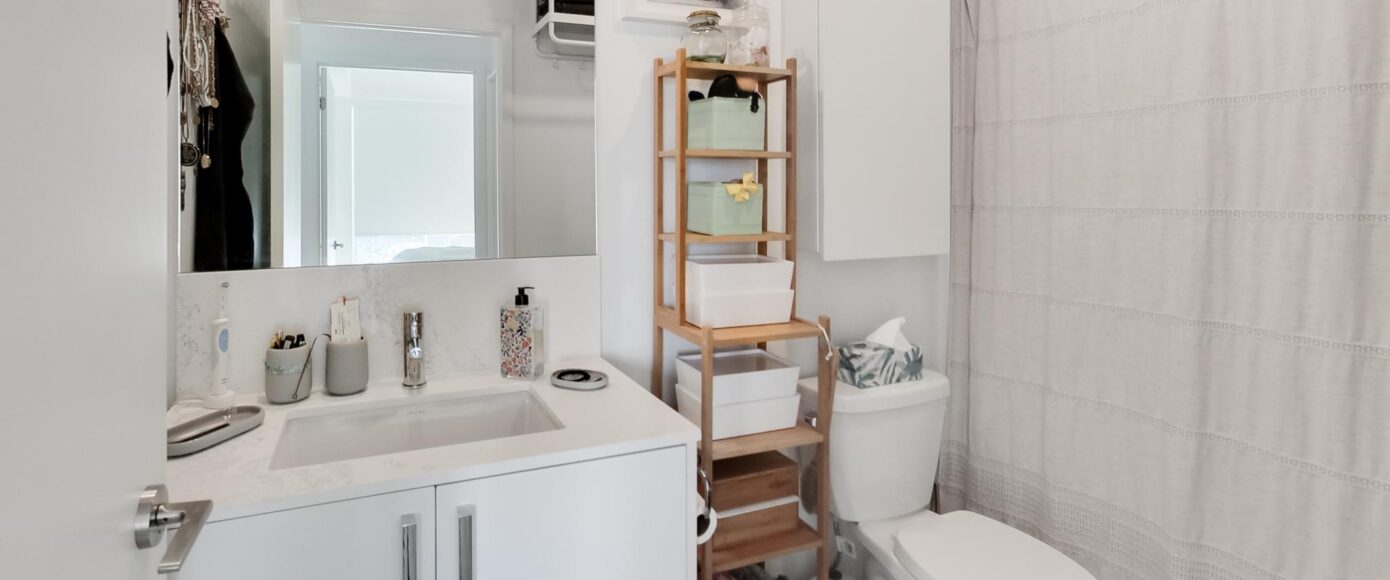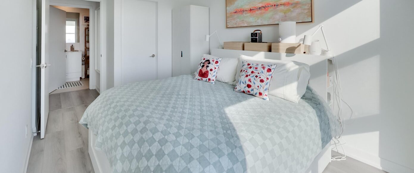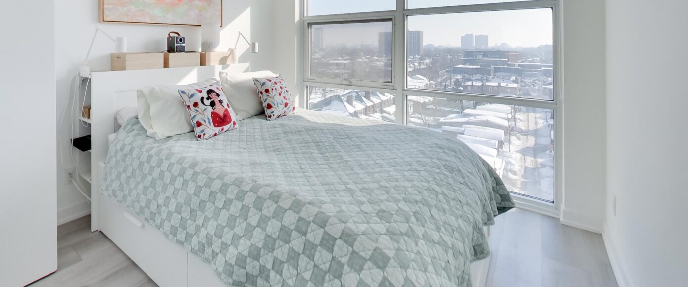 The spacious living area opens to a balcony overlooking a tree-lined neighbourhood, with unobstructed skyline views and beautiful sunrises. The bedroom shares the same view through floor-to-ceiling windows and includes a generous walk-in closet, while the four-piece bath pairs clean, modern design with function and more built-in storage.