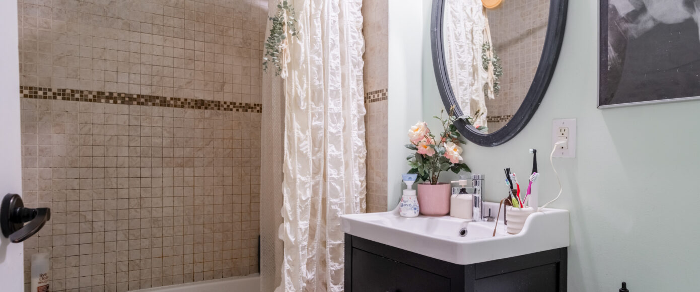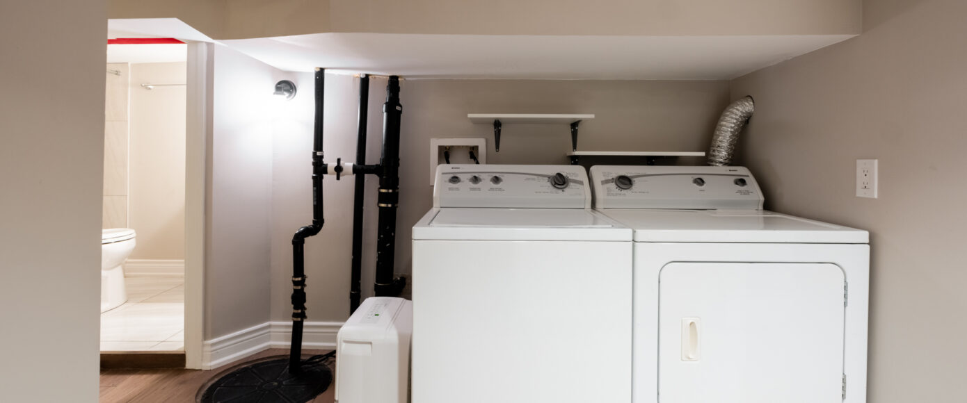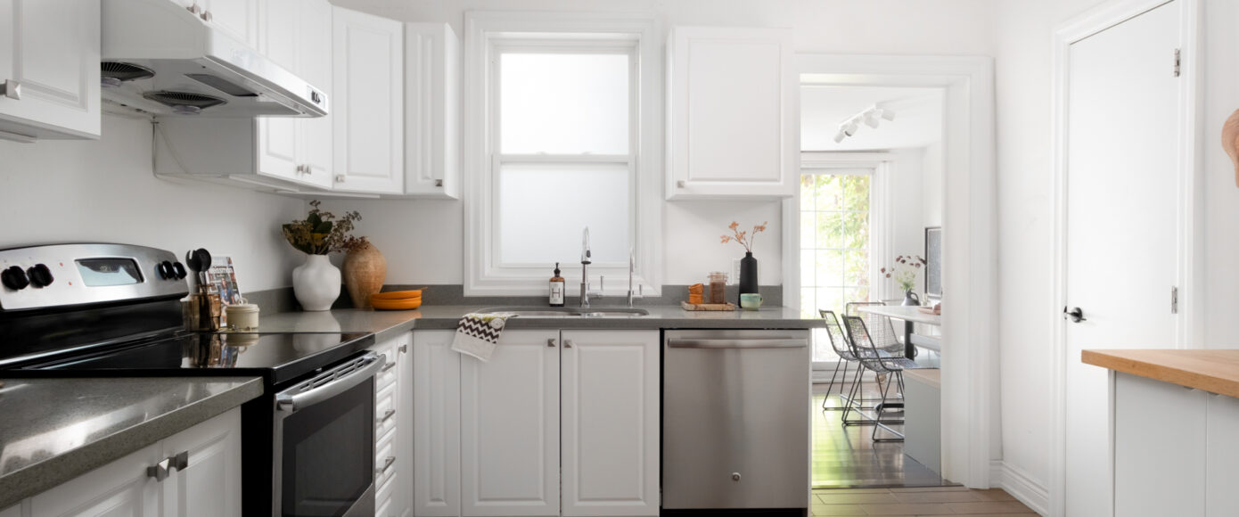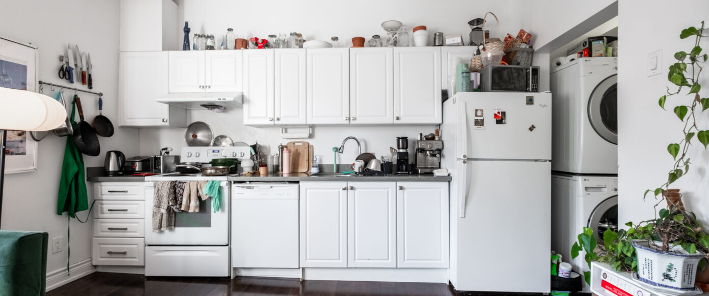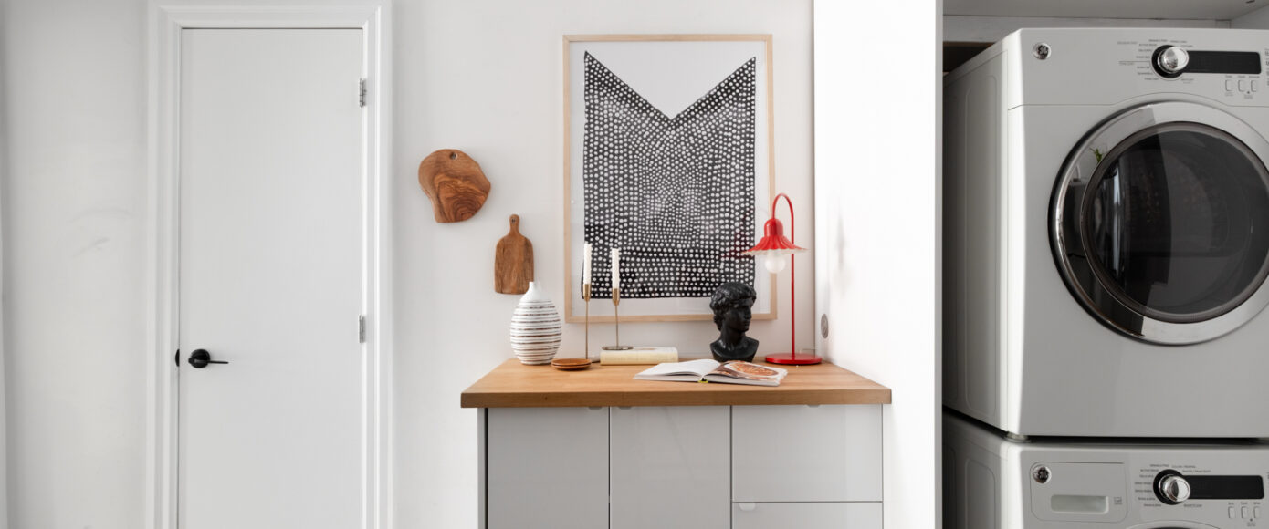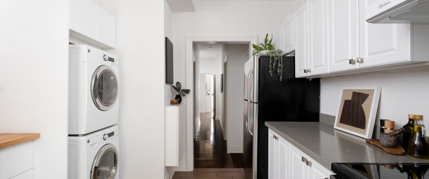 It’s bright, open, and surprisingly spacious for a downtown home. The L-shaped layout makes cooking intuitive, and the full-size laundry tucked neatly on the opposite wall adds convenience. It’s where we spend most of our time, and it truly feels like the heart of the home.