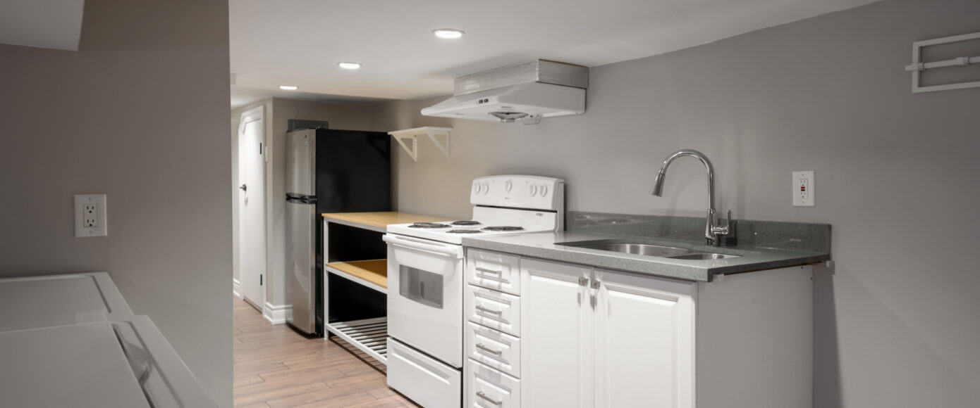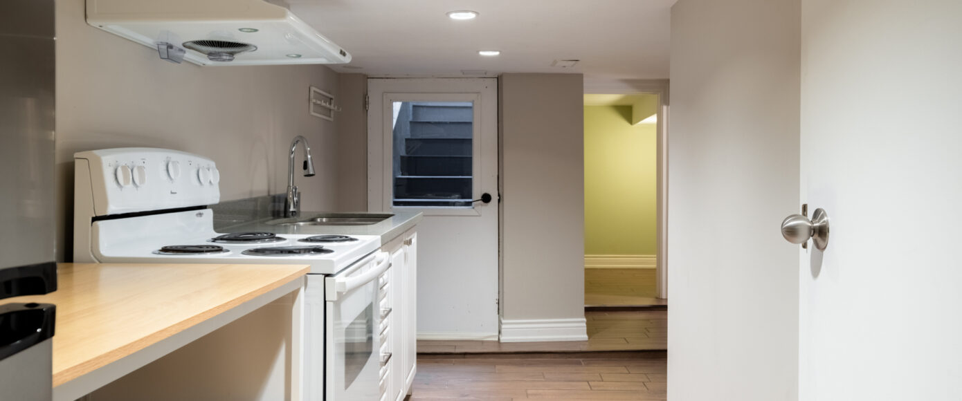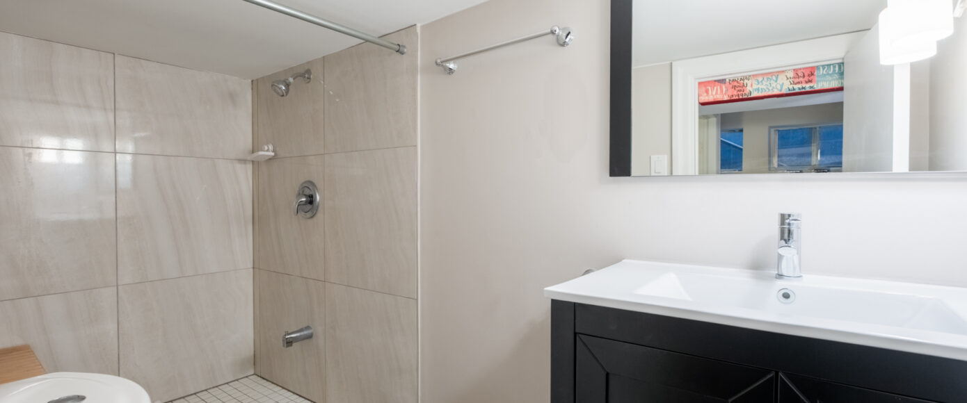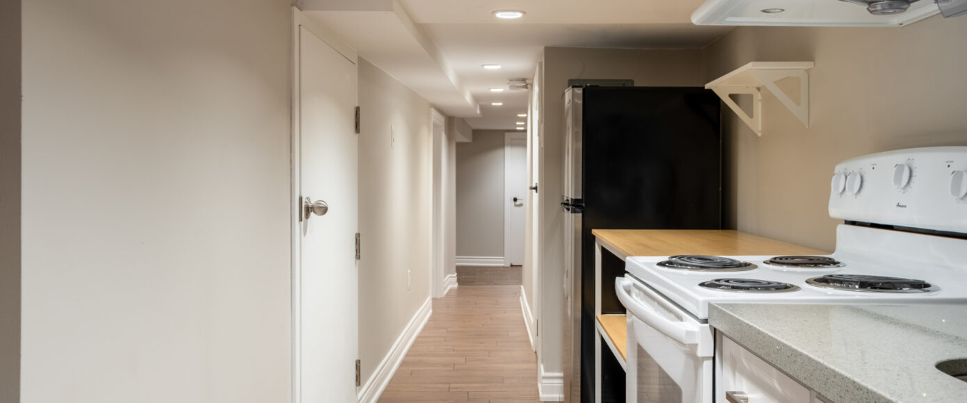 We fully renovated the main-floor bathroom with a curbless shower, seamless flooring, and a wall-mounted toilet for a clean, modern look. We added custom built-in bench seating with storage in the dining area, built-in cabinets in the living room that take advantage of the higher ceiling heights, optimizing storage in nearly every room. The freshly maintained basement apartment is bright and efficient despite the lower ceiling height.