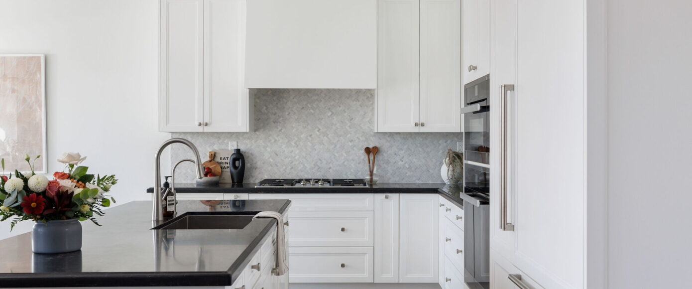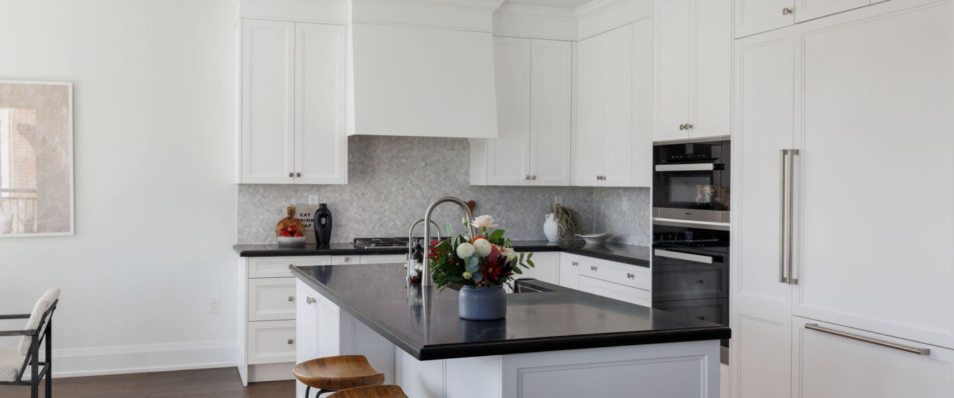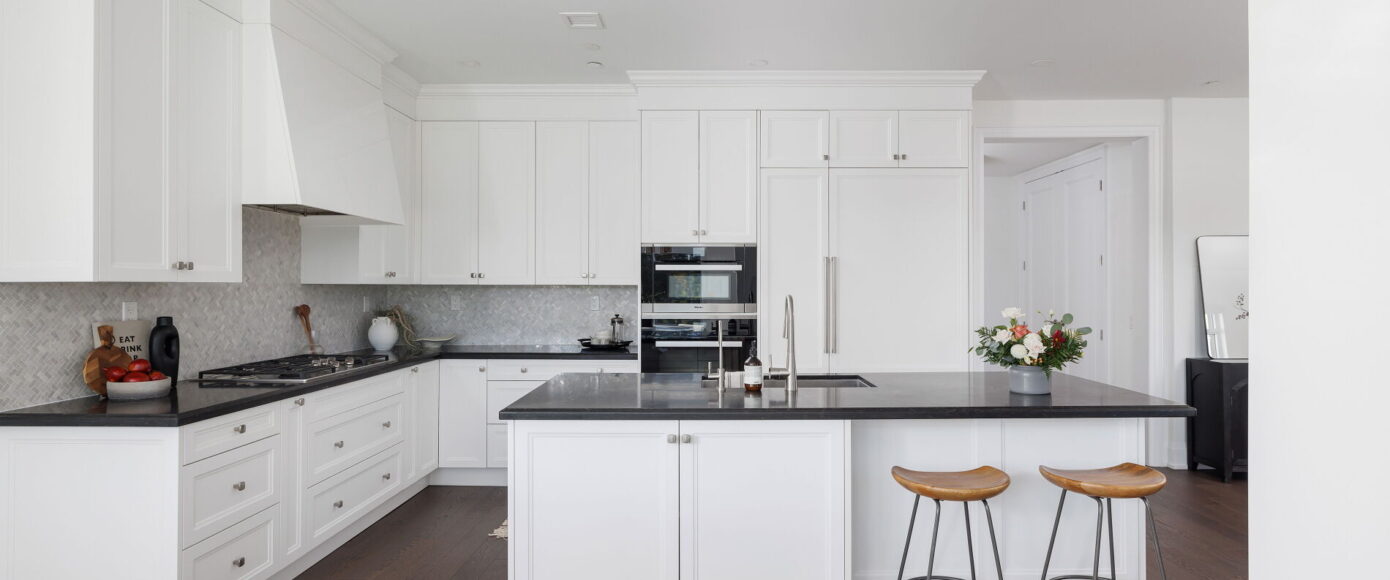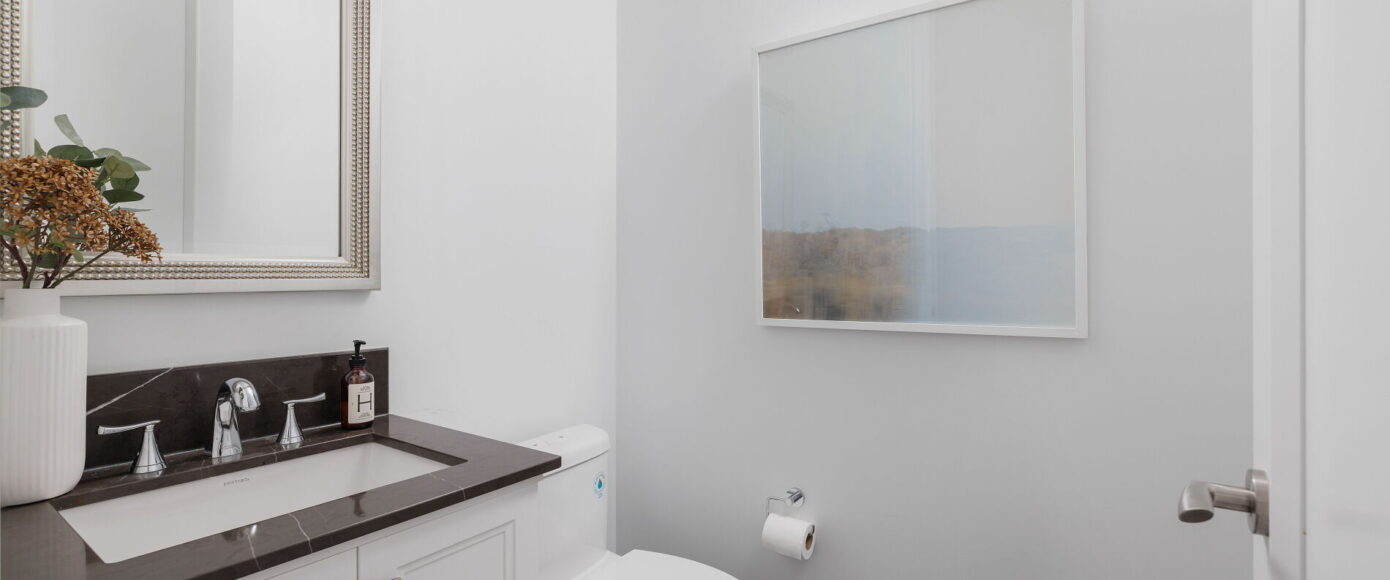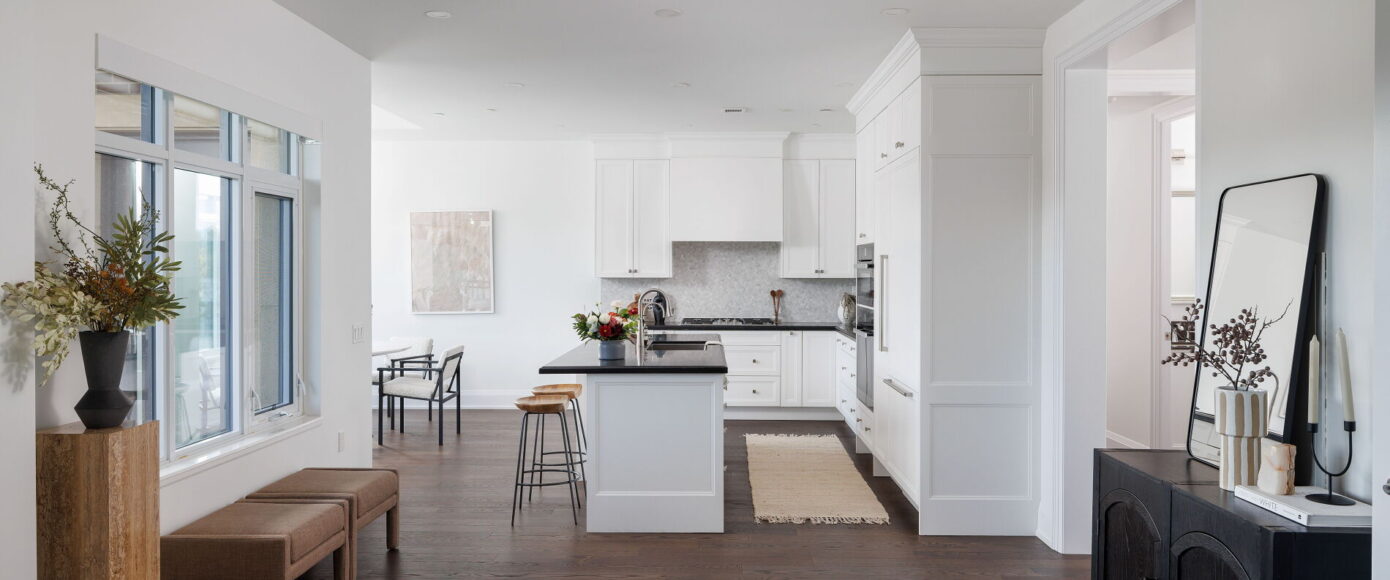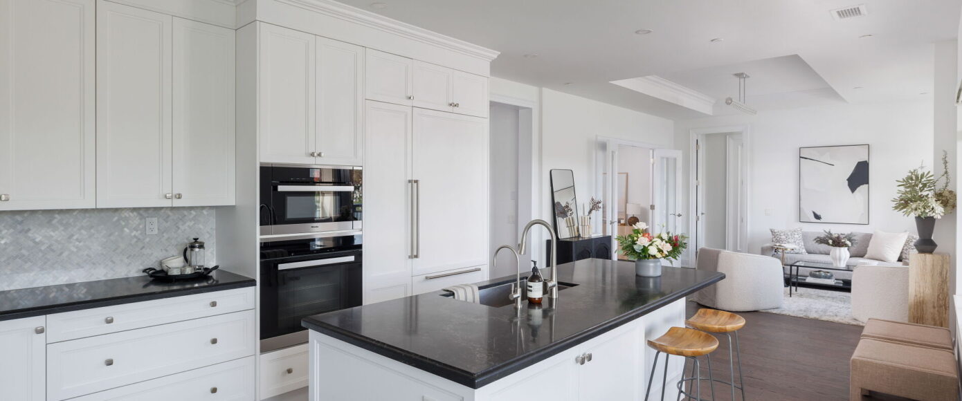 Through custom upgrades totalling nearly $75,000, the designer Irpinia chef’s kitchen is anchored by a custom oversized island with breakfast bar and Caesarstone Quartz Vanilla Noir counters, with a full complement of Miele & Sherwood Signature appliances and a built-in wine fridge tucked in the laundry room. A Faber range hood with custom surround is an elegant top note to this gorgeous heart of the home.
