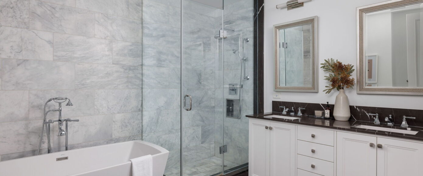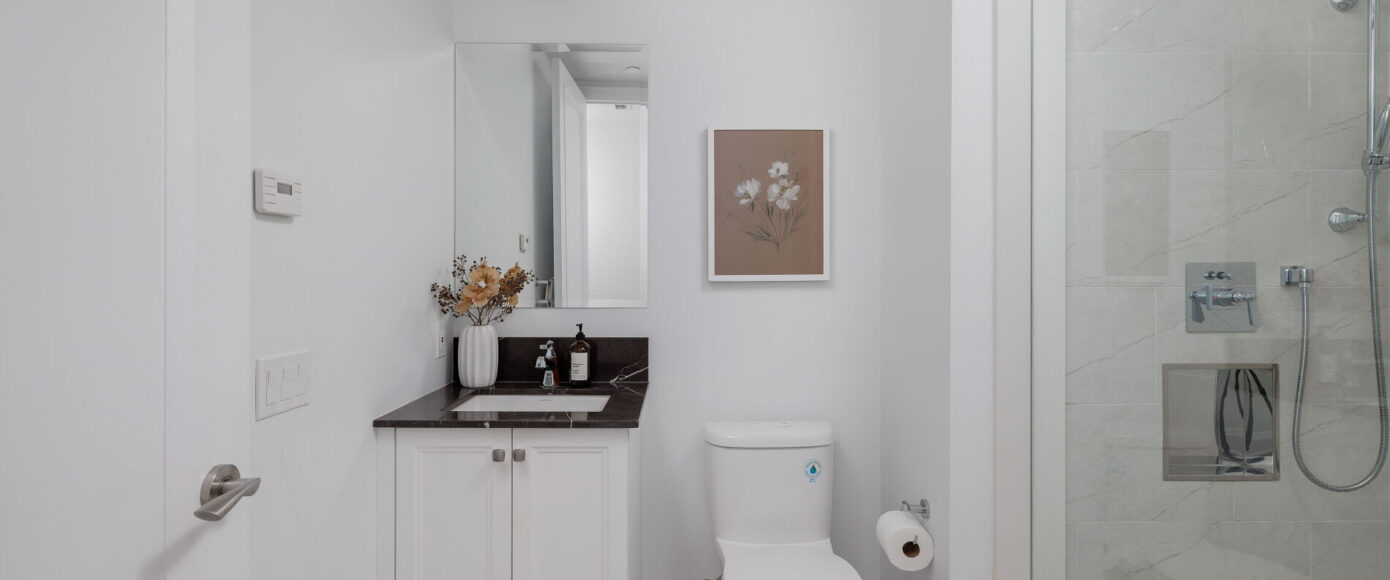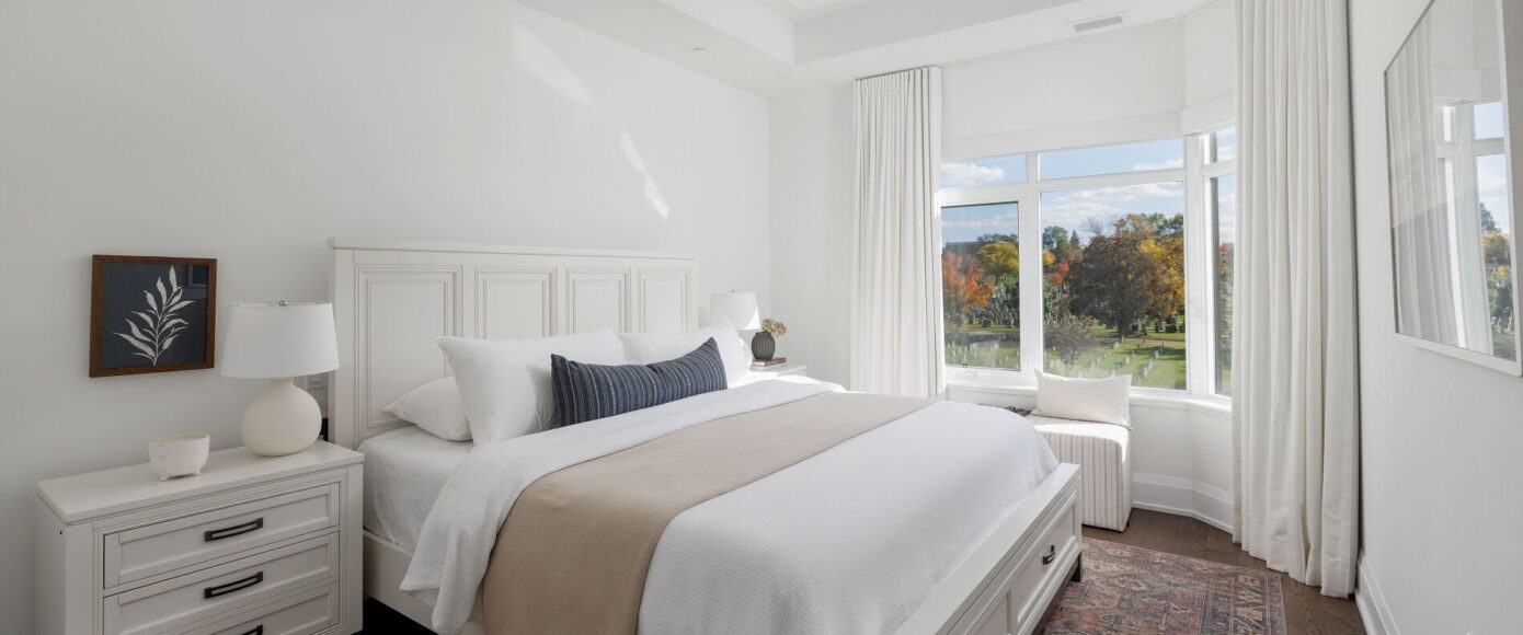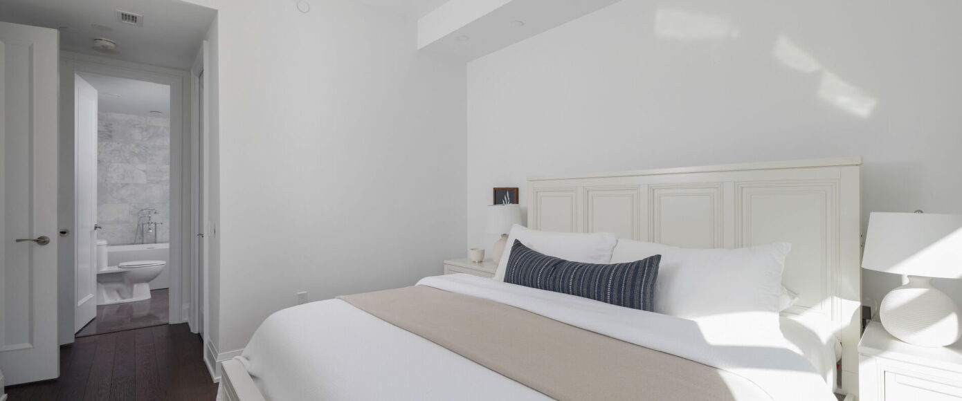 Throughout, engineered 5″ White Oak Gotham hardwood stretches under 10 ft ceilings and 8 ft doors, flowing seamlessly from room to room. While this suite is a showcase of natural light, ambient lighting has been elevated with pot lights on a custom scheme. In the primary ensuite, radiant heat underfoot, marble finishes, and a freestanding Azzura Carrera tub create a spa-like retreat. All bathrooms showcase marble counters and flooring. The desirable split bedroom layout includes a virtually soundproof den, ideal for remote work or peaceful calls, and offers the kind of versatile space rarely found in a condo setting.