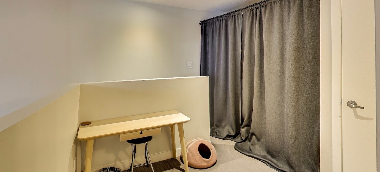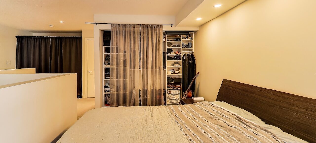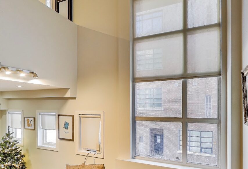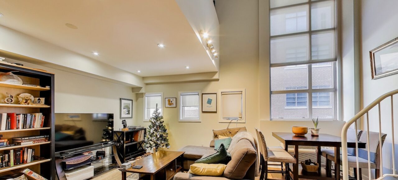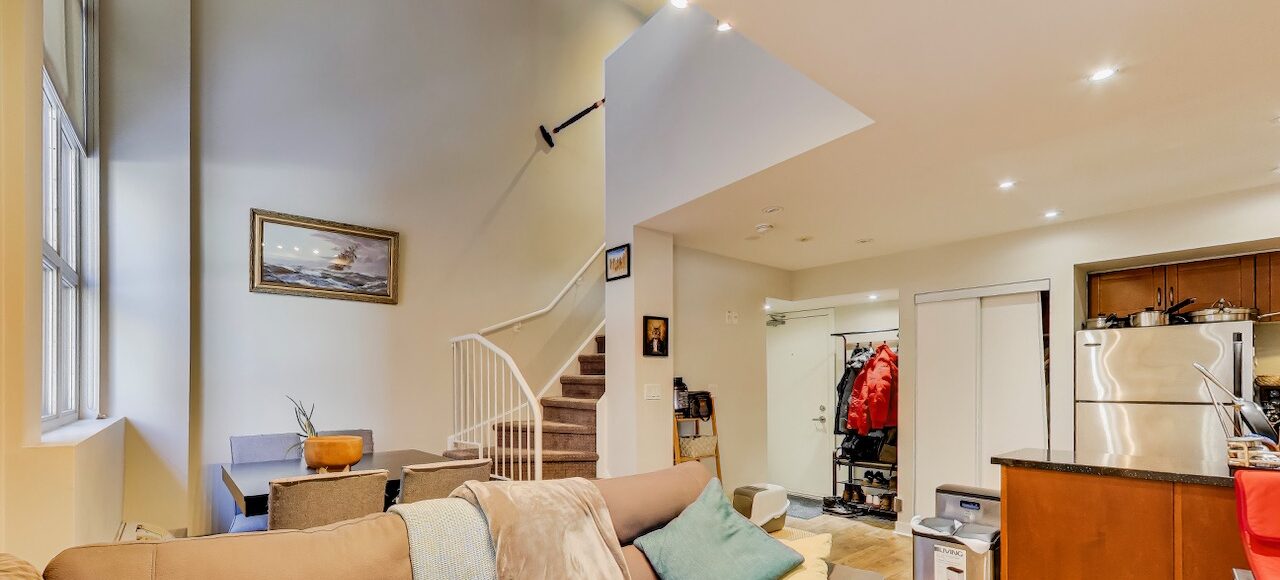 Rare two-storey loft featuring dramatic 17-foot ceilings and floor-to-ceiling south-facing windows that flood the space with natural light. This ~700+ sq ft suite at The Earl Lofts offers true hard-loft character with an open main living level and a lofted upper floor overlooking the living space below.The main level features an open living and dining area with soaring ceiling height and expansive windows. Upstairs, the lofted bedroom level offers a spacious retreat with room for a home office or reading area.