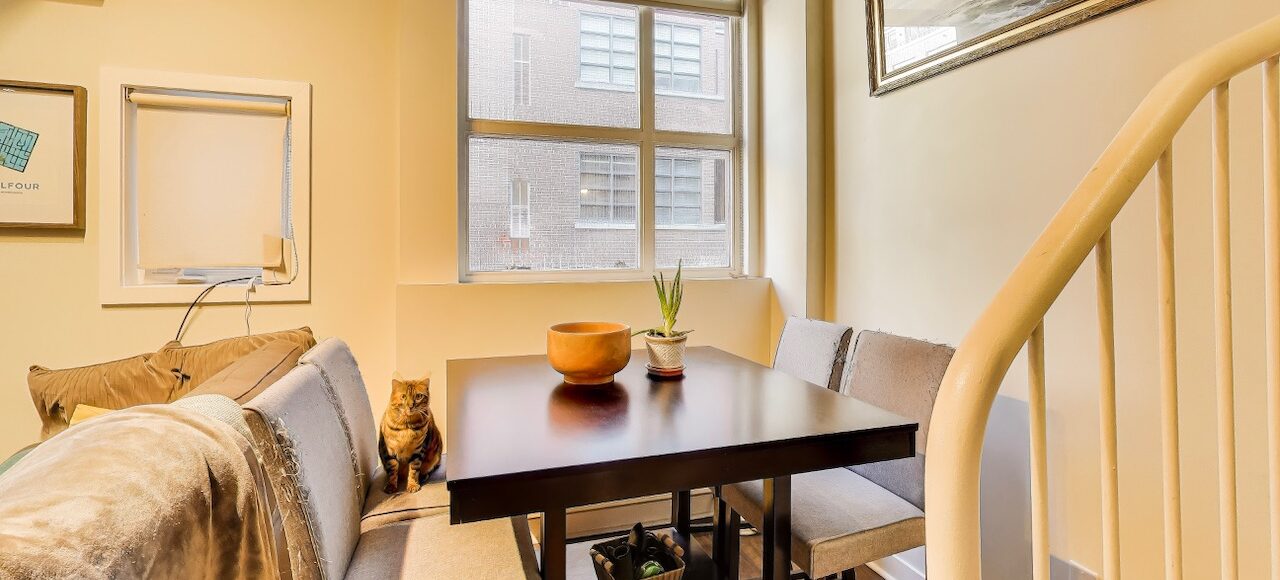 The dining area is defined yet connected and overlooks the main living area. Ideal for both casual meals and entertaining. Easily accomodates a full dining table while maintaining the lofts open concept flow.
