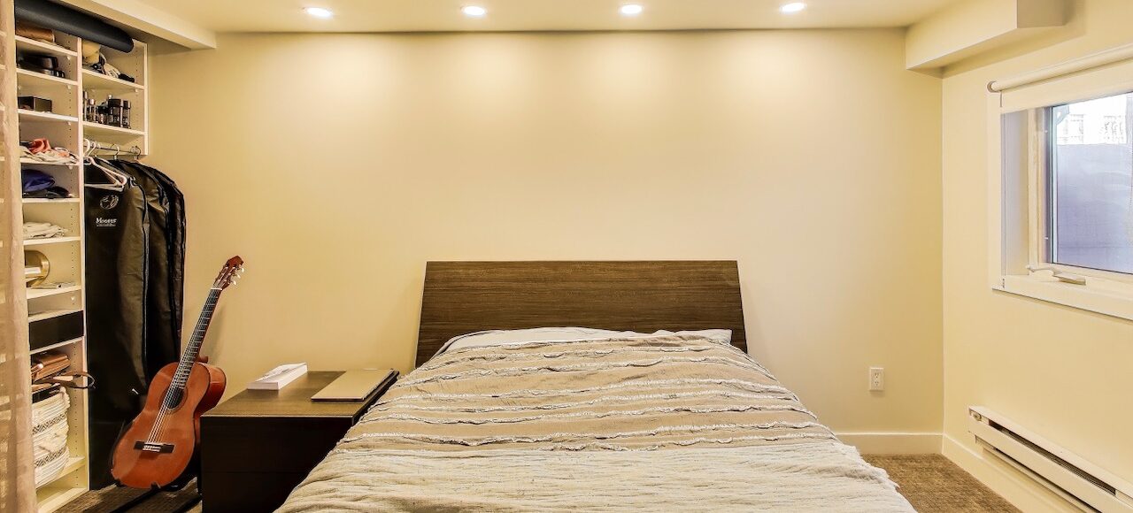 The primary bedroom is generously sized and offers excellent closet space and a peaceful atmosphere. The room comfortably accomodates a large bed and additional furnishings, creating a comfortable and private place to unwind.