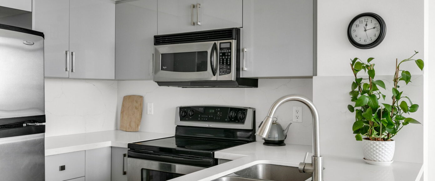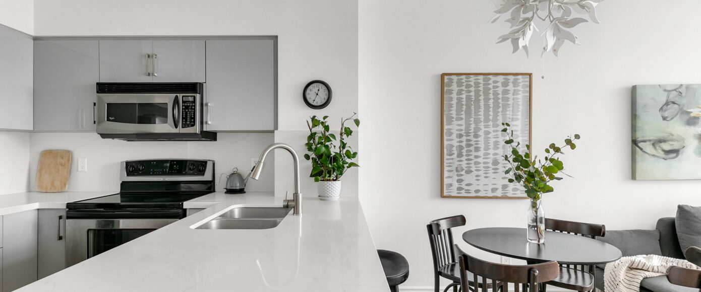 Kitchen | Cabinetry and hardware, double undermount sink & faucet, quartz countertop with wall fall edge feature & matching backsplash