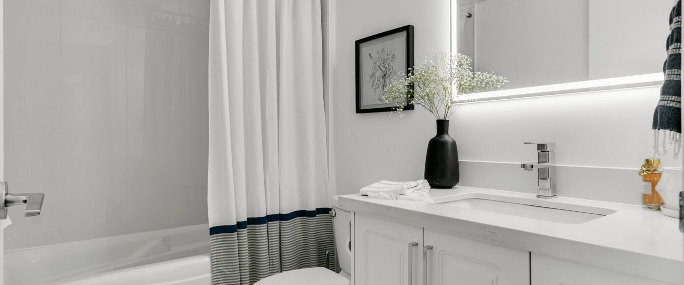 Bathroom | Tub/shower combo w/ Moen showerhead, toilet, vanity, sink & faucet, LED mirror, quartz countertops