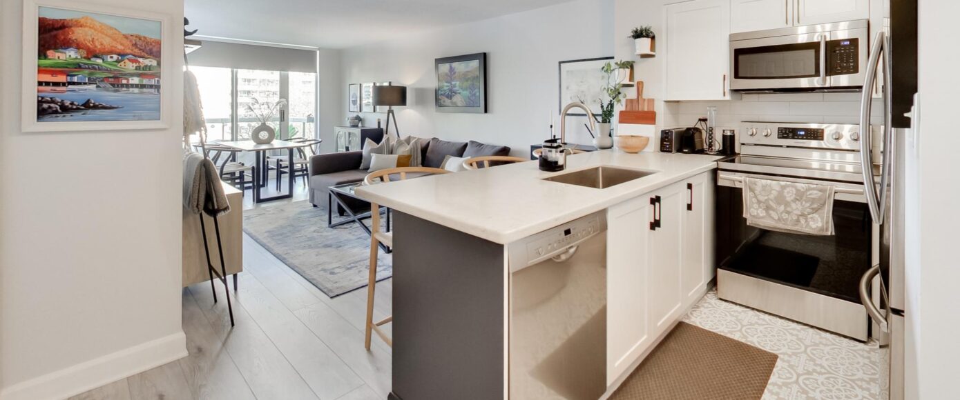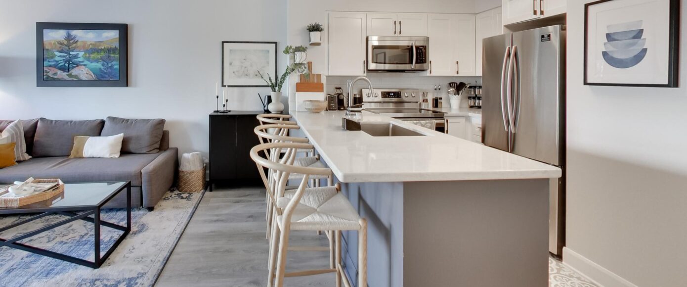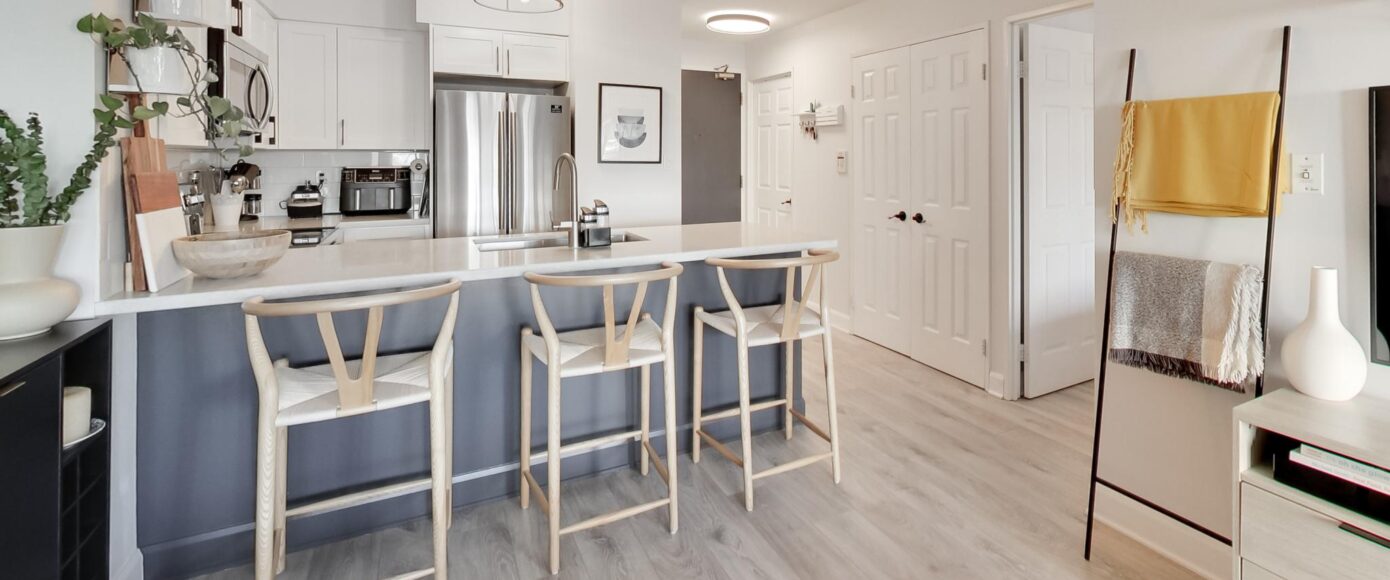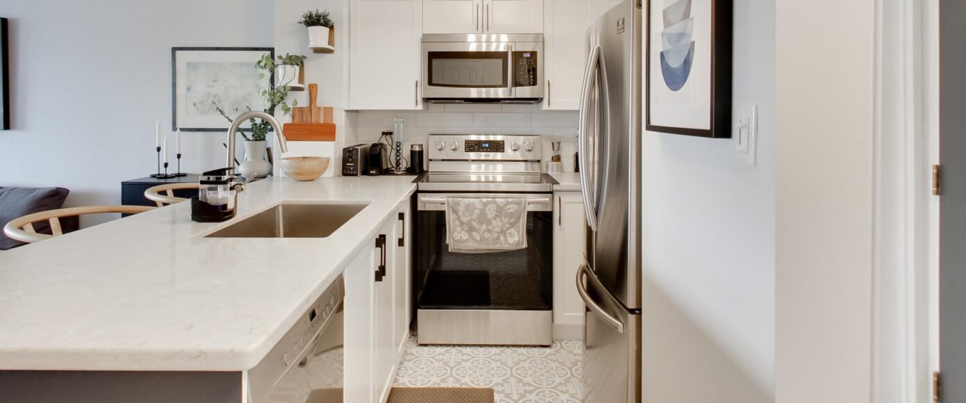 Kitchen Main | 8’10” x 7’10” | Tiled floors, Full-Size Stainless Steel Appliances, Ample Storage, Plenty of Counter Space, Breakfast Bar