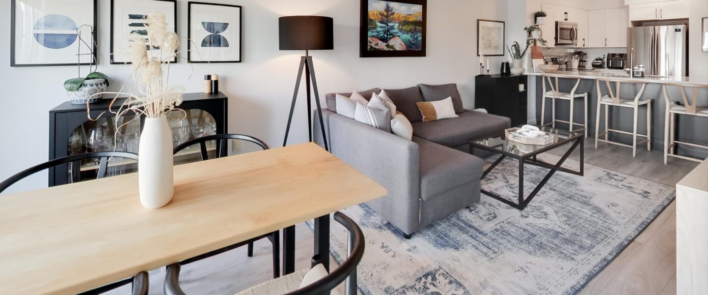 Living Main | 10’5” x 14’4” | Vinyl floors, Open Concept, Combined with Dining, Walk-out to balcony