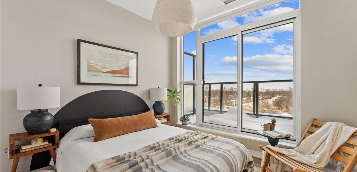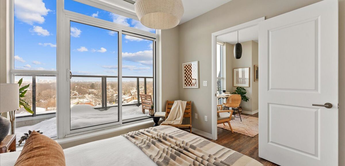 Inside, the suite features light oak engineered hardwood floors, recessed lighting, custom closets and contemporary finishes throughout. Wall-to-wall windows frame panoramic north views, while two walk-outs to the private terrace stretches the full width of the suite, becoming a natural extension of your living space. A front-row seat to treetop views and open skies, perfect for slow coffee mornings, al fresco dinners, or unwinding at the end of the day. The bedroom is thoughtfully positioned at the opposite end of the broad floor plan, offering a rare sense of separation and welcomed privacy from the main living space. Paired with a modern, generously sized four-piece bath and a versatile den, function is beautifully married with flow.