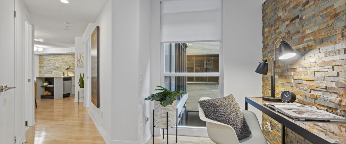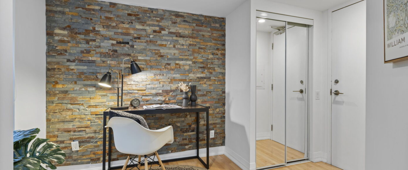 Spacious entryway with storage, a home office den with a beautiful stone wall and a large window and a gracious entry into the main living space. Huge open concept living and dining rooms with another stone feature wall. Chef’s kitchen with granite counters, an eating bar and good storage. Large principal bedroom big enough for a king-sized bed, walk-in closet and large windows overlooking green space with custom blinds.
