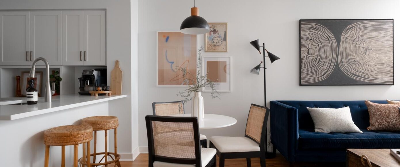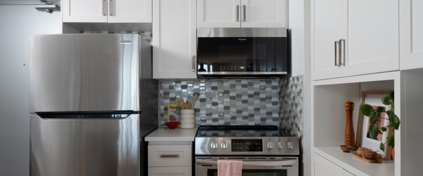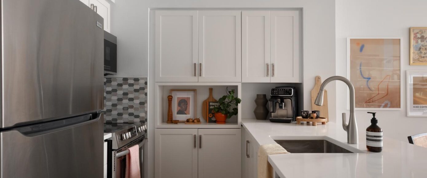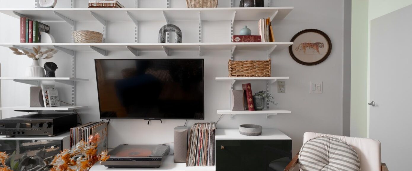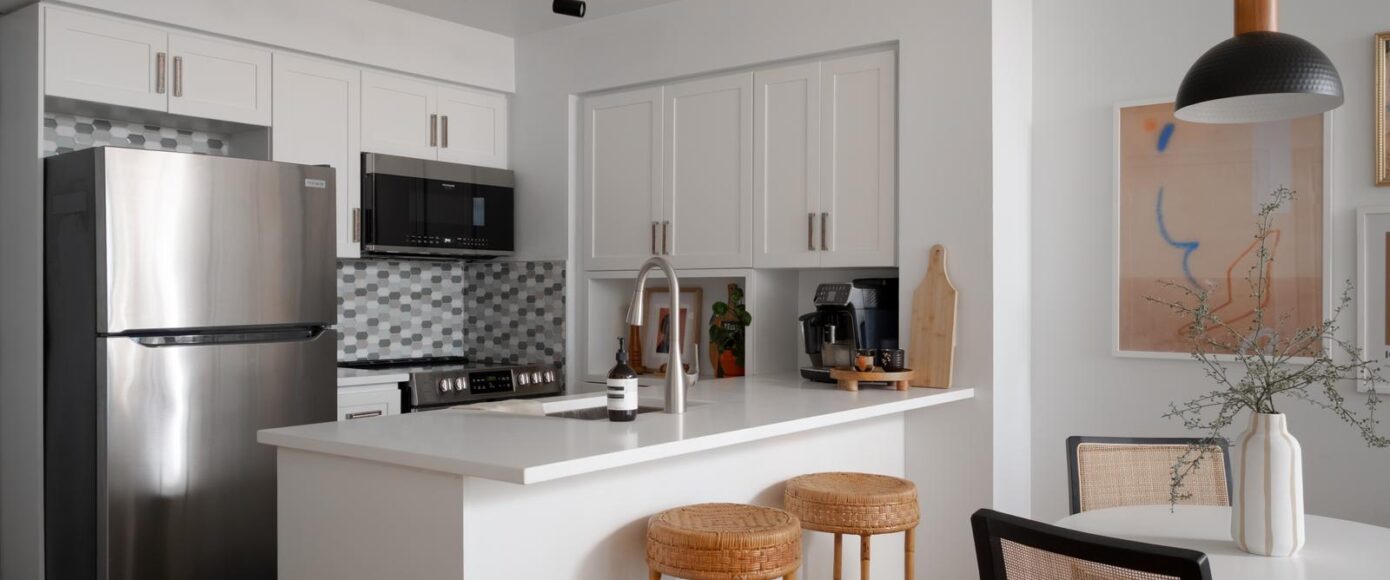 New floors lead you through an open-concept layout with a fully renovated kitchen, complete with new counters, cabinetry, newer stainless steel appliances, and a peninsula with breakfast bar seating. The living area includes custom built-in shelving and media storage, plus a walkout to an oversized balcony that floods the space with natural light — perfect for morning coffee or golden-hour sunsets.