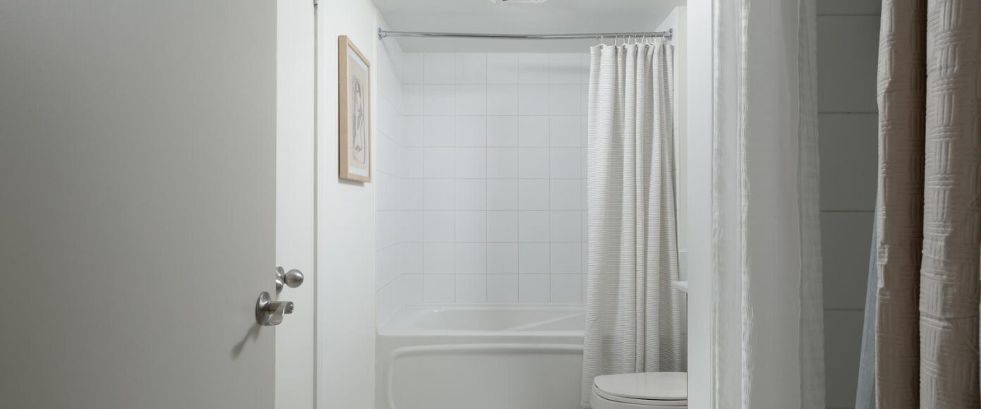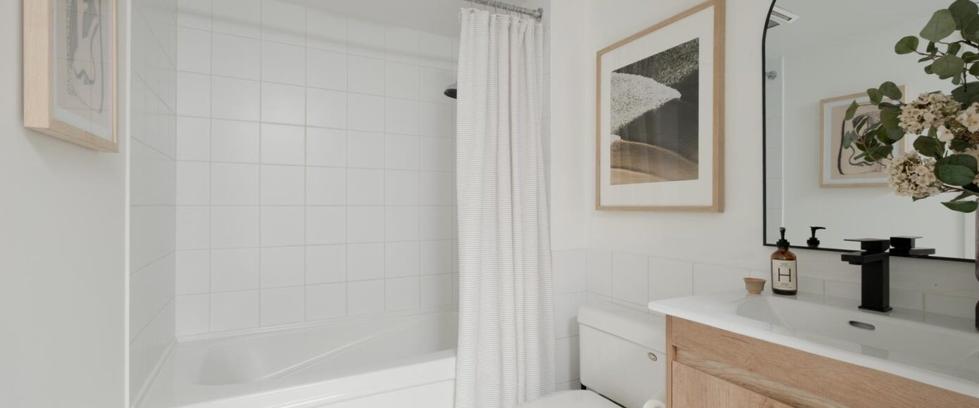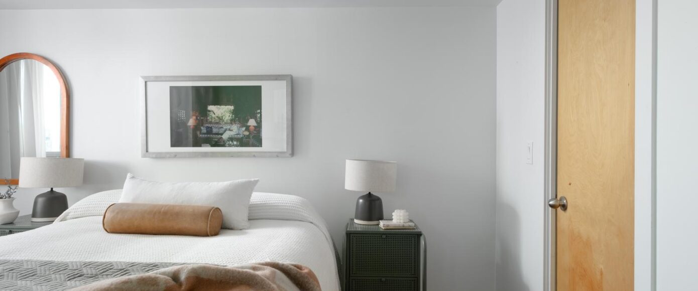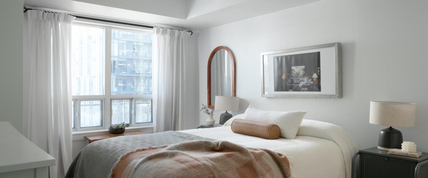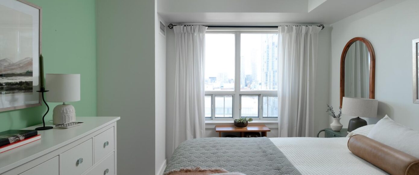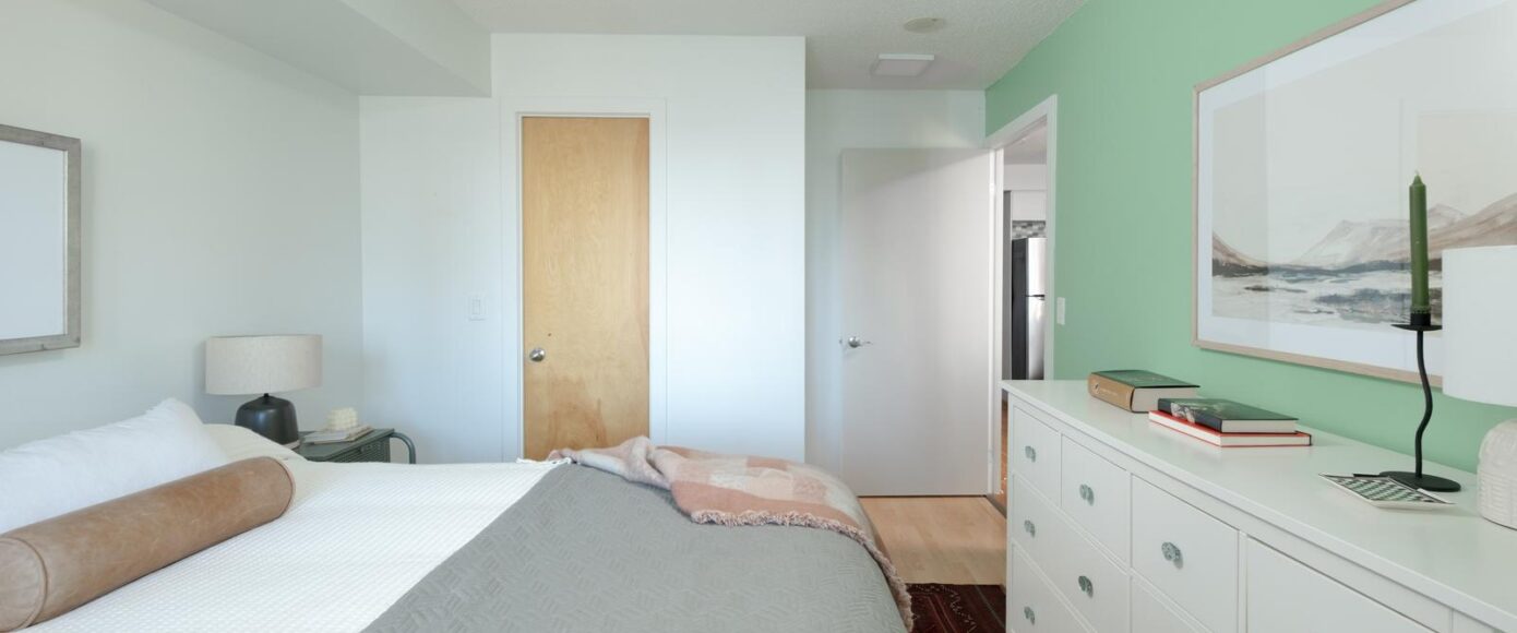 The bedroom is bright and spacious with a large window, walk-in closet, and room for a king-sized bed, side tables, and a dresser. The upgraded 5-piece bathroom includes both a tub and separate stand-up shower — a rare blend of space, storage, and function in a downtown one-bedroom.