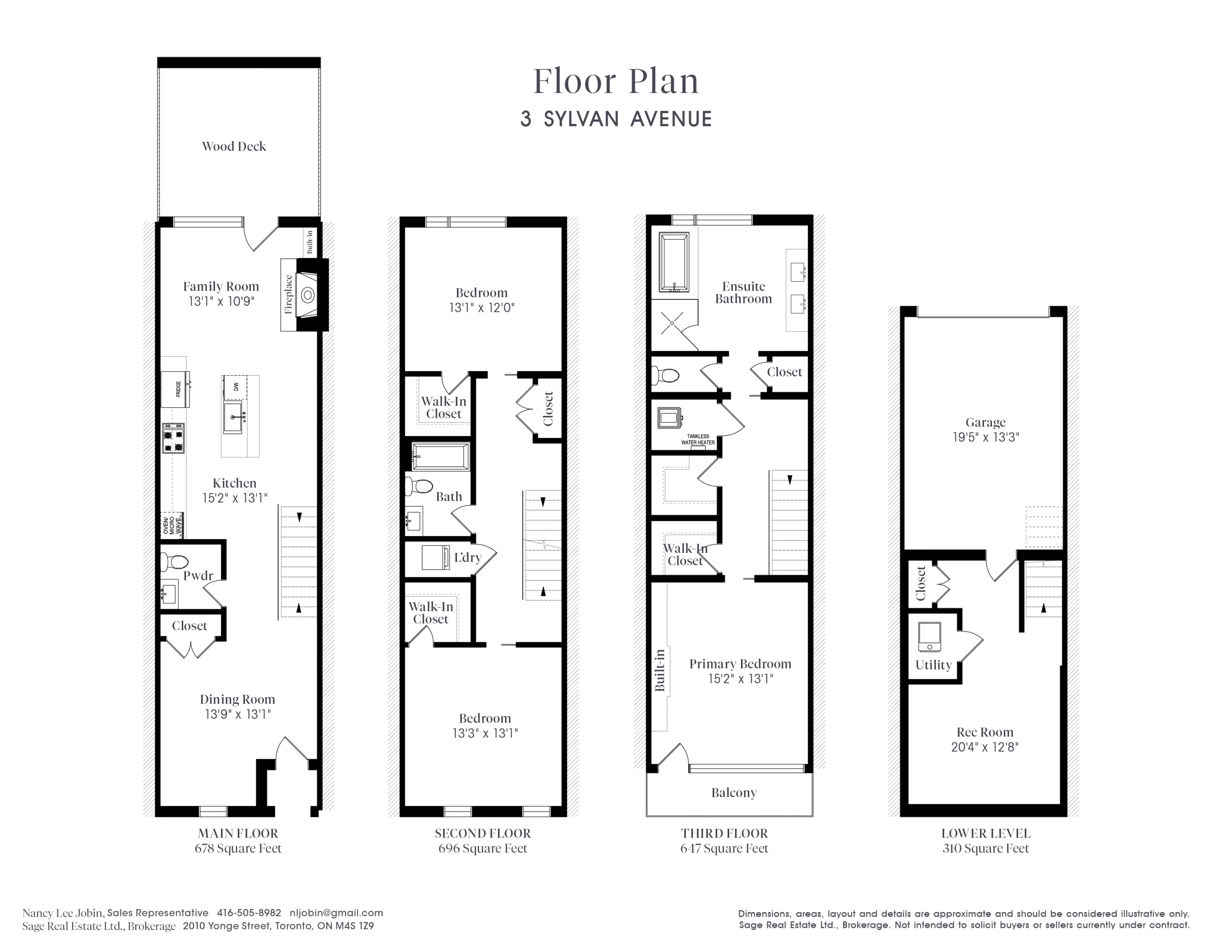 The second floor offers two spacious bedrooms with ample closets and natural light, plus a convenient laundry room and a sleek three-piece bath. The entire third floor is dedicated to the primary suite — a 650 SQFT retreat with custom built-ins, two walk-in closets, a spa-inspired ensuite with a soaker tub and separate water closet, and a balcony to unwind.