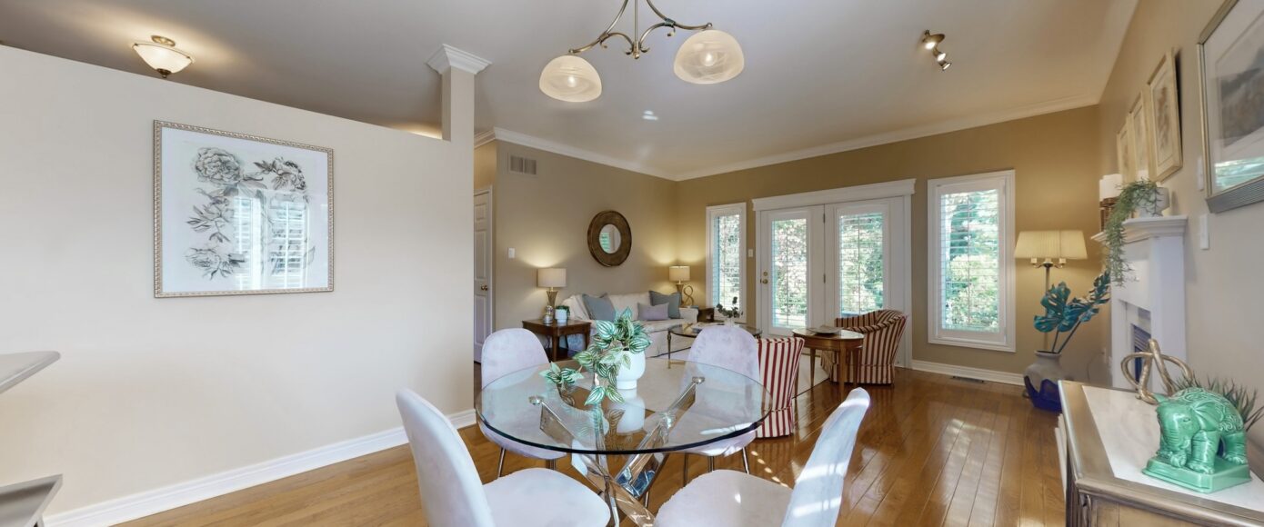 Step inside to discover a home designed to flow effortlessly from room to room, offering both elegance and practicality. The living room welcomes you with gleaming hardwood floors that extend throughout the main level, providing warmth and sophistication. A gas fireplace anchors the space, offering a cozy focal point and a perfect backdrop for relaxing evenings. Large windows fill the room with natural light and frame views of the private backyard. The living room opens seamlessly to the dining area, creating an open-concept space ideal for entertaining. Whether hosting intimate dinners or lively gatherings, this thoughtful layout makes entertaining effortless, and it connects directly to the heart of the home — the chef’s kitchen.