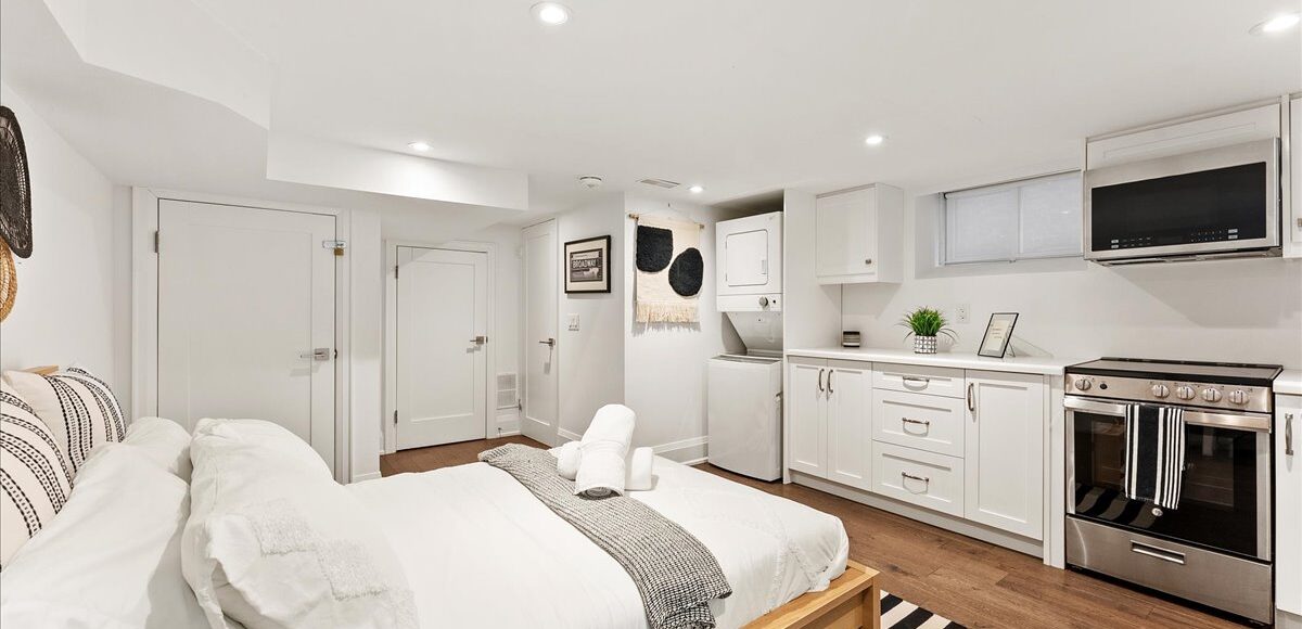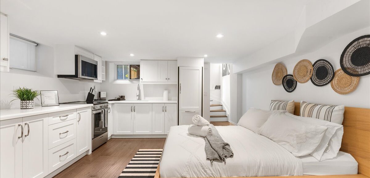 The lower level extends the home’s versatility even further. Down an impressively wide staircase, a spacious recreation room with a two-piece bath offers the perfect backdrop for movie nights, playtime, or a home gym. Beyond, a fully self-contained studio suite with its own private entrance offers endless possibilities, a retreat for adult children, a welcoming space for visiting family, a nanny suite, or an income-generating rental opportunity, all without compromising family living.