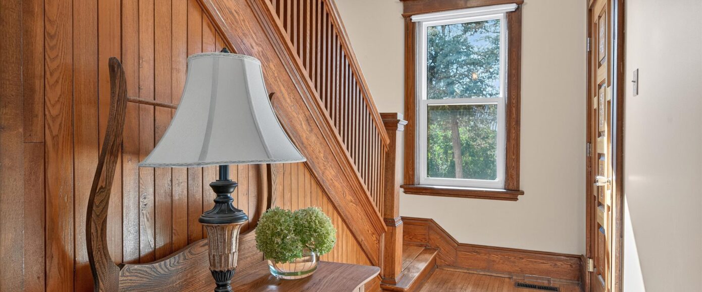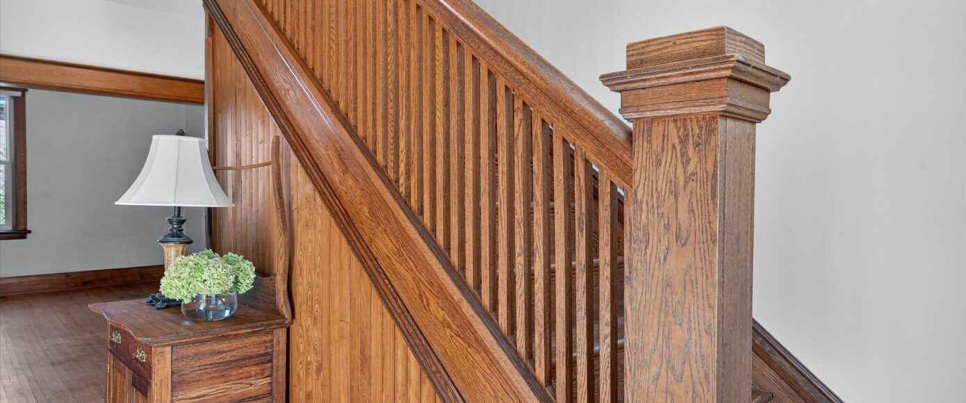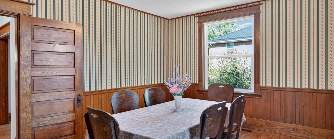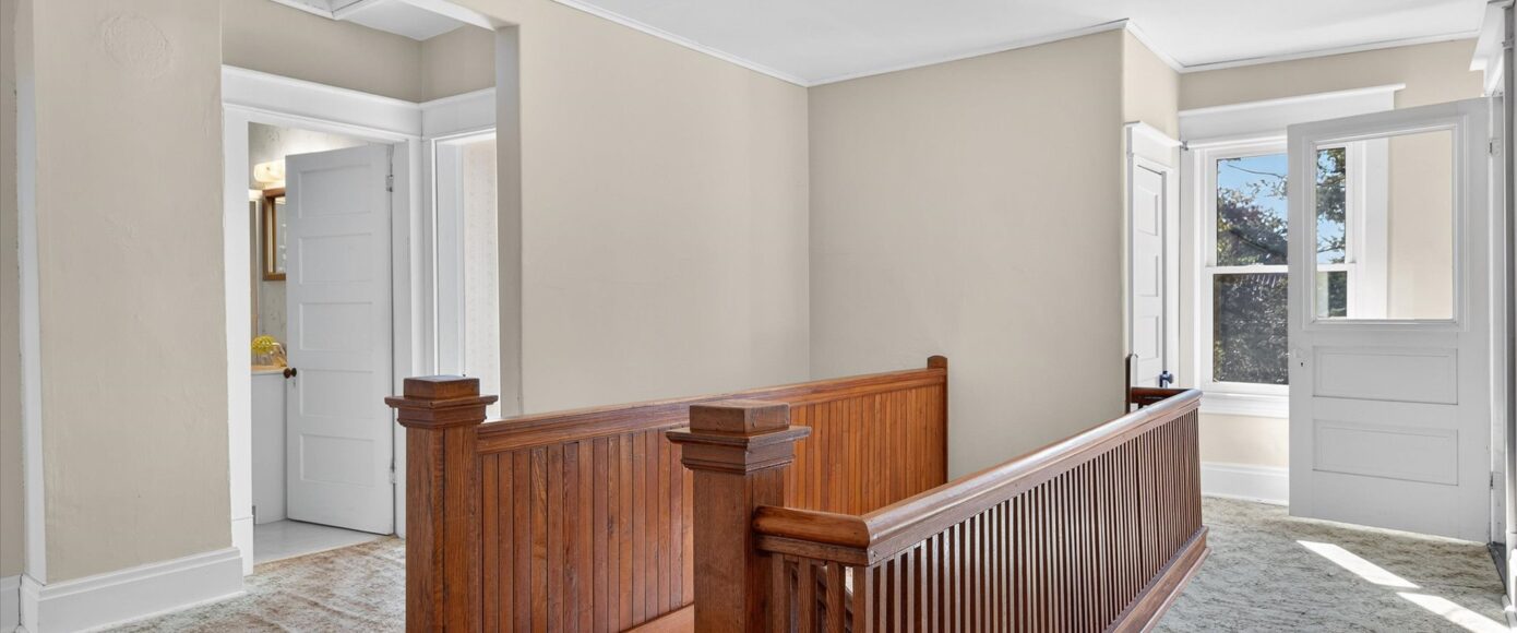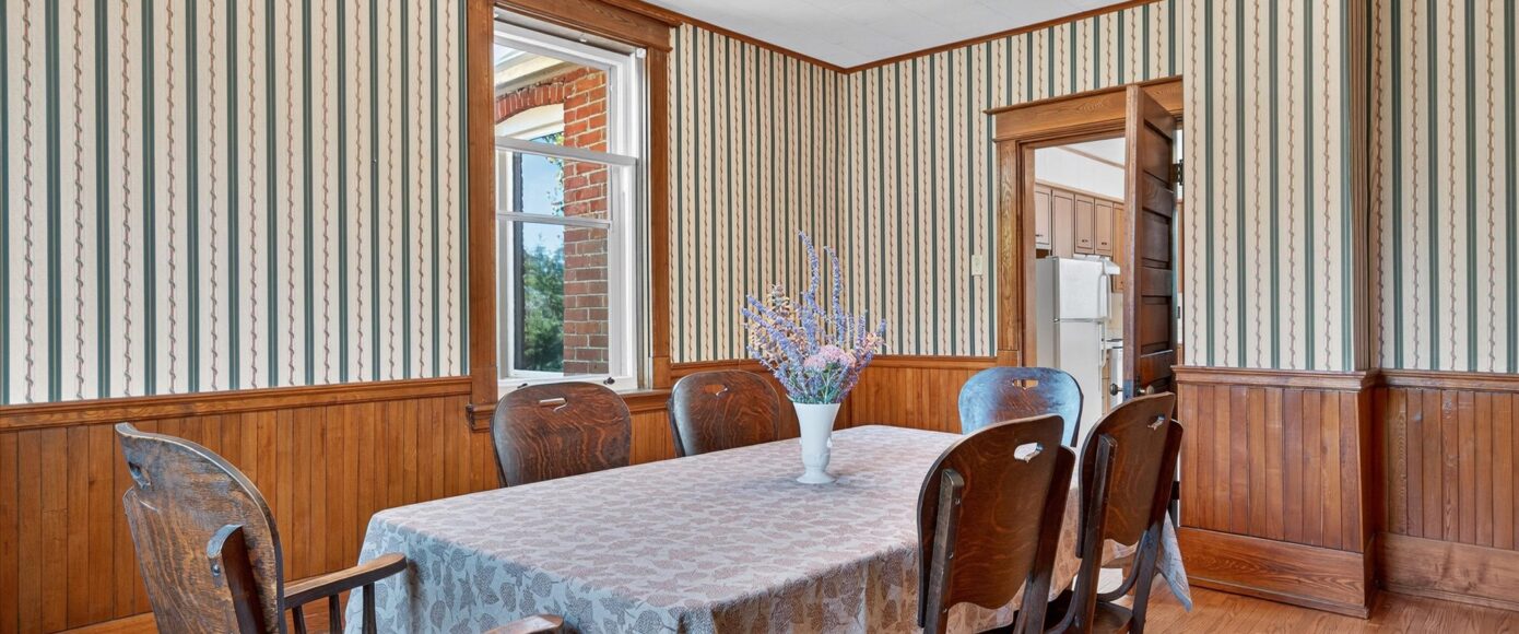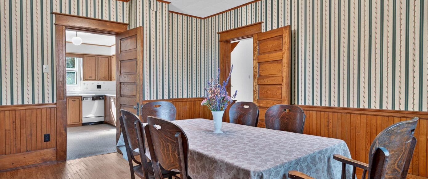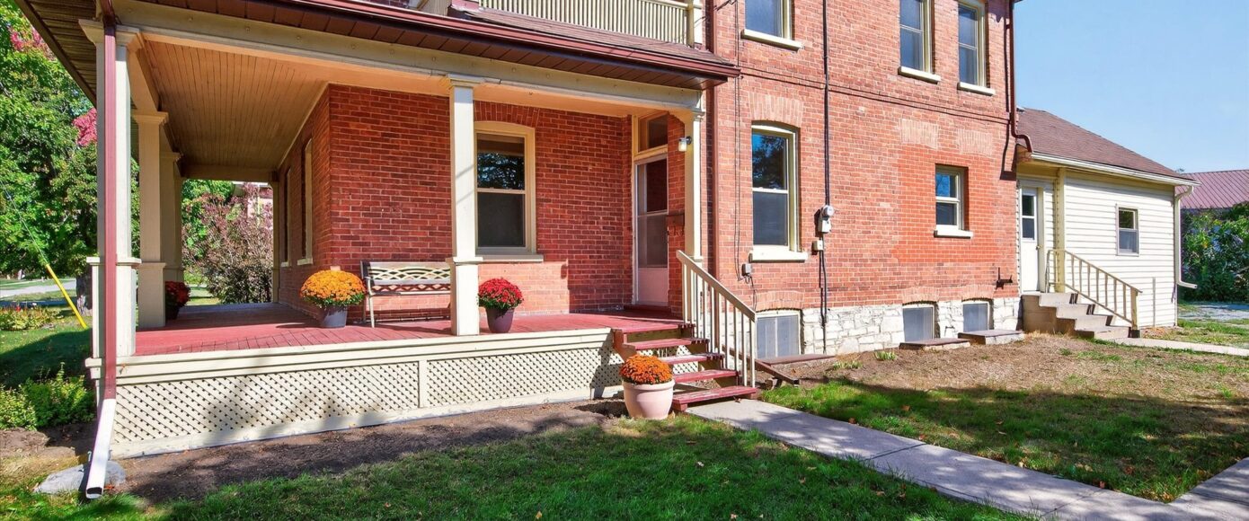 They don’t build them like this anymore…really they don’t. This five-bedroom, two-story brick home is for the discerning buyer that has an appreciation for history, craftmanship, quality and a lifestyle only a home of prominence in a small town can offer. Driving or walking down the street, this much-loved long-time family home commands your attention. Cars slow down, people walk and stare. It demands attention with its expansive front windows, long two-sided front porch and the quaint more-than-charming mini-barn stable at the side. Five good-sized bedrooms each with one or two tall and wide windows. Two very much out-of-date bathrooms, a second floor open porch ideal for snoozing on those hot summer nights, hidden pine sub floors and, get ready…a set of back stairs!! Reopen the stairs when you renovate the 60’s kitchen and watch your kids run up the front and down the back! The front hall is impressive with its oak stairs, banister and wainscotting.