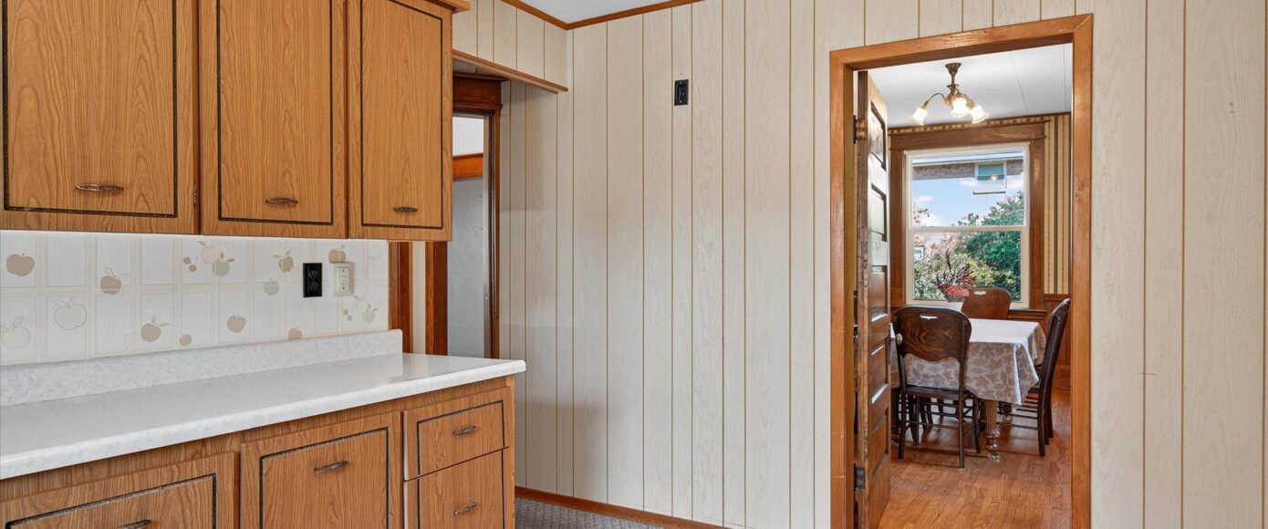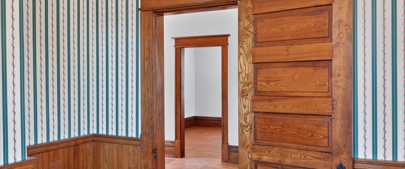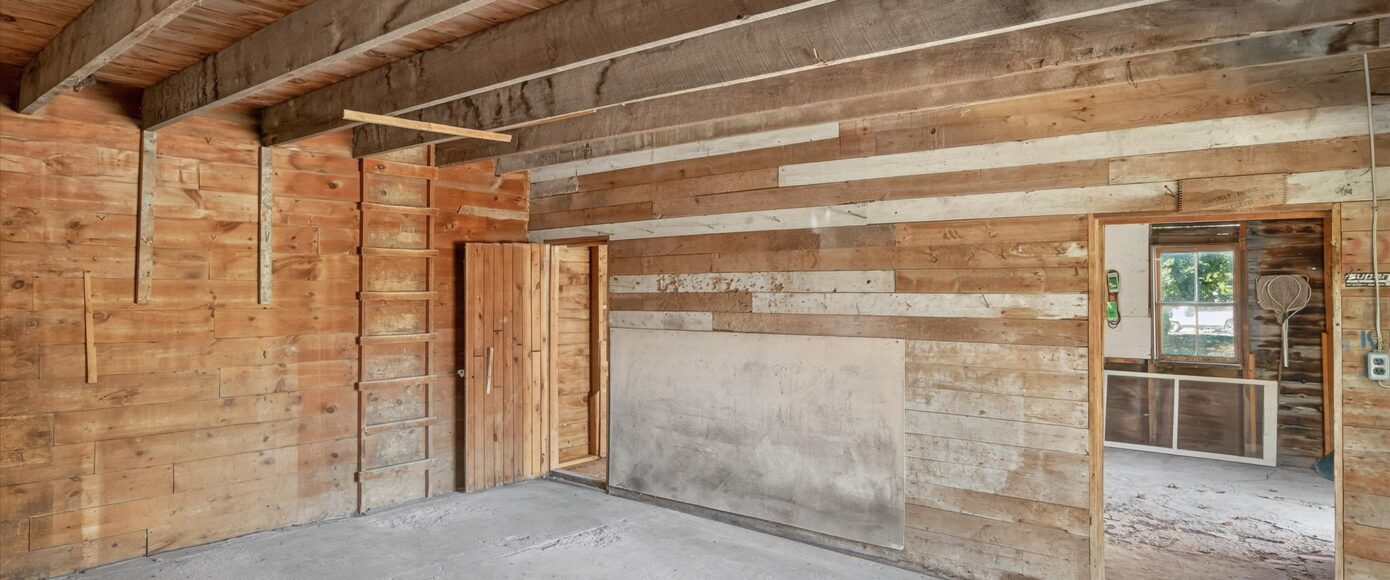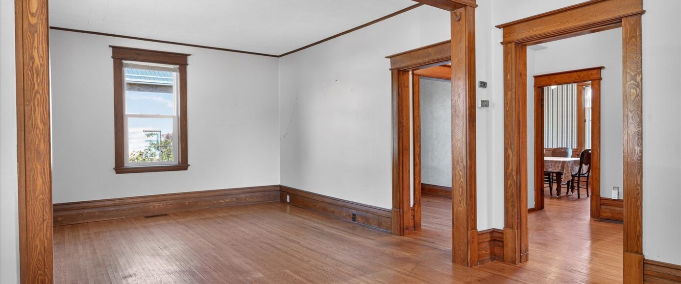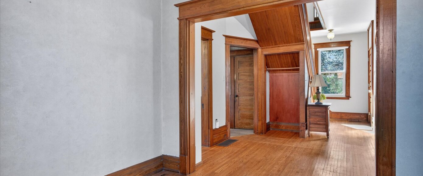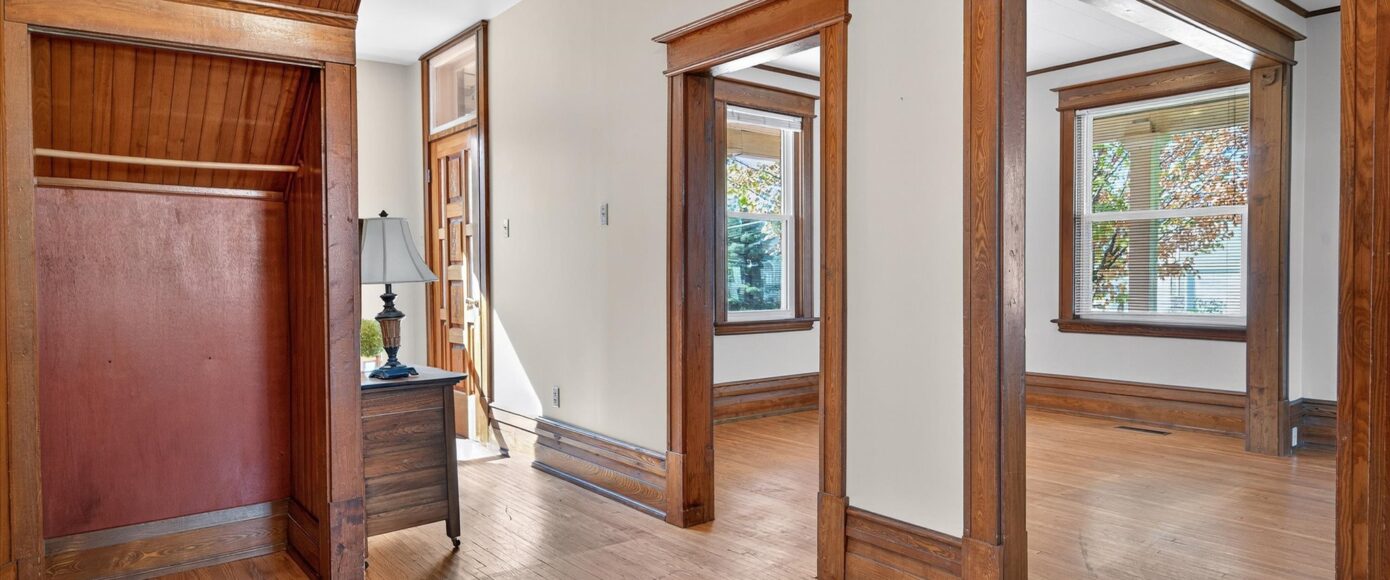 They don’t build them like this anymore…really they don’t. This five-bedroom, two-story brick home is for the discerning buyer that has an appreciation for history, craftmanship, quality and a lifestyle only a home of prominence in a small town can offer. Driving or walking down the street, this much-loved long-time family home commands your attention. Cars slow down, people walk and stare. It demands attention with its expansive front windows, long two-sided front porch and the quaint more-than-charming mini-barn stable at the side. Five good-sized bedrooms each with one or two tall and wide windows. Two very much out-of-date bathrooms, a second floor open porch ideal for snoozing on those hot summer nights, hidden pine sub floors and, get ready…a set of back stairs!! Reopen the stairs when you renovate the 60’s kitchen and watch your kids run up the front and down the back! The front hall is impressive with its oak stairs, banister and wainscotting.