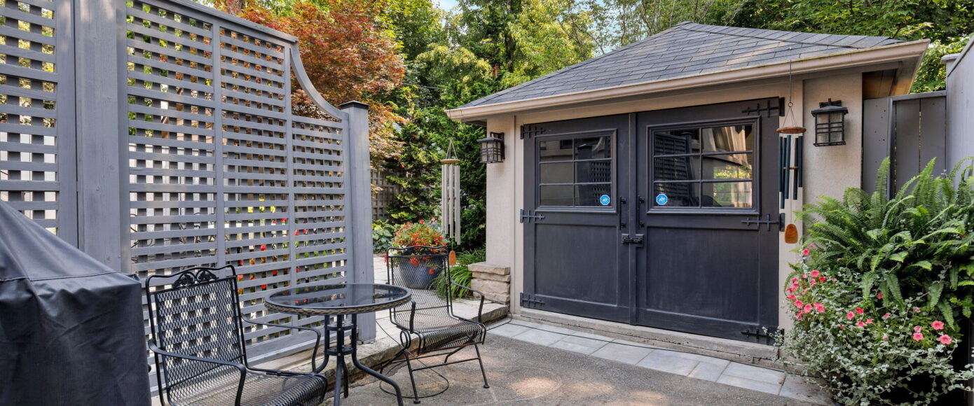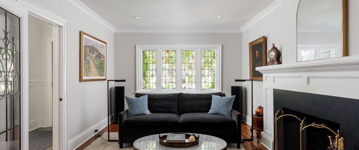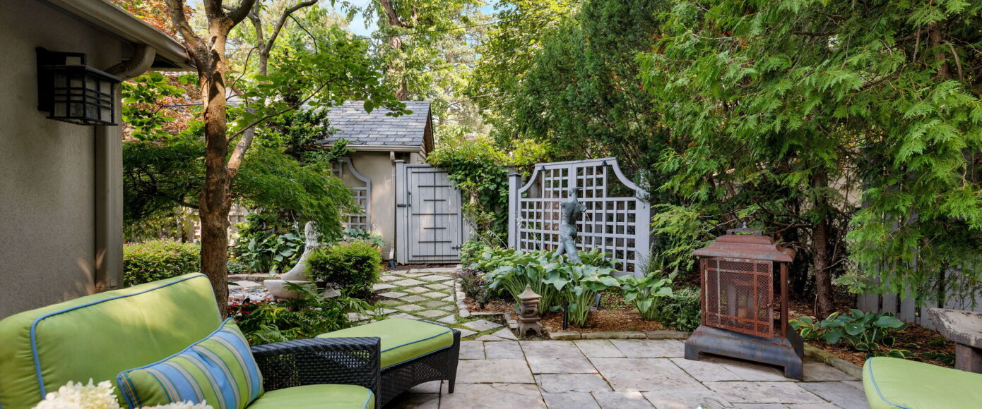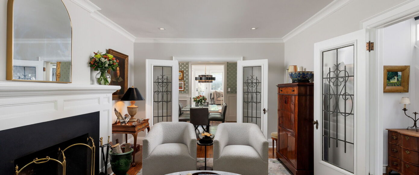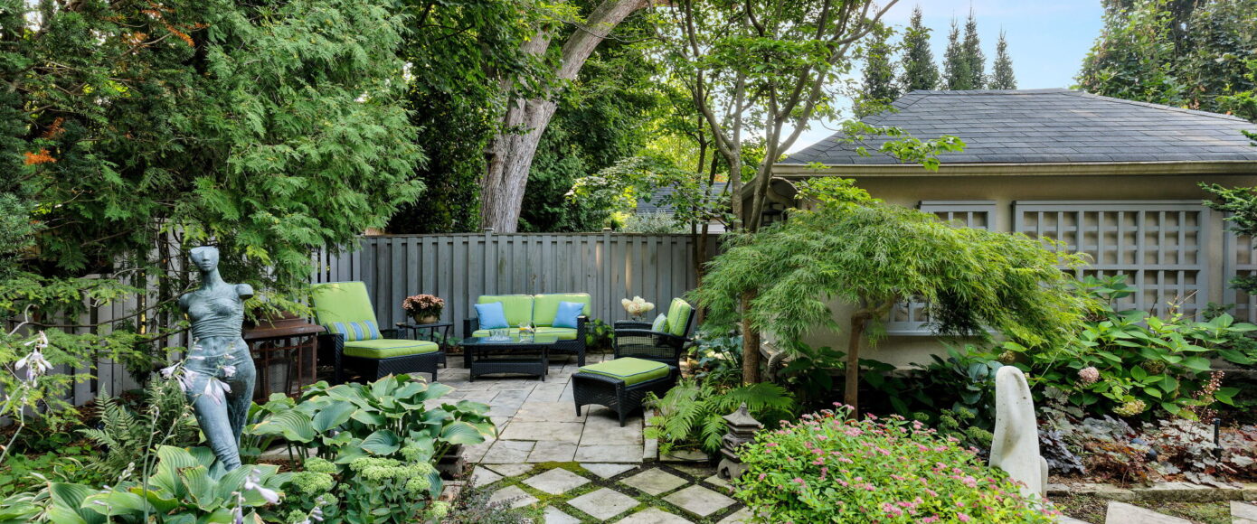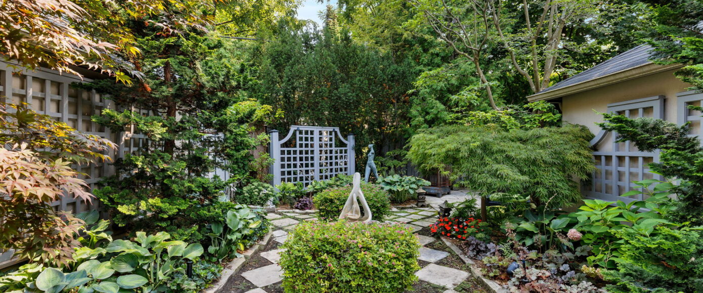 Inside, the home blends historic charm with thoughtful modern updates. Stained and leaded glass windows, crown moulding, and a marble-surround fireplace evoke traditional craftsmanship, while French doors lead to a cozy dining room surrounded by wainscotting. The updated kitchen, fitted with Italian Carrera marble and a full suite of luxury appliances, looks to the family room, where a skylight and garden views create an atmosphere of light and ease. A walkout extends the living space outdoors to the stone patio and private entertaining area where you will find vibrant gardens complete with a water feature.